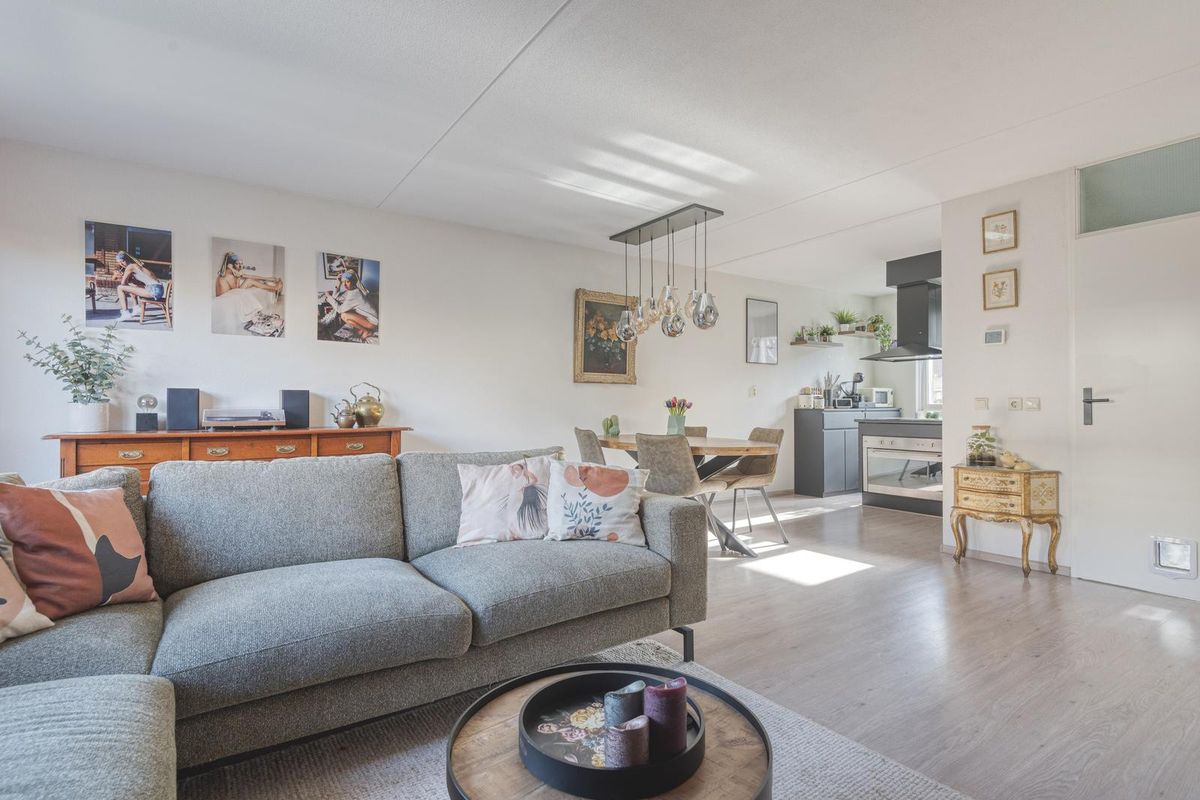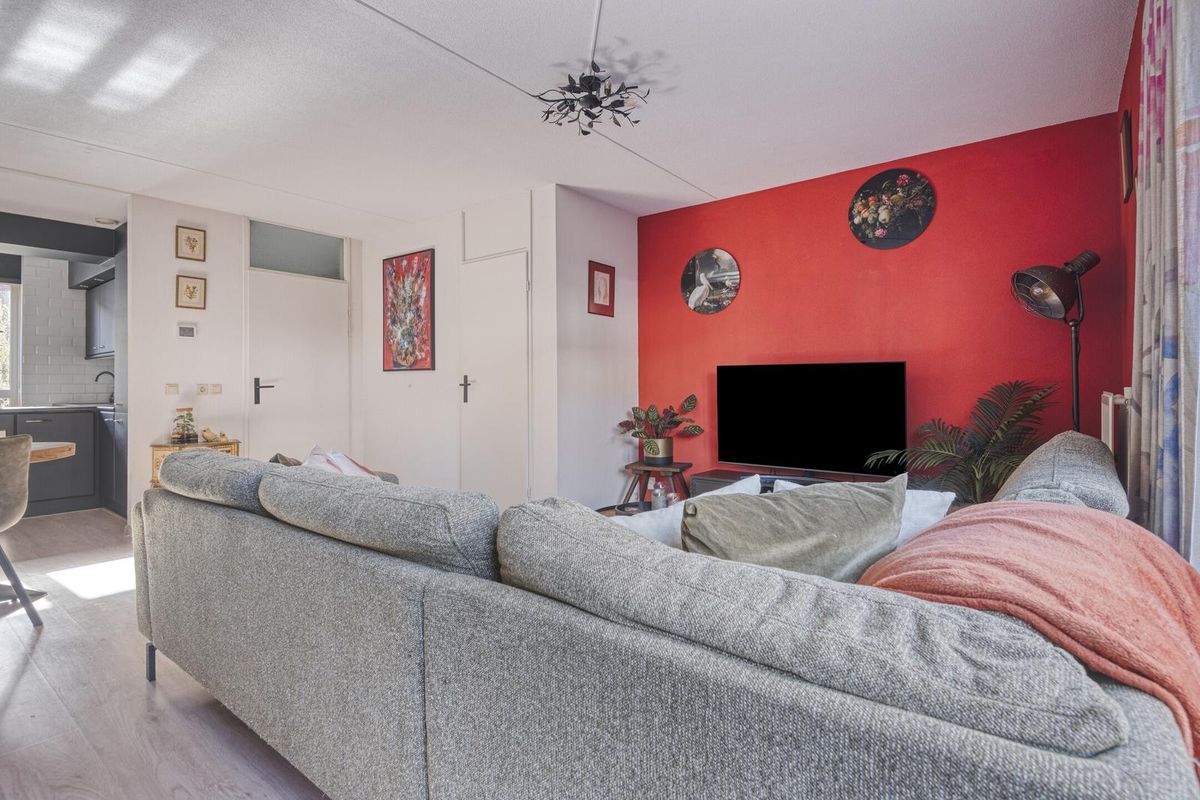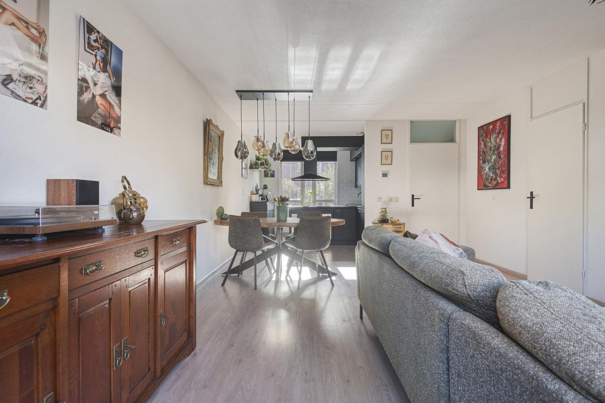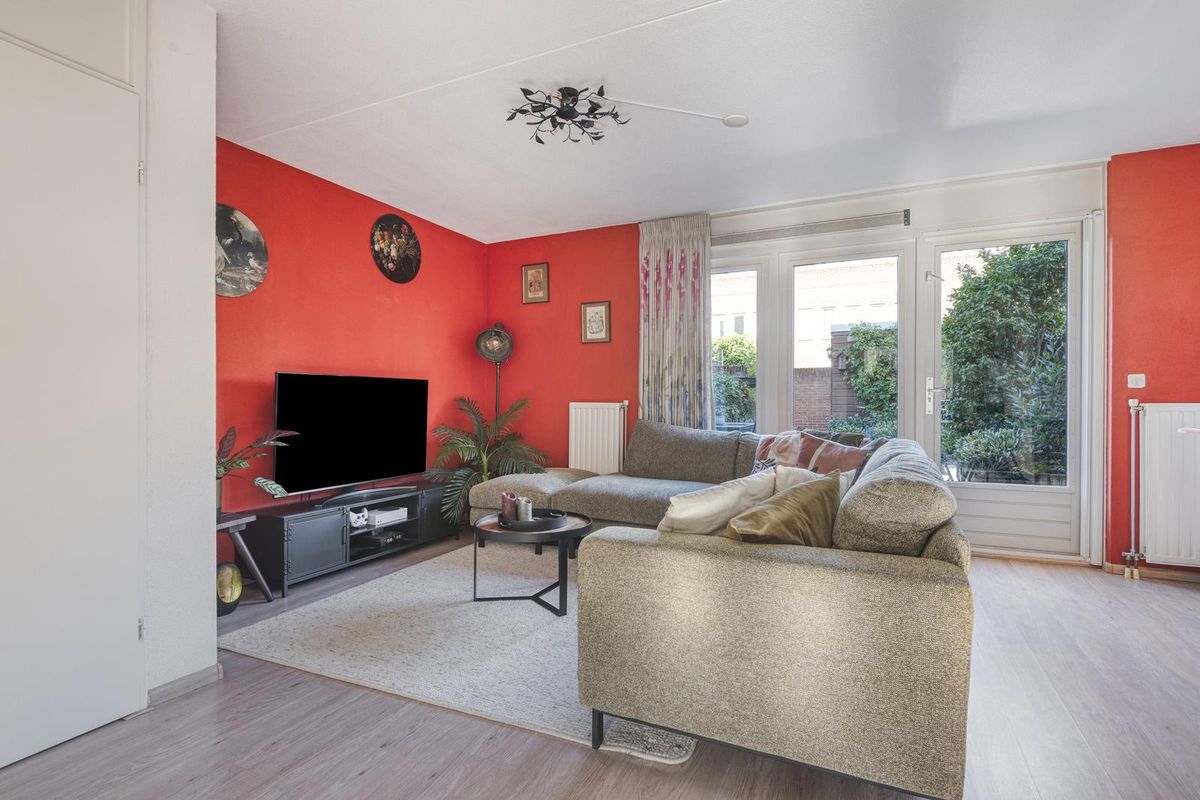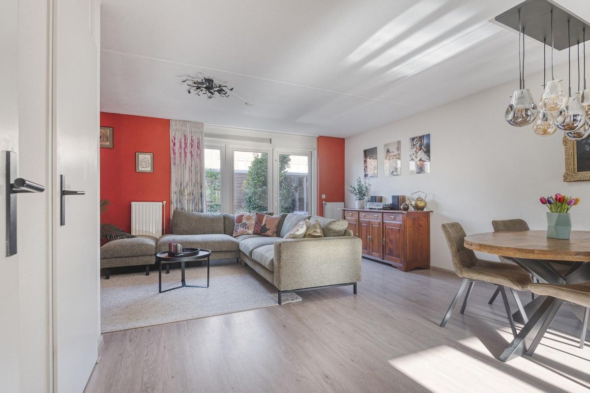 De woonkamer is circa 26,5 m² groot. De woonkamer beschikt over een vaste kast onder de trap. Vanuit de woonkamer is via een tuindeur (met een hordeur) de achtertuin te bereiken.