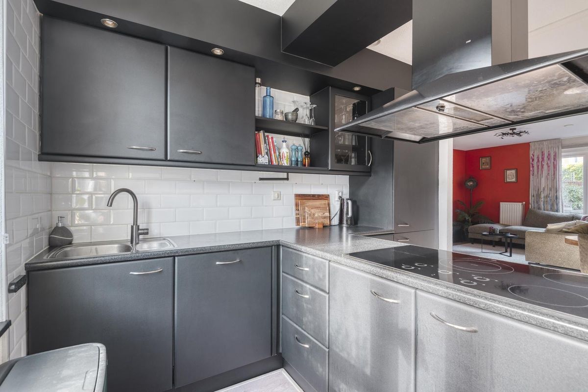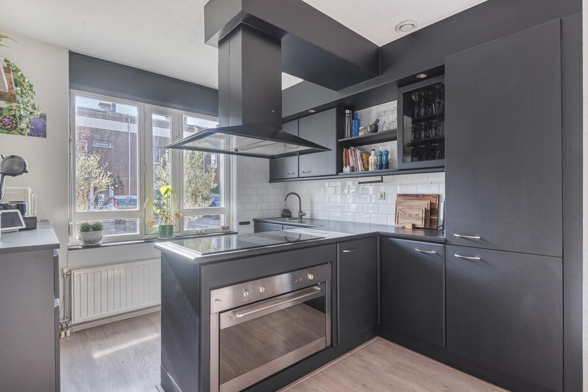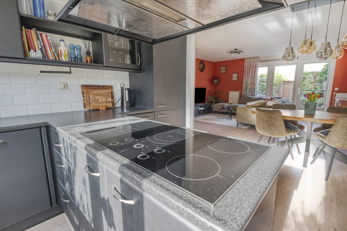 De aan de voorzijde gelegen open keuken heeft een T-keukenblok met anderhalve spoelbak, een zespits inductiekookplaat, een afzuigkap, een heteluchtoven, een koelkast, een vier laden vriezer en een vaatwasmachine. De woonkamer en keuken zijn voorzien van een laminaatvloer.
