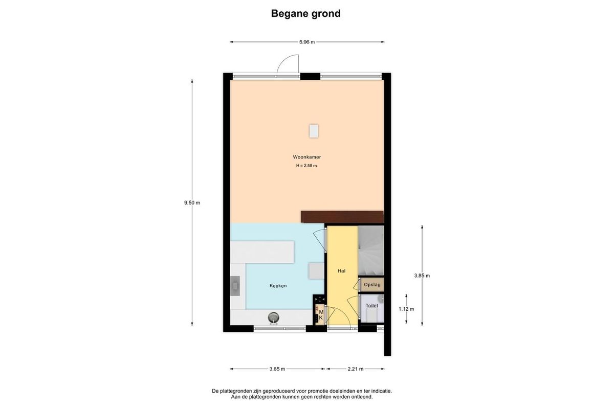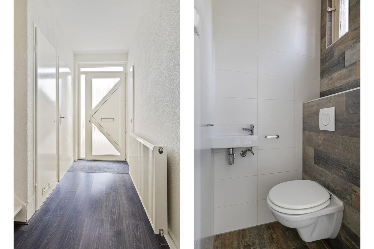 Begane grond: entree hal met een meterkast voorzien van 8 moderne groepen. Rechts van de hal bevindt zich de toiletruimte met zwevend toilet en fonteintje. Hiernaast is een praktische bergkast. Einde van de hal biedt toegang tot de woonkamer/keuken. Aan de voorzijde bevindt zich de in 2019 geplaatste keuken met een losse koel/-vriescombinatie, 6-pits gaskookplaat met afzuigkap, combimagnetron en vaatwasser. Aan de achterzijde de ruime living met een sfeervolle open haard en toegang tot de achtertuin.