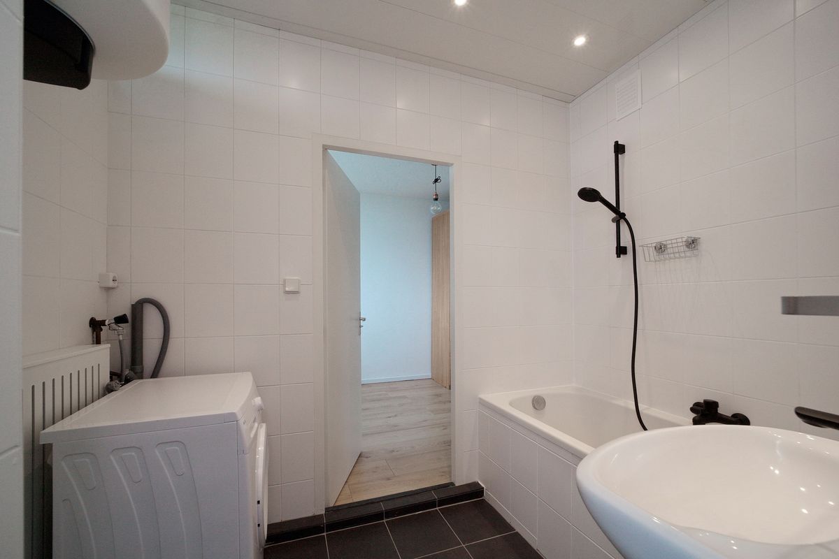 Vanuit de slaapkamer en de keuken is er toegang tot de badkamer met wastafel, spiegel met verlichting, ligbad met douche, wasmachine aansluiting en de boiler.