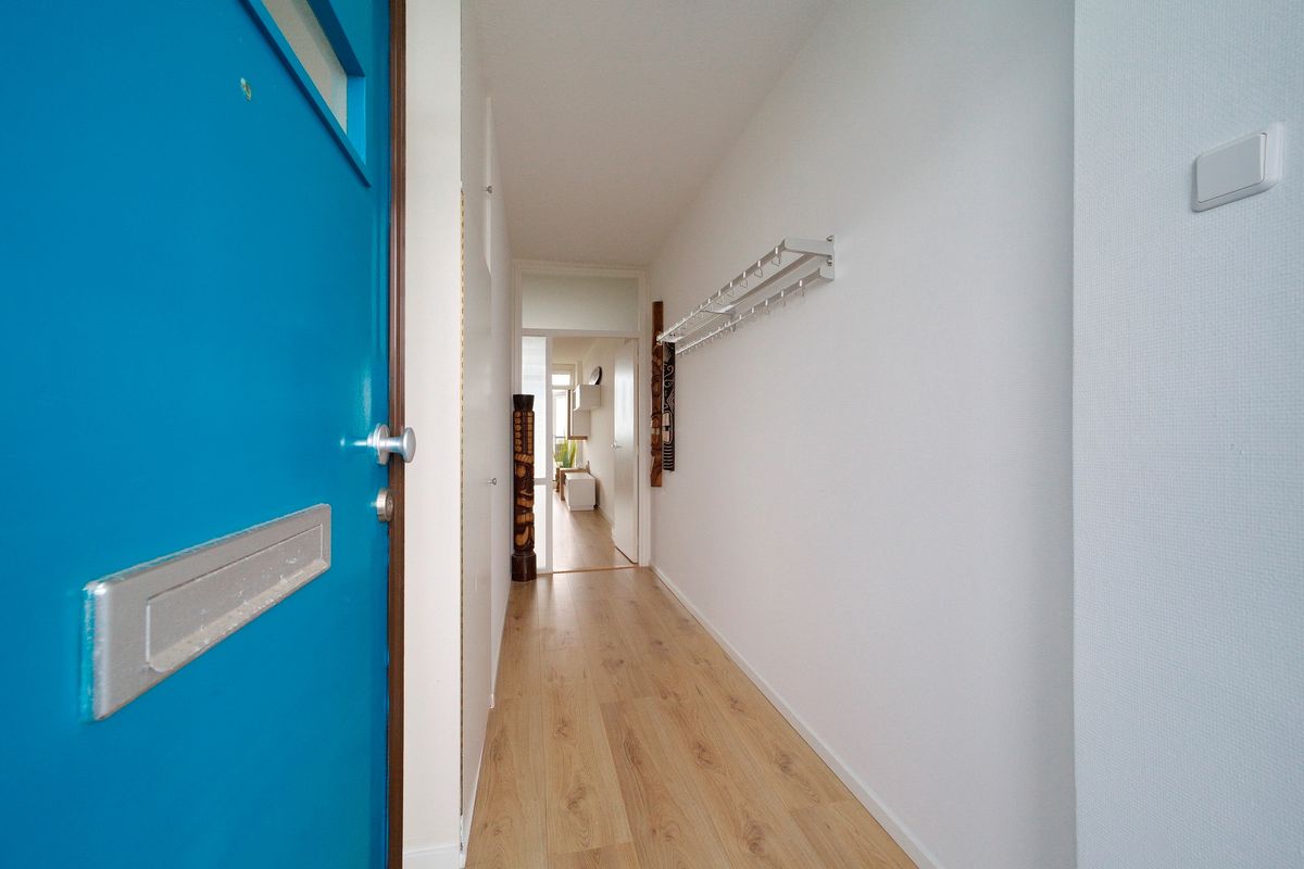 Entree woning vanaf de galerij, gang met meterkast en toegang tot de keuken en de woonkamer.