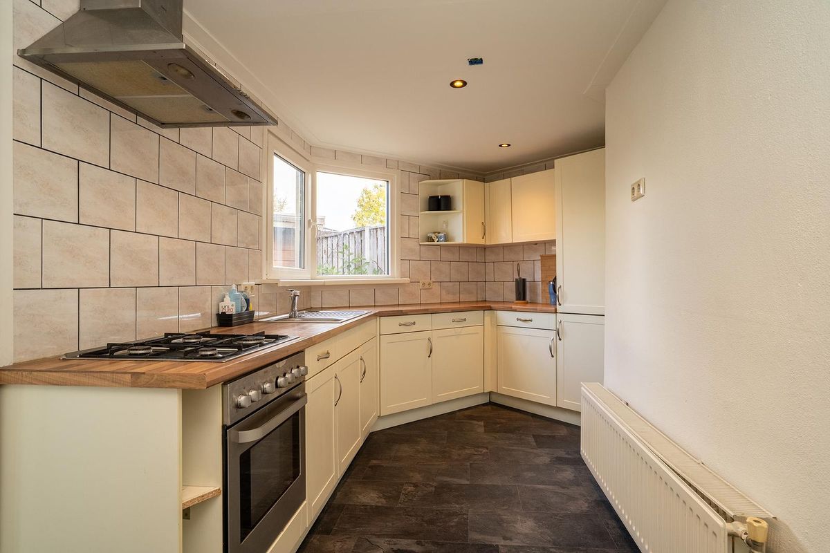 Begane grond: Binnenkomen doen we via de voordeur aan de zijkant van de woning, toegankelijk vanuit de zijtuin. Vanuit de hal stap je direct de keuken in. De keuken is voorzien van diverse inbouwapparatuur, waaronder een gasfornuis, oven en koelkast. Dankzij het grote raam is er veel natuurlijk licht, wat zorgt voor een prettige en open sfeer.