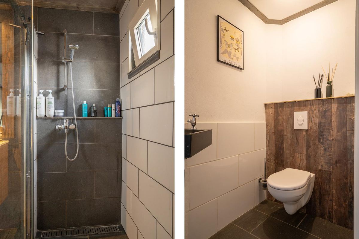 Aangrenzend aan de keuken bevindt zich de badkamer. Deze is volledig betegeld, praktisch ingedeeld en voorzien van een inloopdouche, een wastafelmeubel met opbergruimte en een spiegel. Het toilet bevindt zich eveneens in deze ruimte, maar is dankzij een eigen deur toch apart. Ook de wasmachineaansluiting vind je hier.