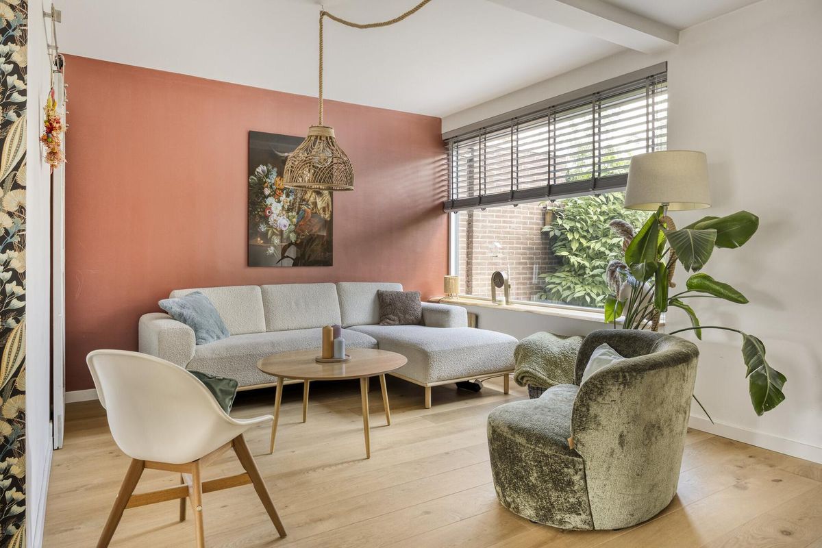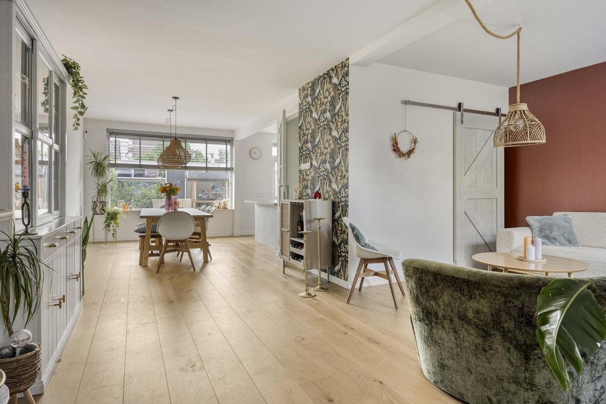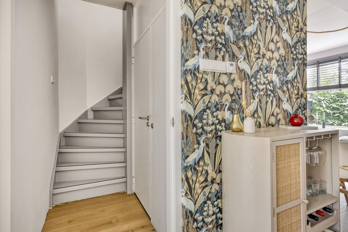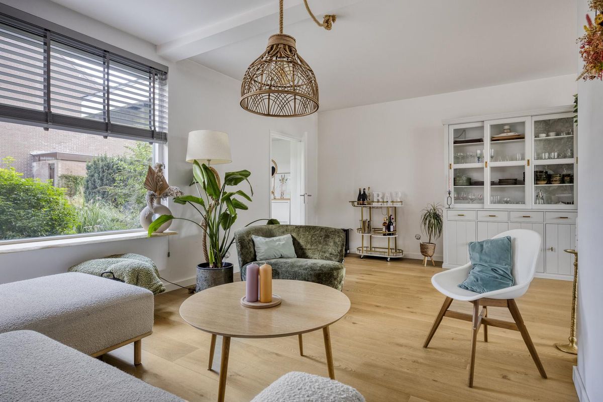 Via de verzorgde voortuin betreedt u de hal van de woning, waar voldoende ruimte is om jassen en schoenen op te bergen. De sfeervolle woonkamer is voorzien van vloerverwarming, een prachtige massief eikenhouten vloer en strak gestucte wanden. De praktische trapkast is stijlvol afgewerkt met een houten schuifdeur.