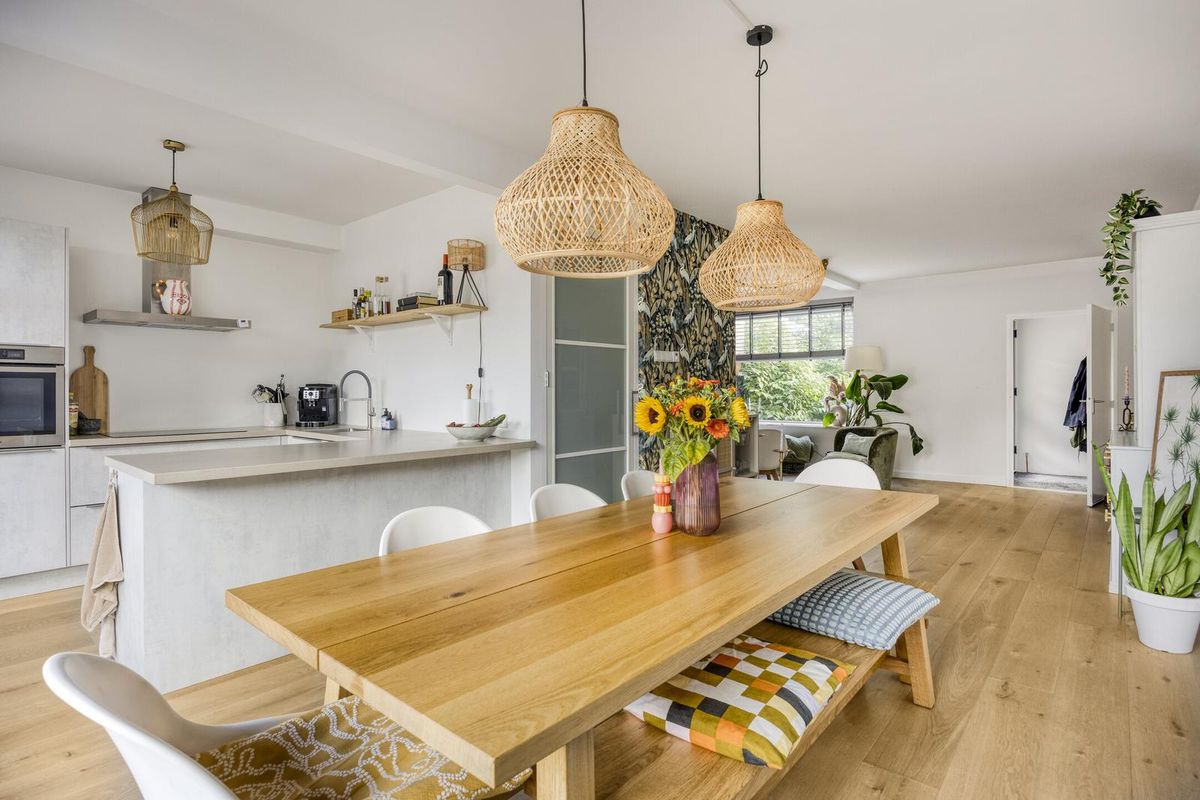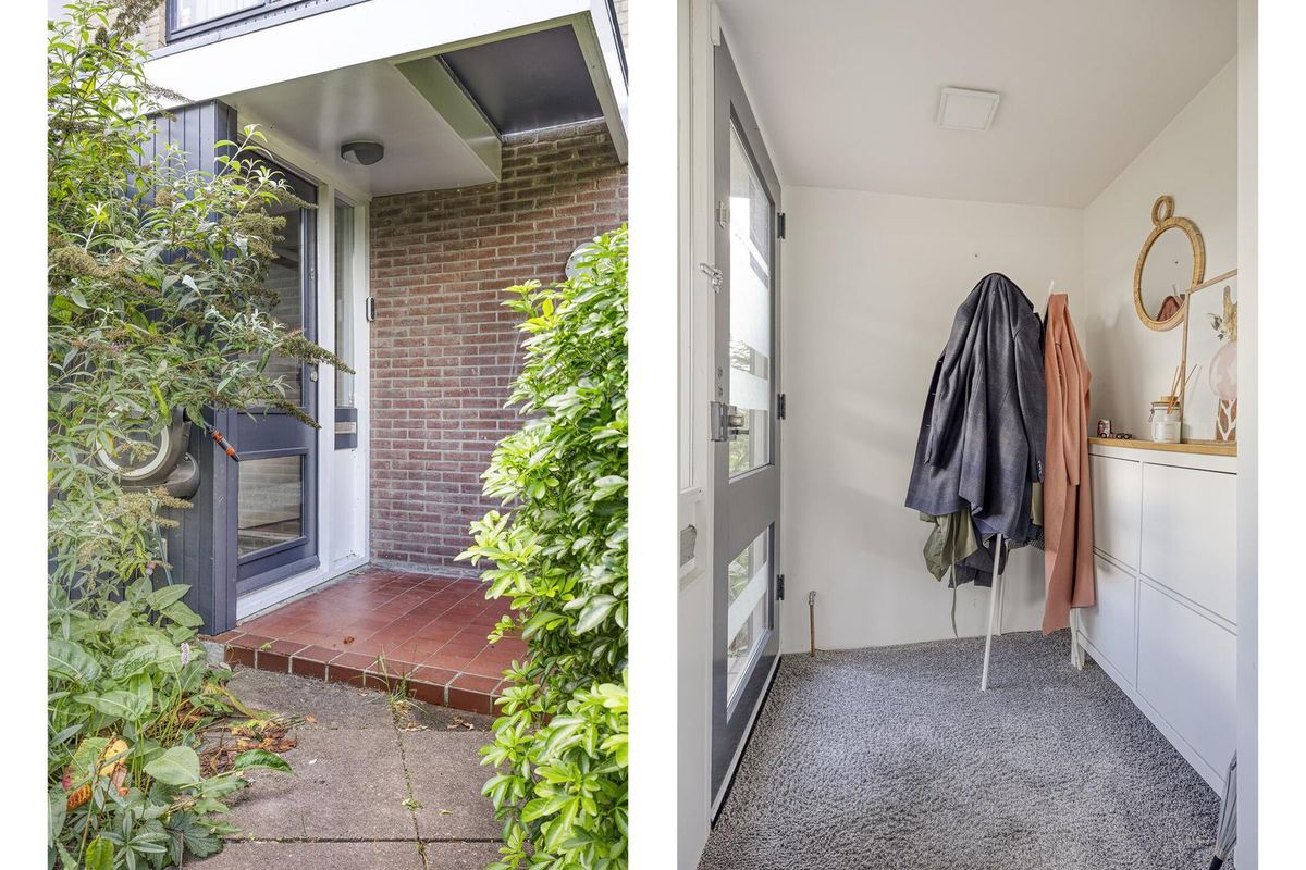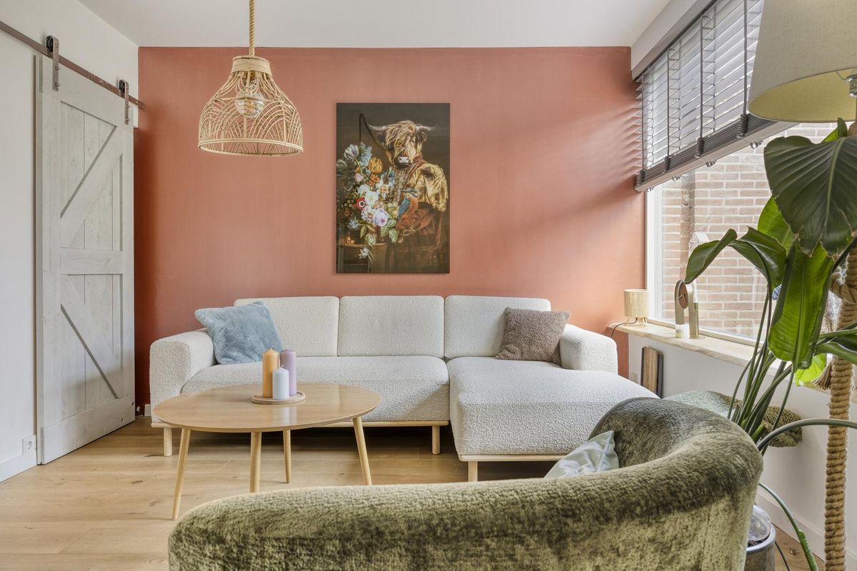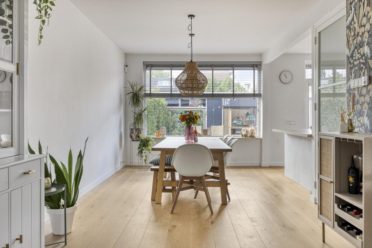 Via de verzorgde voortuin betreedt u de hal van de woning, waar voldoende ruimte is om jassen en schoenen op te bergen. De sfeervolle woonkamer is voorzien van vloerverwarming, een prachtige massief eikenhouten vloer en strak gestucte wanden. De praktische trapkast is stijlvol afgewerkt met een houten schuifdeur.