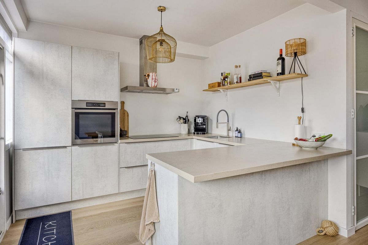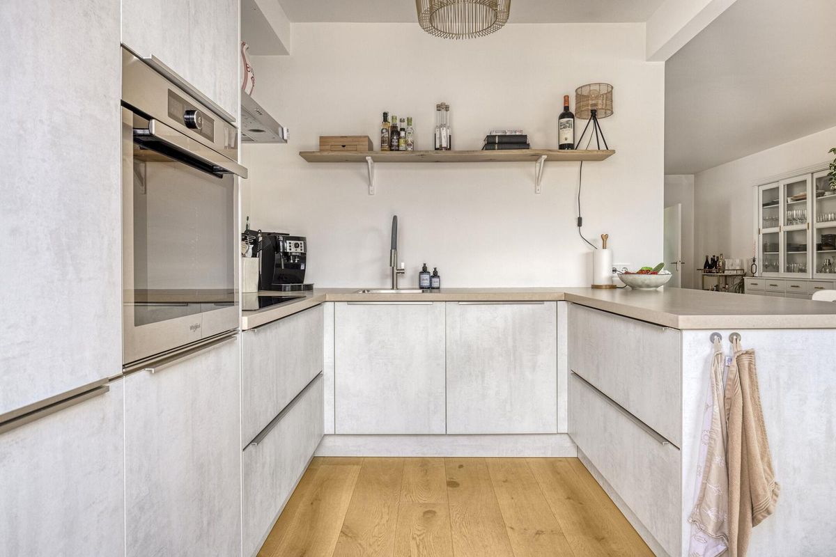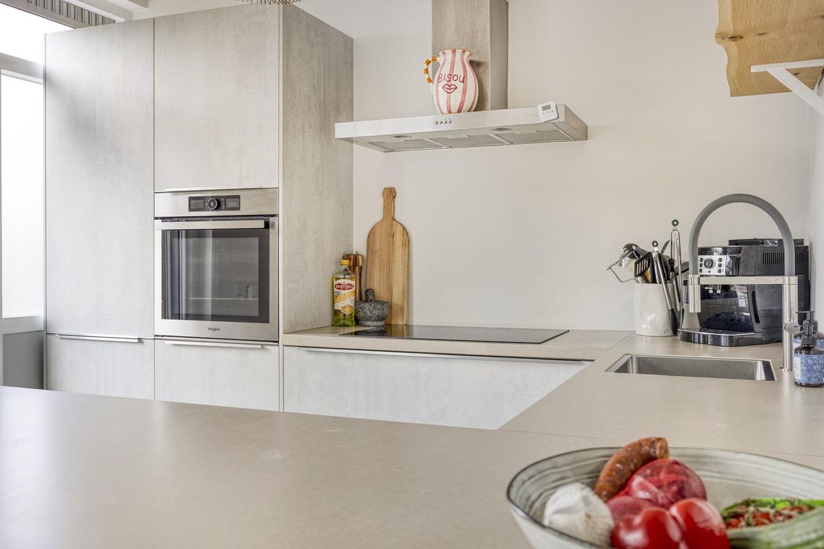 De luxe open keuken is voorzien van een composiet werkblad en diverse inbouwapparatuur, waaronder een inductiekookplaat, koel-/vriescombinatie, oven, vaatwasser en een afzuigkap. De bar nodigt uit tot gezellige interactie met uw gezelschap. Vanuit zowel de woonkamer als de keuken heeft u zicht op de zonnige achtertuin. In de tussenhal bij de trapopgang bevinden zich het moderne toilet met fonteintje en de meterkast, voorzien van drie aardlekschakelaars en elf groepen.