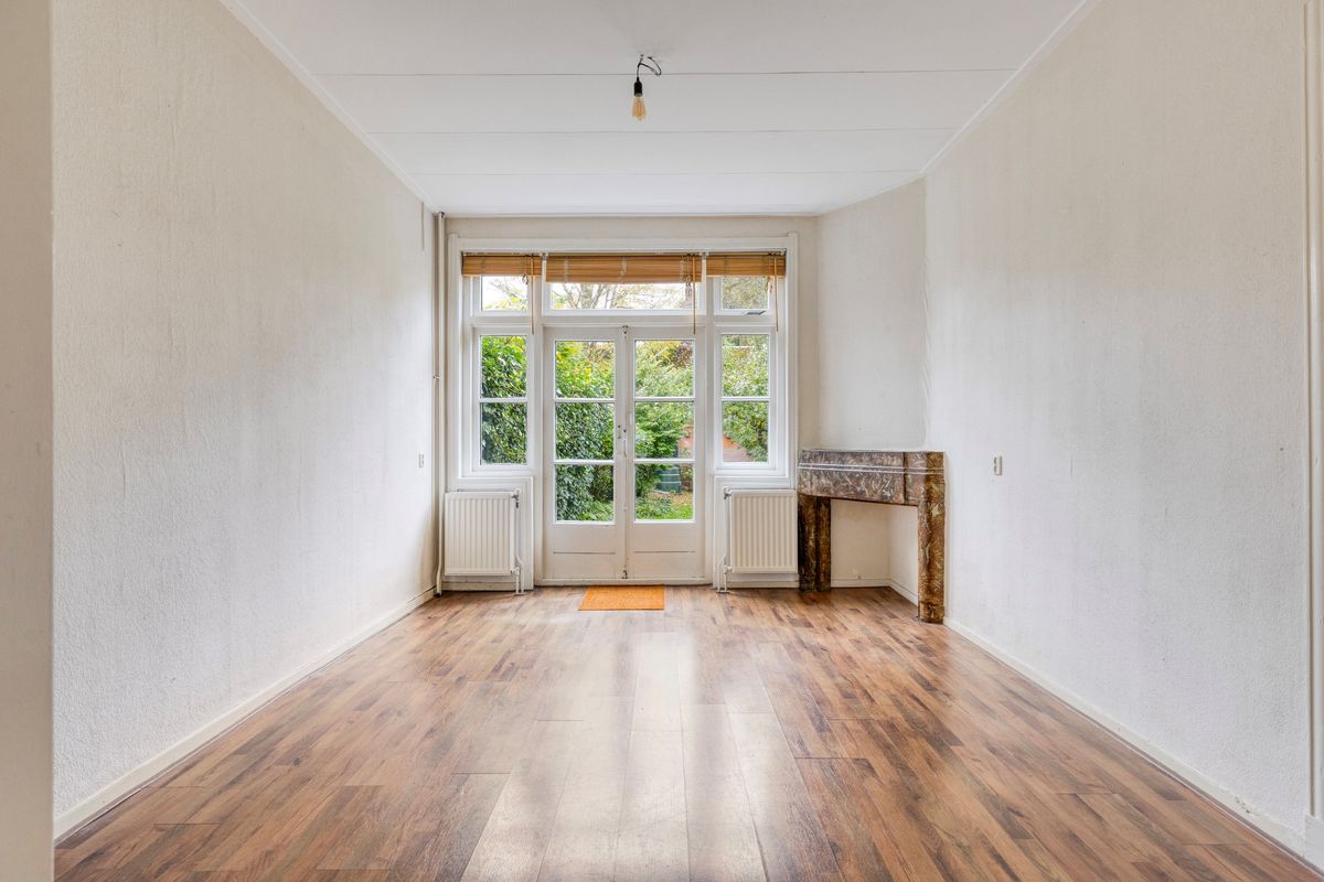 Entree met ruime vestibule en een hal met toegang tot de trapopgang, toilet en woonkamer. De ruime woonkamer heeft veel lichtinval dankzij de grote raampartijen en openslaande deuren naar de tuin. Authentieke details, zoals de schouwen, en suitedeuren en hoge plafonds, geven direct sfeer en karakter aan de woonkamer.