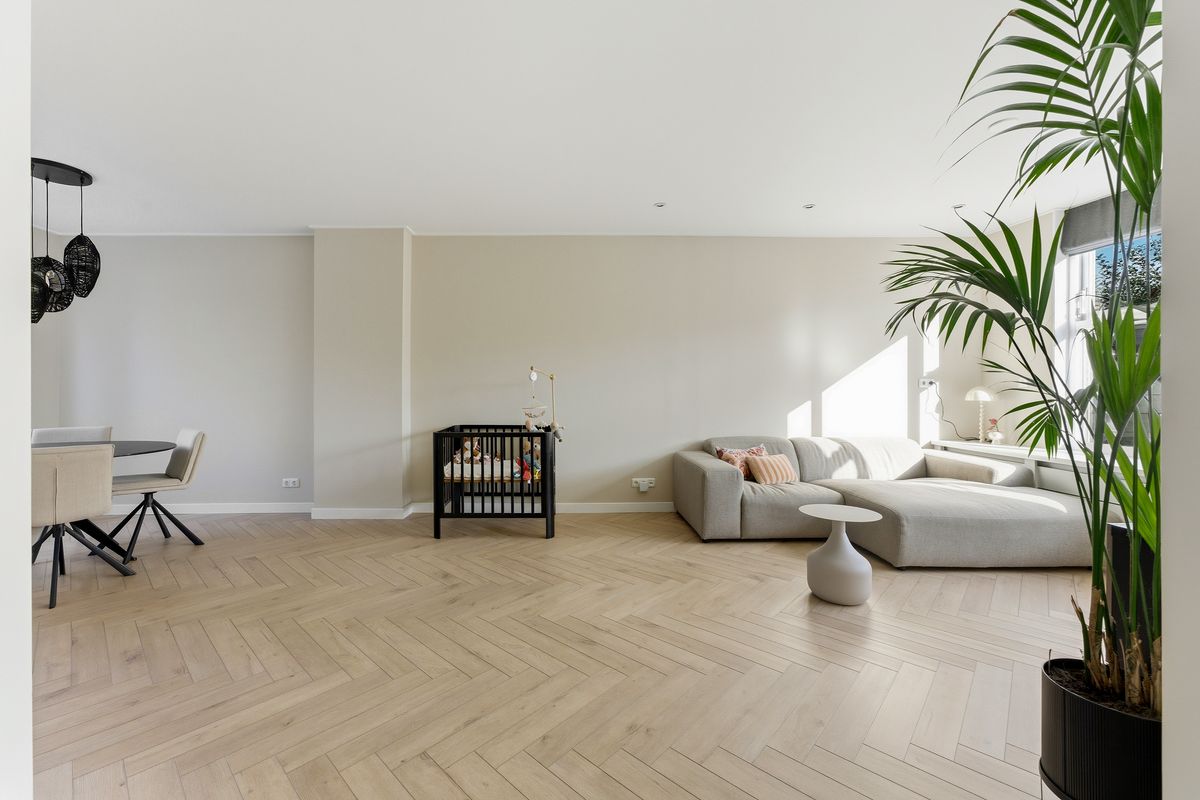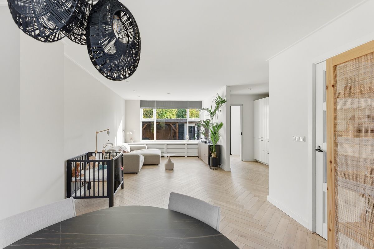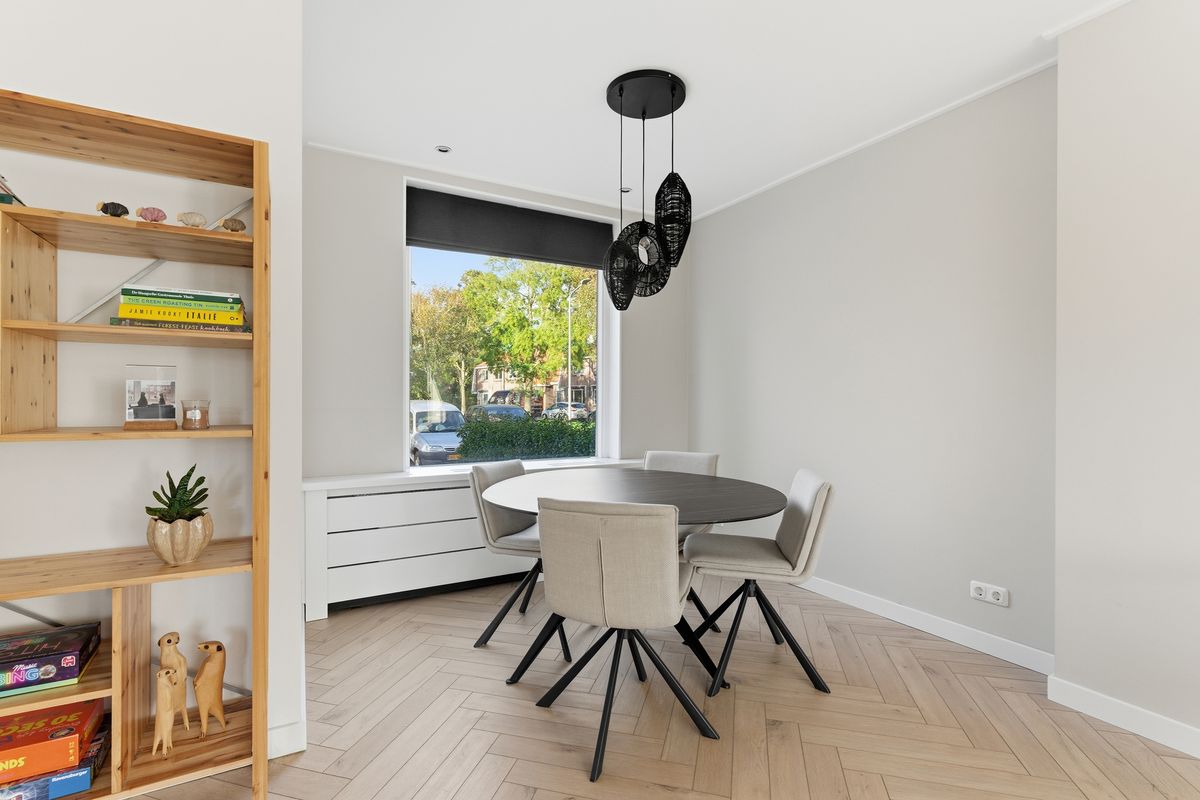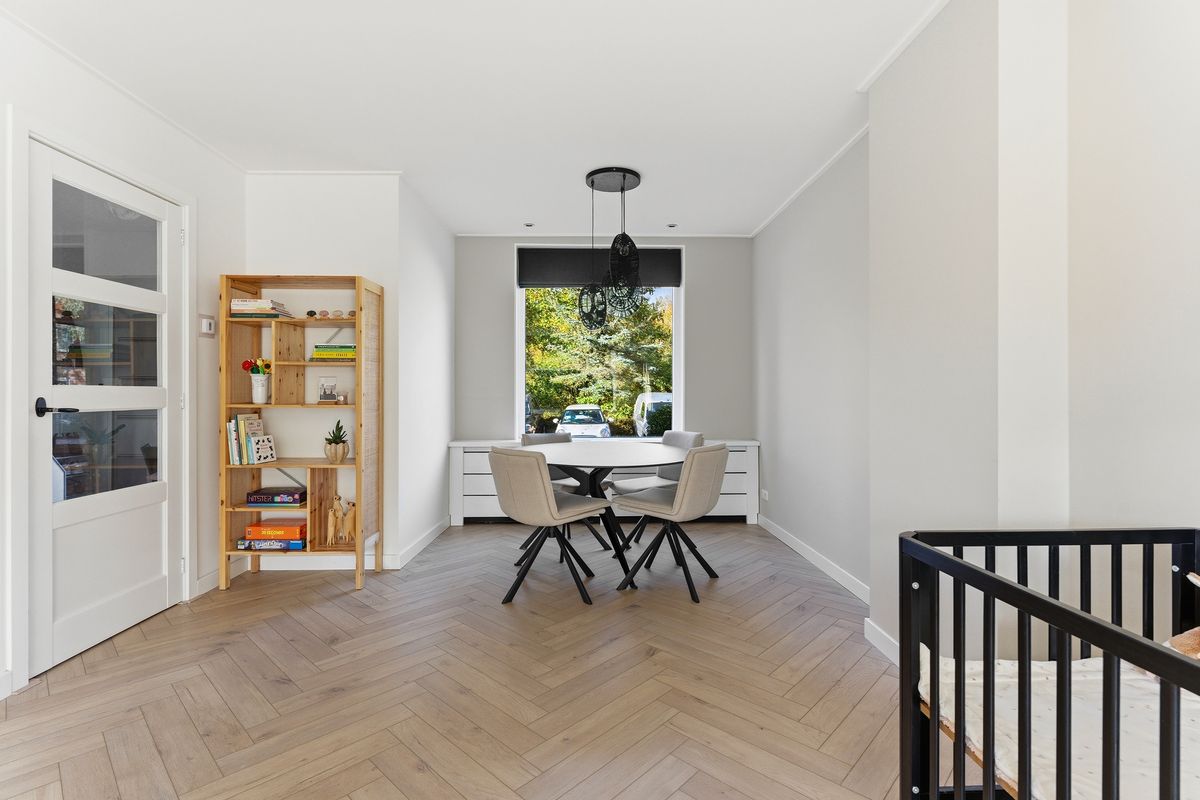 Woonkamer: Wat meteen opvalt is de royale, gezellige woonkamer met visgraatvloer en vloerverwarming. Dankzij de grote ramen komt er veel licht binnen en heb je aan de voorzijde vrij uitzicht over een groen grasveld en charmante jaren ’30 woningen. Zowel voor als achter is een stijlvolle radiatorombouw aanwezig en aan de achterzijde is een screen geplaatst tegen de zon. De ruimte is afgewerkt met gestuukte wanden en een gestuukt plafond.