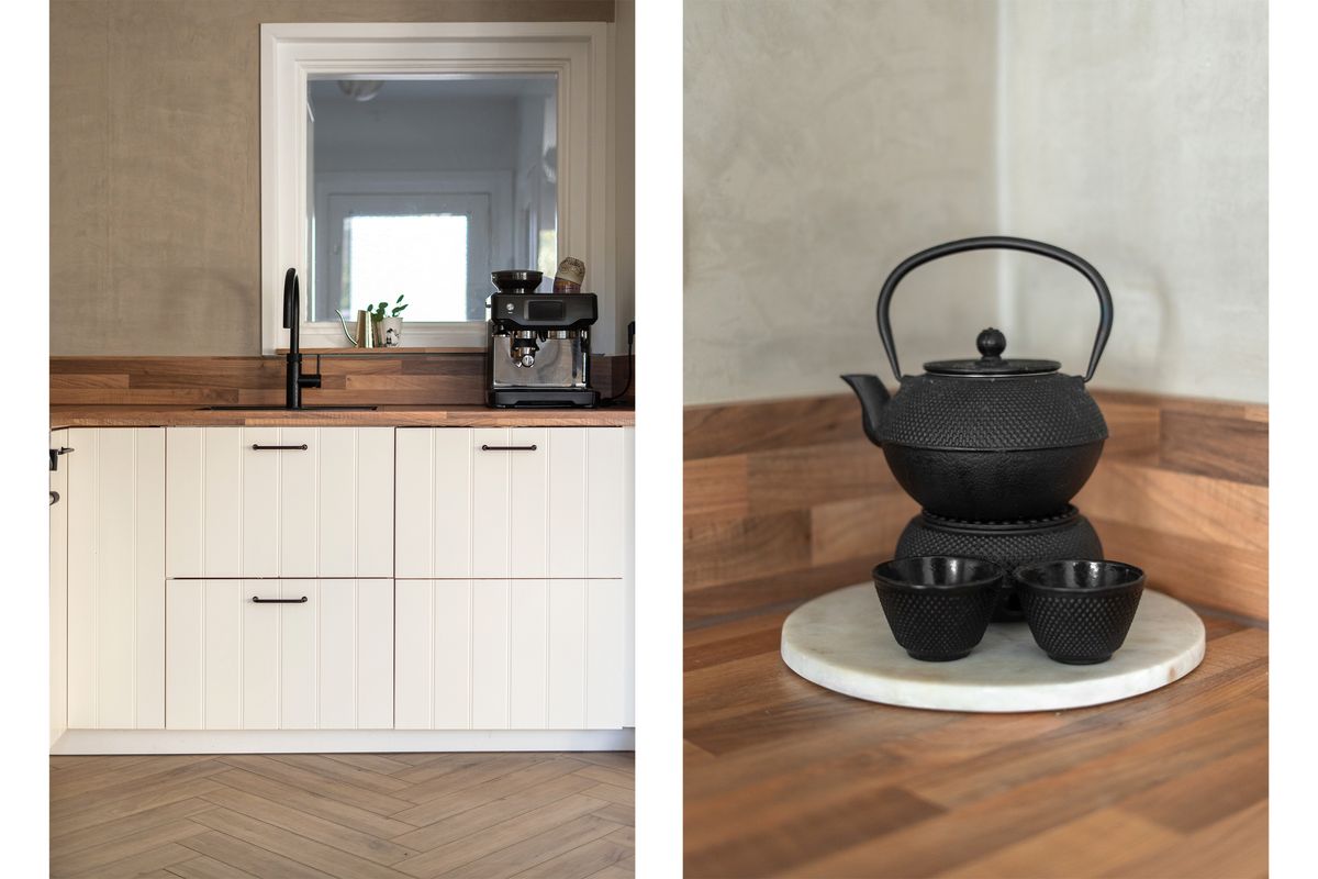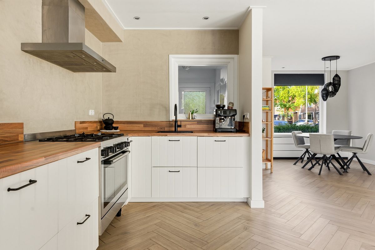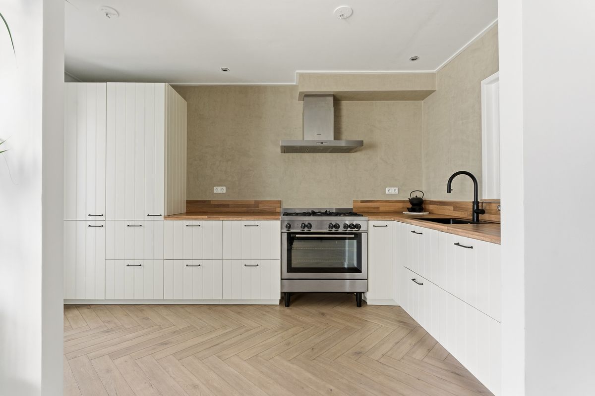 Keuken: De open keuken vormt een mooi geheel met de woonkamer. De keuken is uitgerust met een 5-pits gasfornuis, afzuigkap, oven, koel-vriescombinatie, Quooker en vaatwasser. Een leuk detail is het raam tussen hal en keuken, dat zorgt voor extra lichtinval. Achter de keuken bevindt zich een praktische bijkeuken, bereikbaar via een stoere schuifdeur. De gehele begane grond is voorzien van vloerverwarming. De ruimte is afgewerkt met PVC-vloer, gestuukte wanden en een gestuukt plafond.