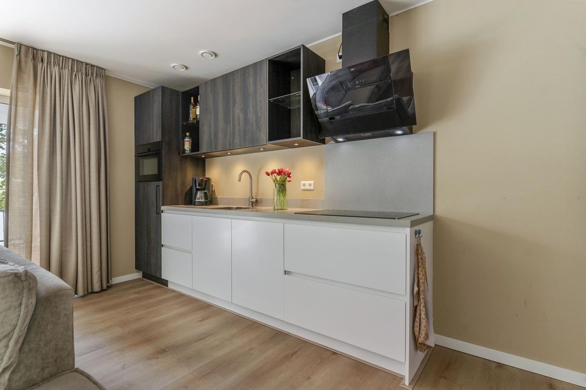 De moderne, open keuken is voorzien van een inductiekookplaat, afzuiginstallatie, koelkast, combi-magnetron en een vaatwasser.