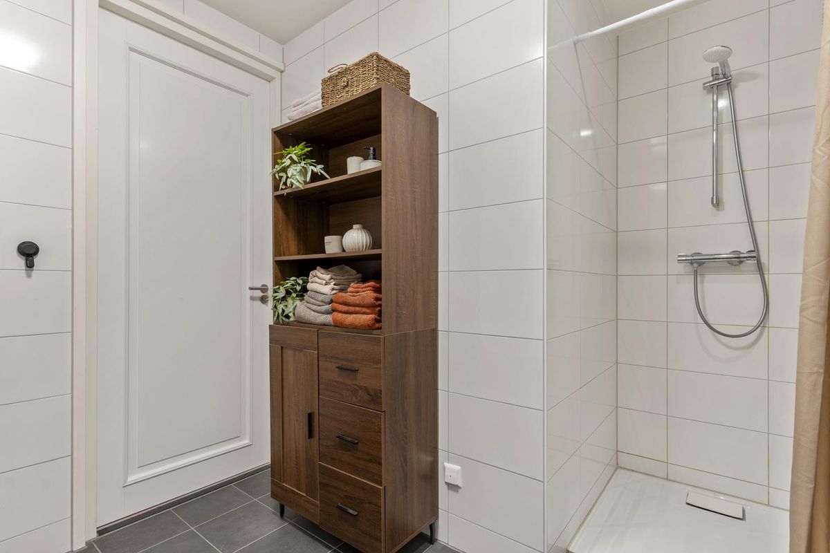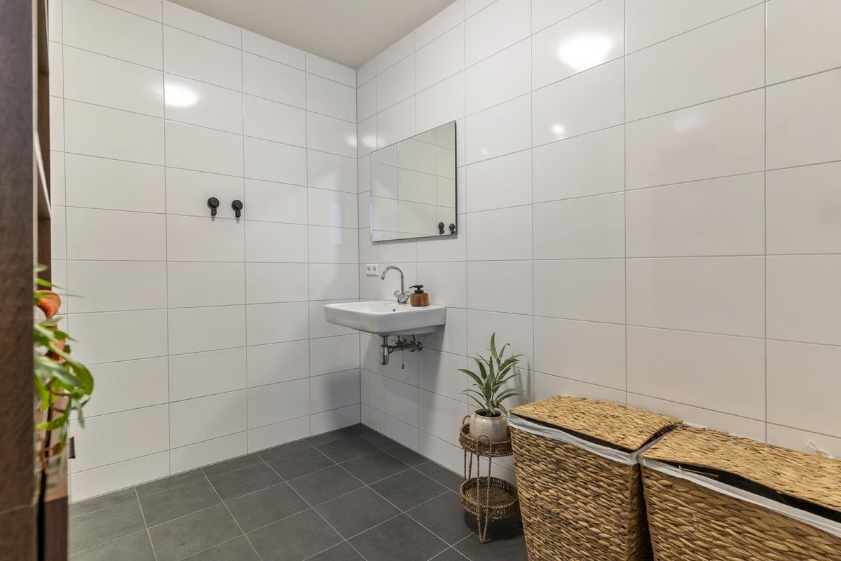 De volledig betegelde en moderne badkamer is voorzien van een inloopdouche, wastafel en een designradiator.