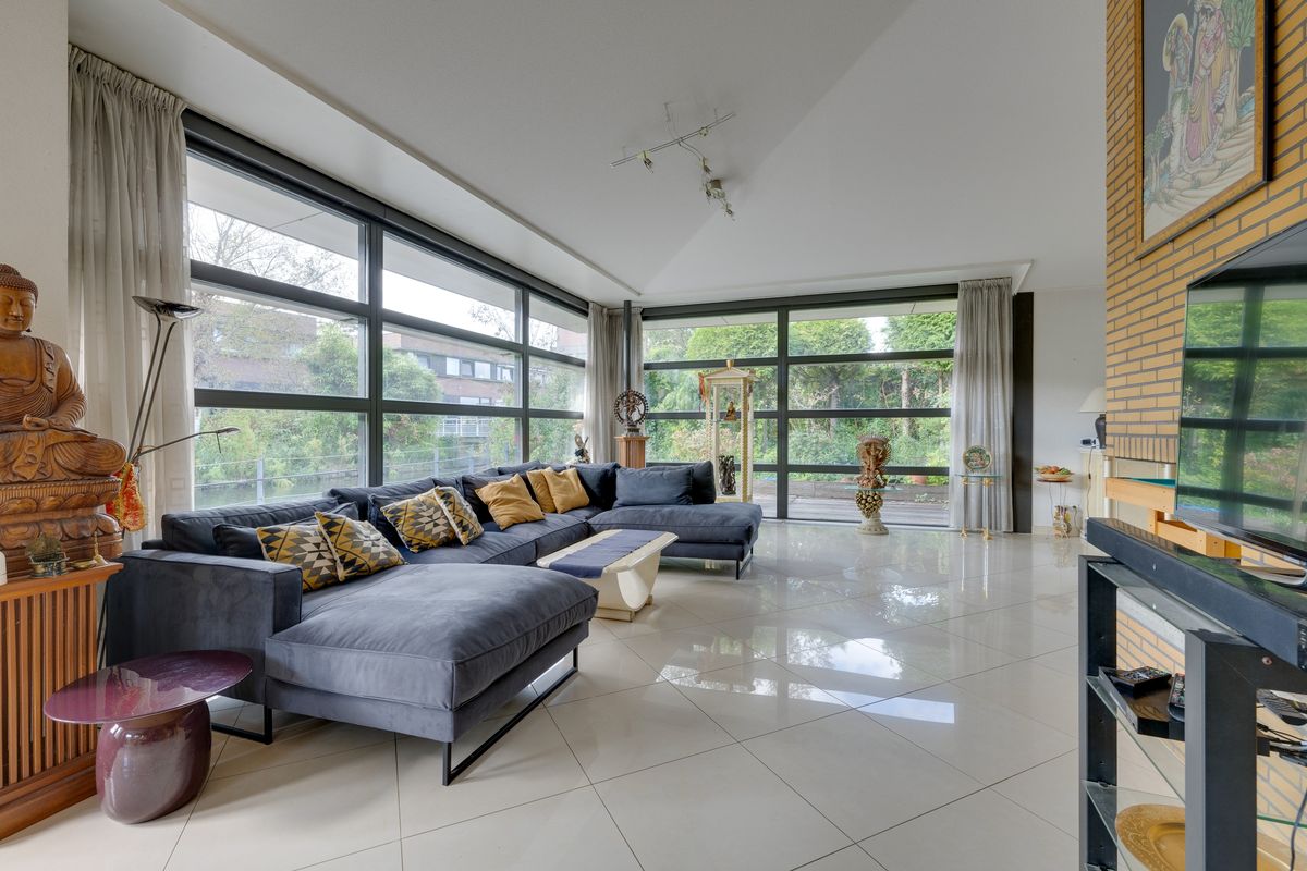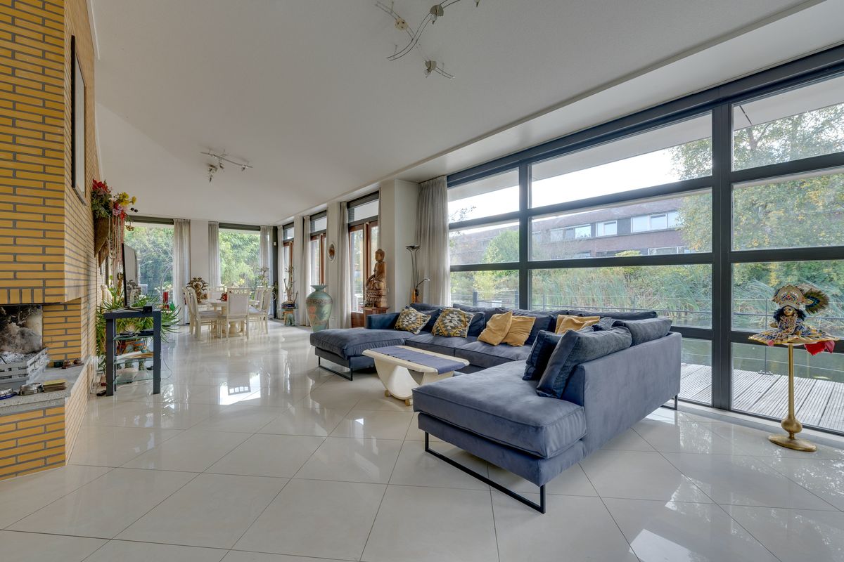 Enkele treden lager bevindt zich de ruime woonkamer, waar grote glazen puien een panoramisch uitzicht bieden over de waterpartij en het aangrenzende terras.