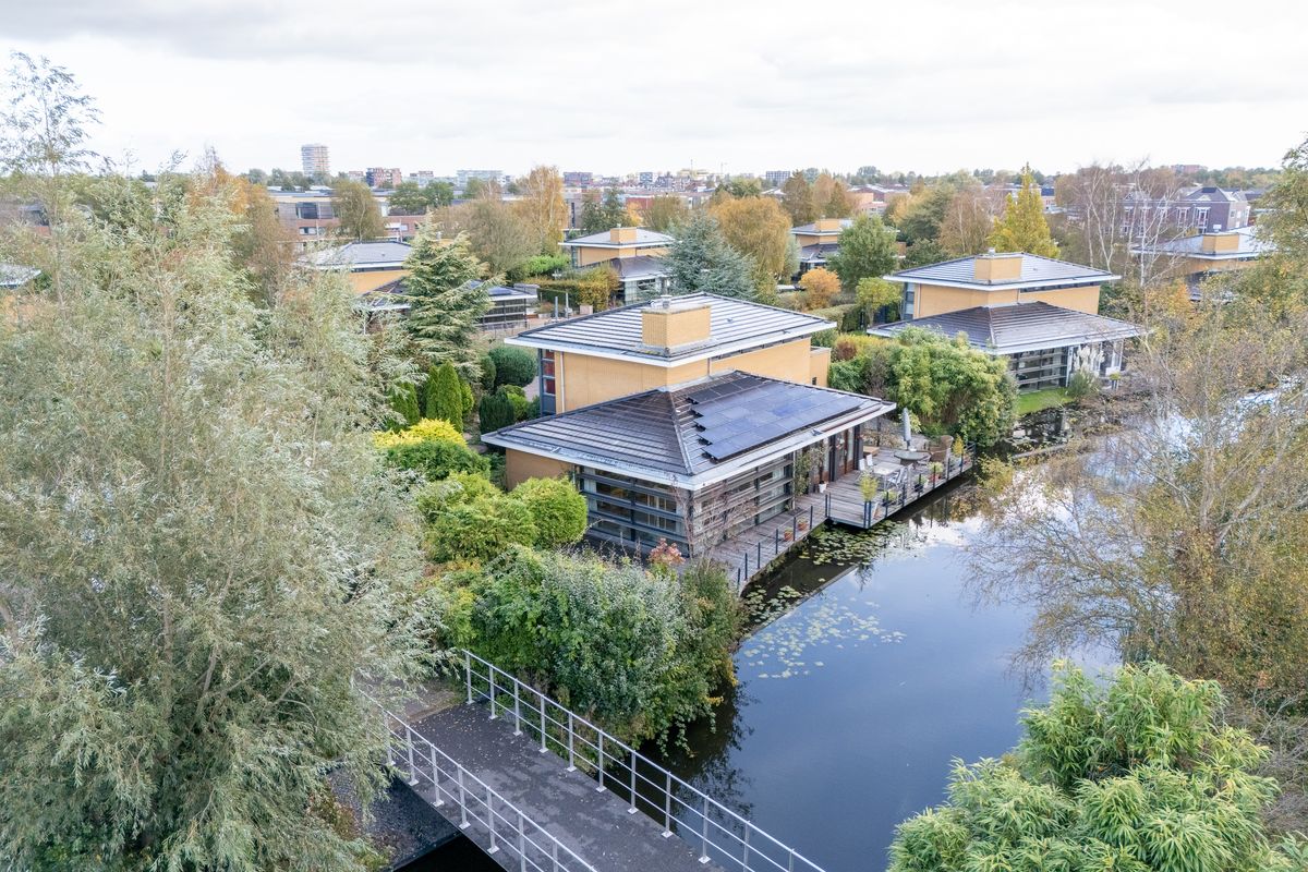 Te midden van water, weide en groen ligt aan de Mesa Verde 9 deze indrukwekkende, vrijstaande villa – een woning die uitblinkt in stijl, ruimte en comfort. De architectuur is geïnspireerd op het werk van de beroemde Amerikaanse architect Frank Lloyd Wright, herkenbaar aan de speelse lijnen, natuurlijke materialen en harmonieuze verbinding met de omgeving.