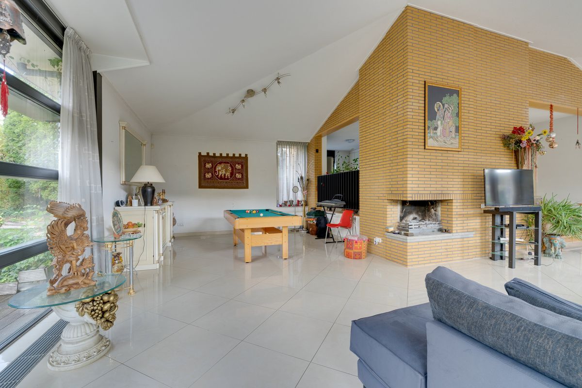 De woonkamer voelt licht en ruim aan, met een sfeervolle open haard als blikvanger.