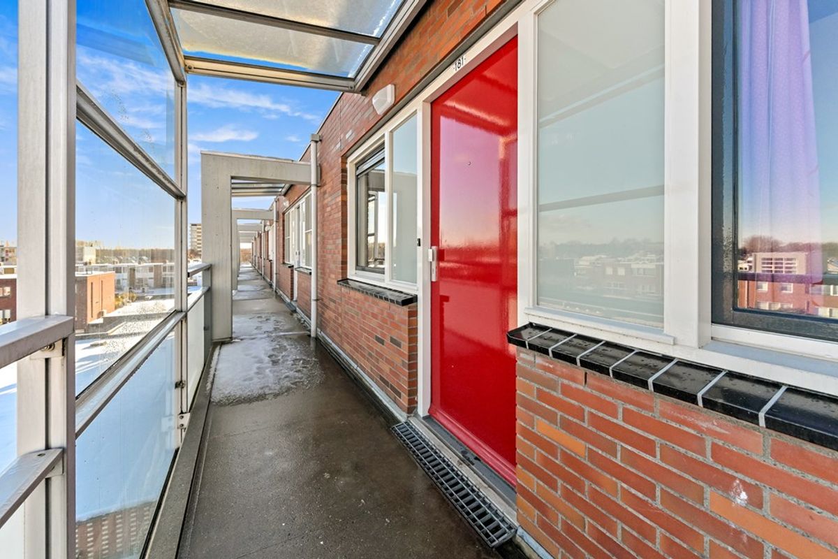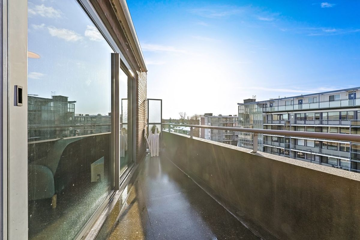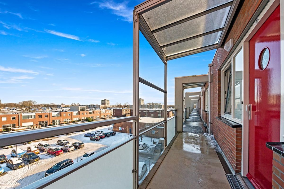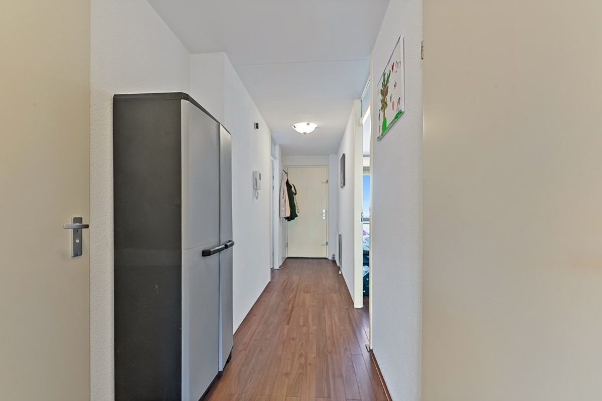Via de galerij bereikt u de voordeur van het appartement. Ruime hal met garderobe, videofoon-installatie, meterkast en toegang tot alle vertrekken. Aan de voorzijde van het appartement zijn twee slaapkamers te vinden. De grootste slaapkamer is in gebruik als hoofdslaapkamer en is voorzien van een vaste kastenwand. De tweede kamer, welke eveneens is voorzien van een vaste kast, kan uitstekend worden ingericht als tweede slaapkamer maar ook als bijvoorbeeld kantoorkamer of inloopkast. De ruime badkamer is in het midden van het appartement te vinden. Hier vindt u een ligbad, douchecabine en wastafel. Aan de andere zijde van de hal is de toiletruimte gesitueerd. Vervolgens komt u uit in de ruime woonkamer. De woonkamer is afgewerkt met een laminaat vloer en beschikt onder andere over een schuine, grote glazen pui waardoor hier aangenaam veel daglicht naar binnen schijnt. Via de schuifpui heeft u toegang tot het zonnige balkon op het westen. Dankzij het elektrische zonnescherm kunt u hier heerlijk van het buitenleven genieten. De halfopen keuken in hoekopstelling is voorzien van diverse inbouwapparatuur, waaronder een koelkast, vriezer, gaskookplaat, afzuigkap, oven en vaatwasser. Aansluitend bevindt zich de praktische bijkeuken met o.a. de opstelplaats van de C.V. ketel, wasmachine en wasdroger.