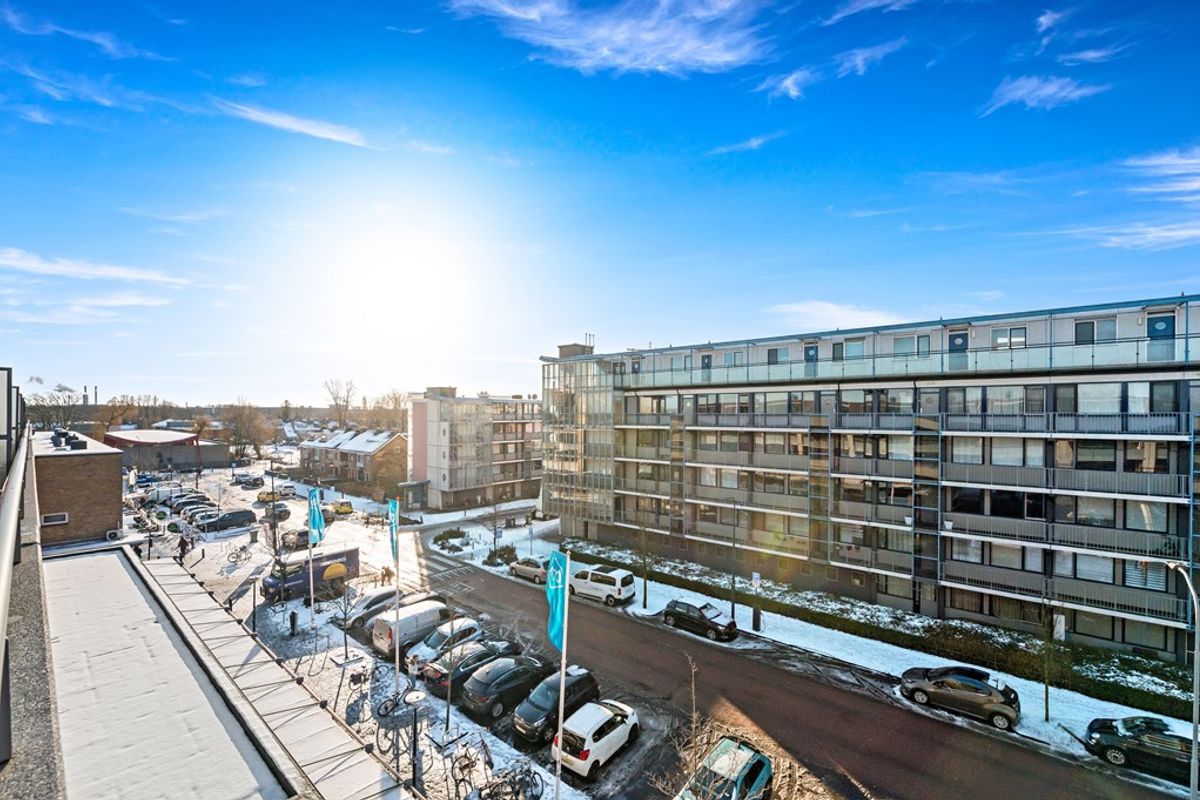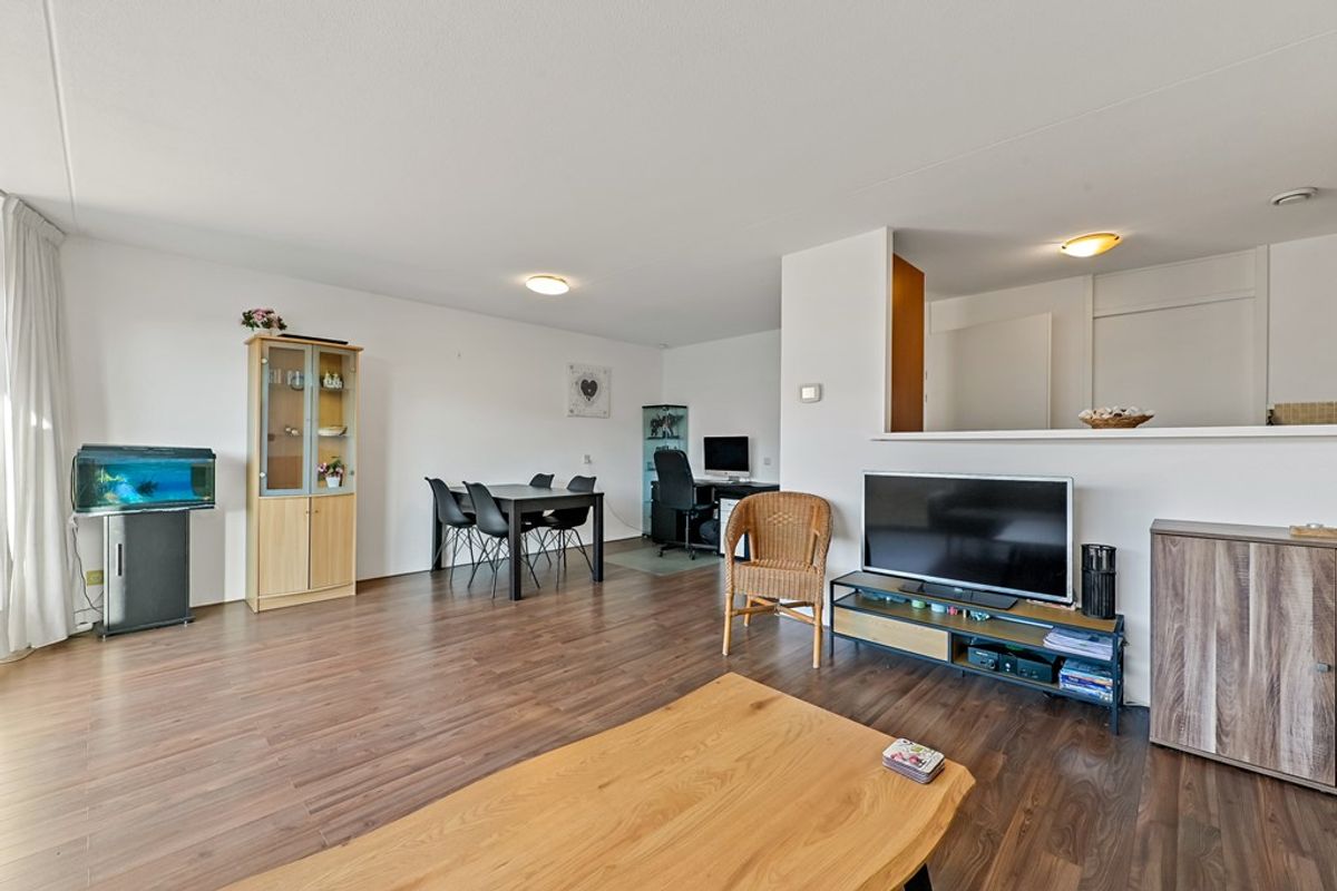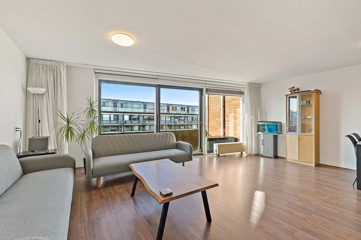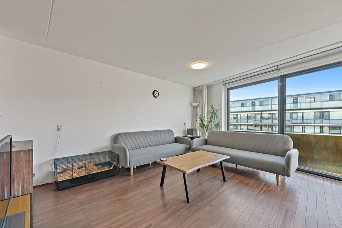 Via de galerij bereikt u de voordeur van het appartement. Ruime hal met garderobe, videofoon-installatie, meterkast en toegang tot alle vertrekken. Aan de voorzijde van het appartement zijn twee slaapkamers te vinden. De grootste slaapkamer is in gebruik als hoofdslaapkamer en is voorzien van een vaste kastenwand. De tweede kamer, welke eveneens is voorzien van een vaste kast, kan uitstekend worden ingericht als tweede slaapkamer maar ook als bijvoorbeeld kantoorkamer of inloopkast. De ruime badkamer is in het midden van het appartement te vinden. Hier vindt u een ligbad, douchecabine en wastafel. Aan de andere zijde van de hal is de toiletruimte gesitueerd. Vervolgens komt u uit in de ruime woonkamer. De woonkamer is afgewerkt met een laminaat vloer en beschikt onder andere over een schuine, grote glazen pui waardoor hier aangenaam veel daglicht naar binnen schijnt. Via de schuifpui heeft u toegang tot het zonnige balkon op het westen. Dankzij het elektrische zonnescherm kunt u hier heerlijk van het buitenleven genieten. De halfopen keuken in hoekopstelling is voorzien van diverse inbouwapparatuur, waaronder een koelkast, vriezer, gaskookplaat, afzuigkap, oven en vaatwasser. Aansluitend bevindt zich de praktische bijkeuken met o.a. de opstelplaats van de C.V. ketel, wasmachine en wasdroger.