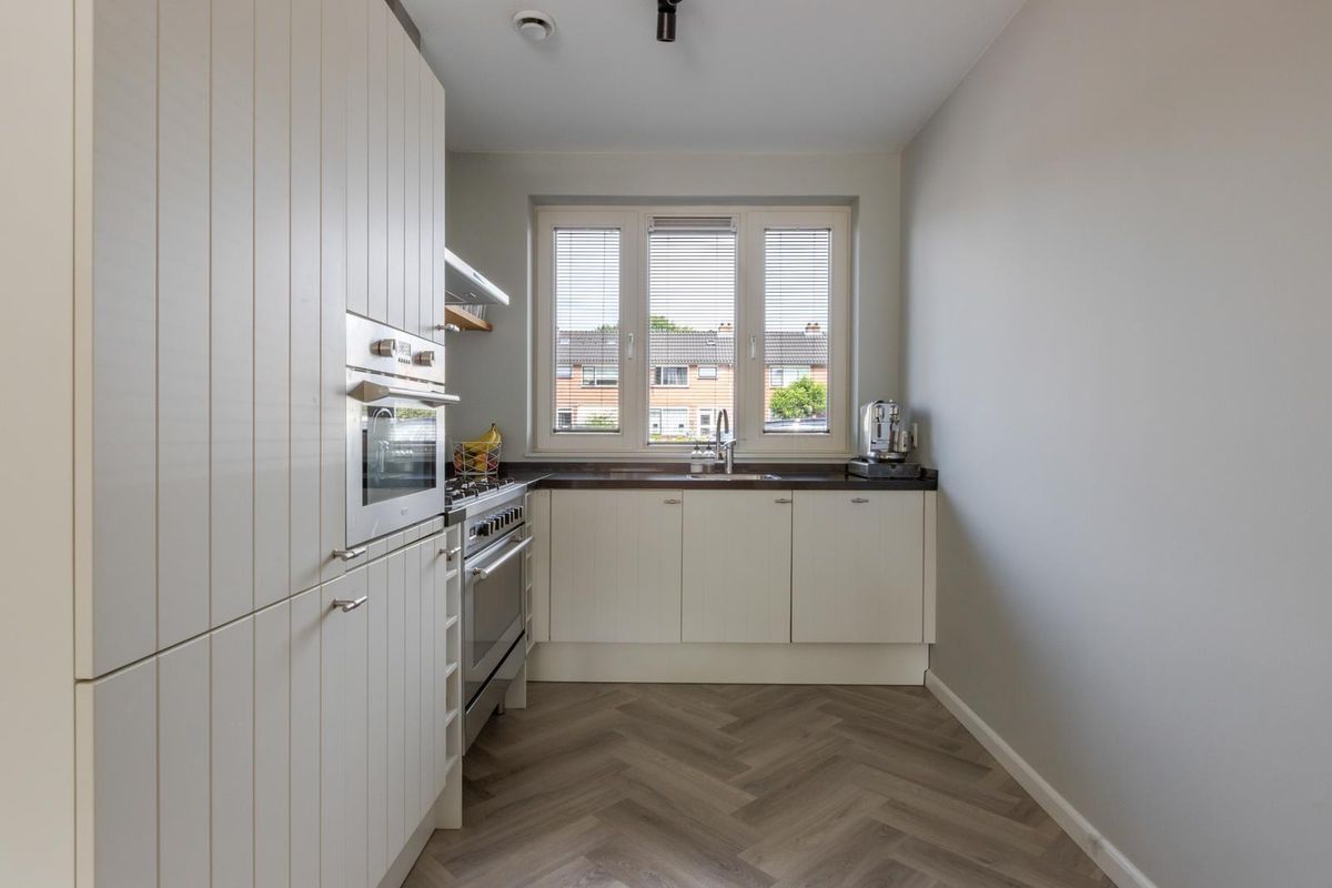 De royale living van ca. 37.6 m2 is v.v. vloerverwarming, een fraaie visgraat pvc-vloer, gestuukte wanden en plafonds en biedt veel lichtinval dankzij de grote raampartijen en openslaande deuren naar de tuin. De halfopen keuken van ca. 5.8 m2 met L-vormige opstelling en inbouwapparatuur is praktisch ingedeeld en v.v. een luxe oven, 6-pits gaskooktoestel, vaatwasser en koel-/vriescombinatie.