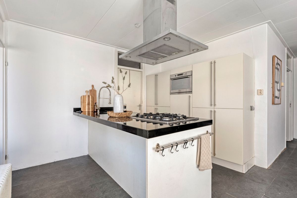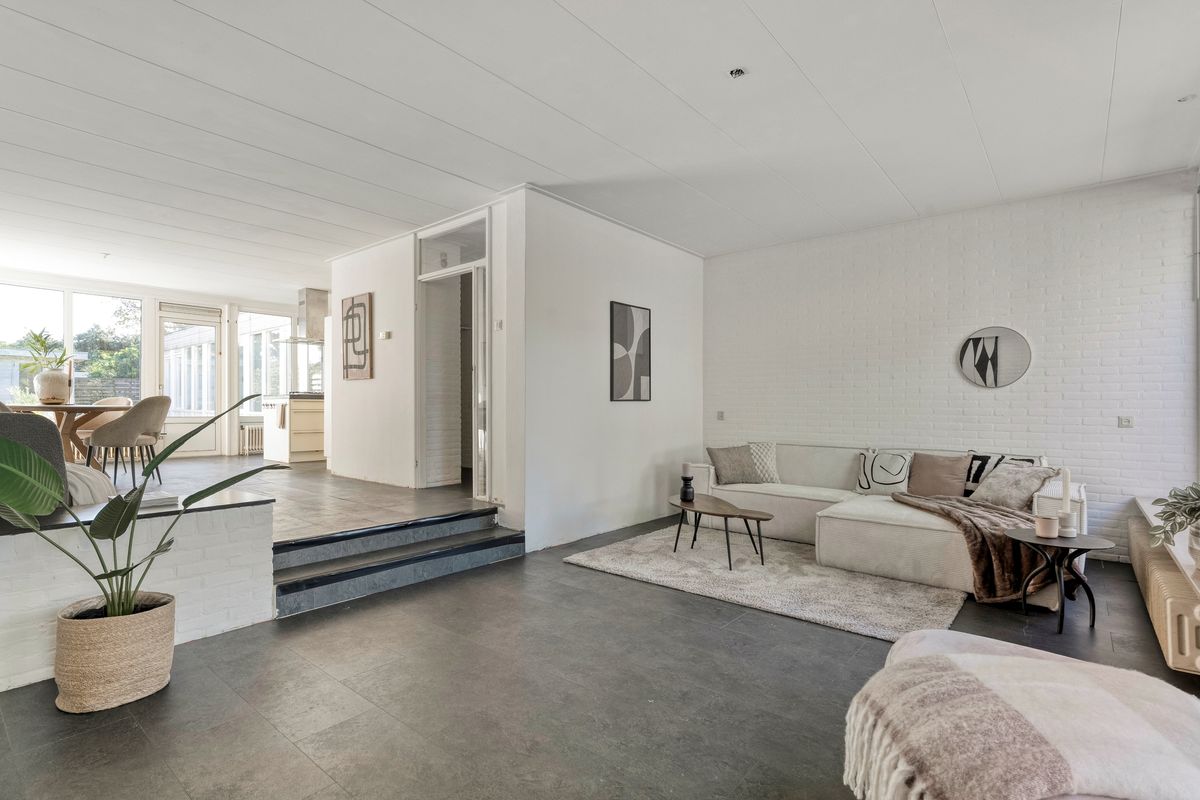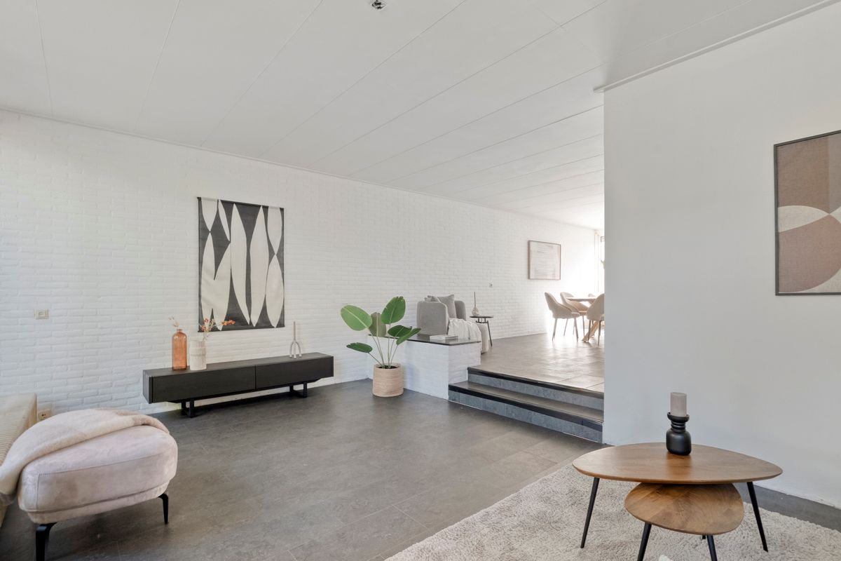 Wat meteen in het oog springt als je binnenkomt, is het speelse niveauverschil tussen de woonkamer en de woonkeuken. Hierdoor krijgt de ruimte nét dat beetje extra sfeer. Voor de gezelligheid kun je samen koken, borrelen of lekker hangen op de bank zonder op elkaars lip te zitten, maar het contact blijft toch behouden.
