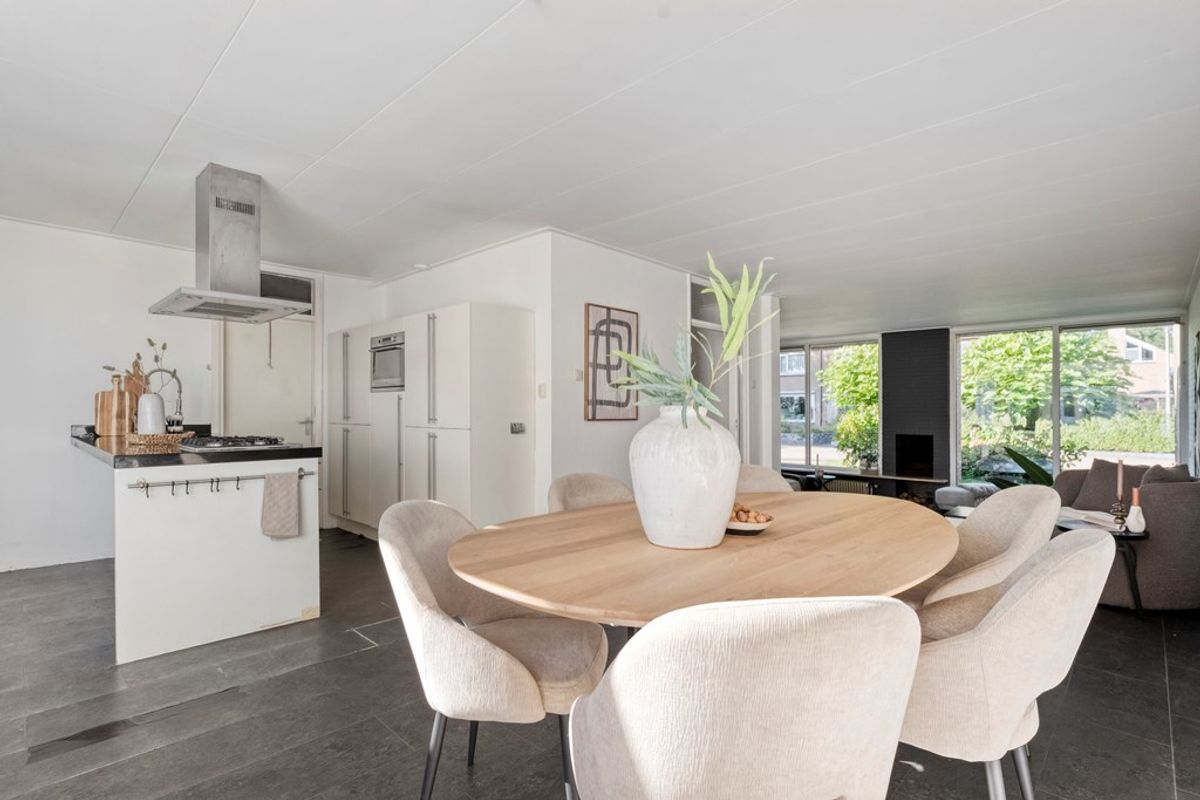 Aan de voorzijde is de speelse woonkamer gelegen met haard. De achterzijde is via een verhoogde splitlevel indeling te betreden woonkeuken met uitzicht op de achtertuin. De keuken is voorzien van verschillende inbouwapparatuur: koelkast, combimagnetron en een 5- pits gaskookplaat met afzuiging.