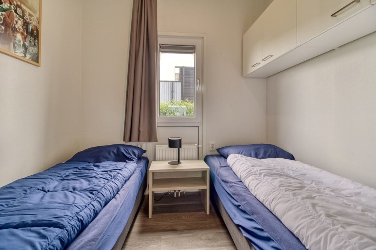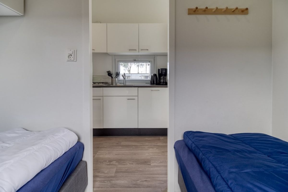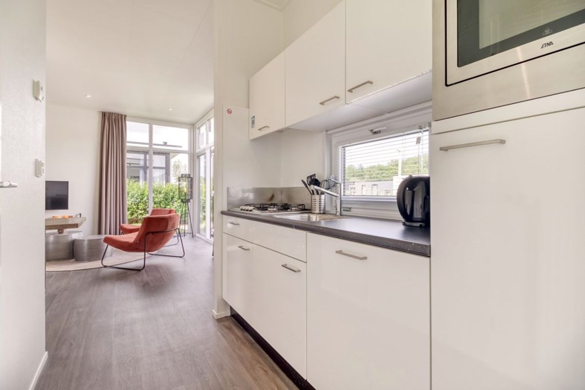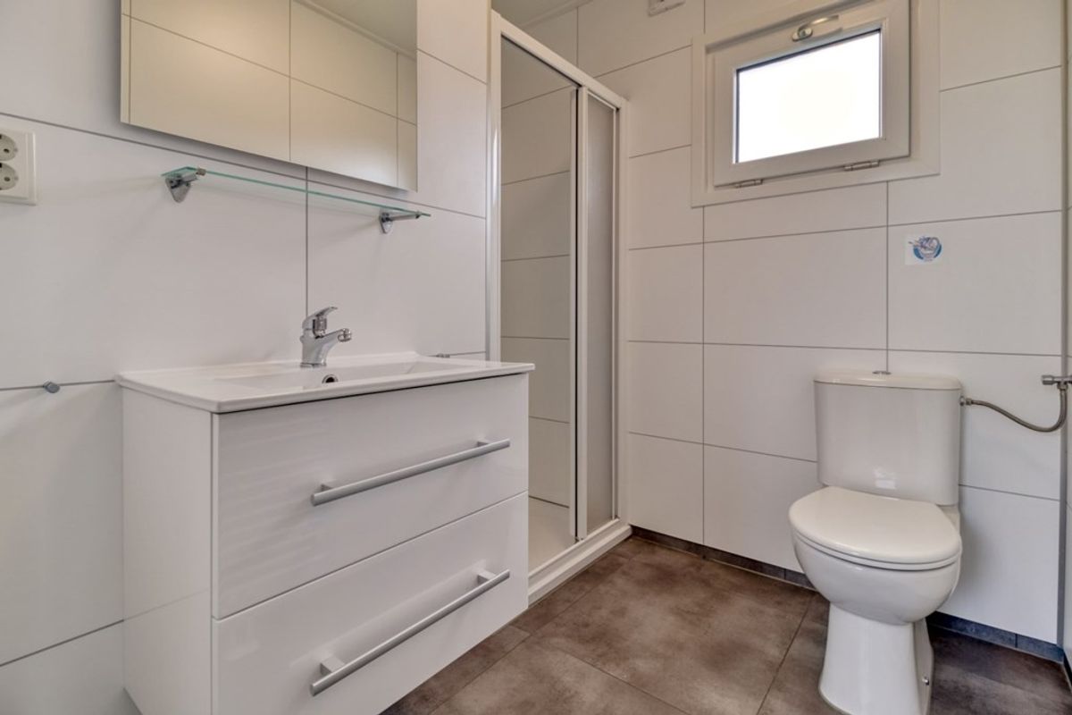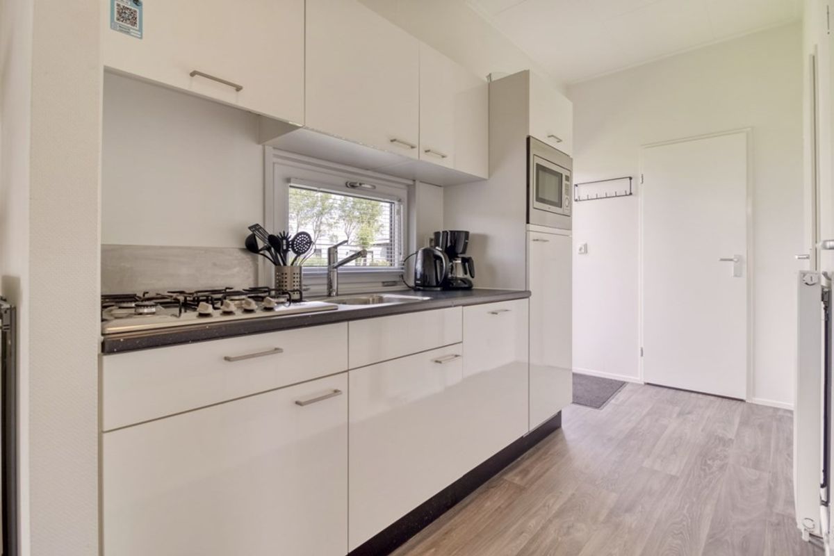 Naast de zithoek is er een eethoek en een open keuken die doorloopt in de hal. De keuken is voorzien van alle nodige inbouw-apparatuur en bestaat uit; 4-pits gas kookplaat, afzuigkap, combi- magnetron, koelkast met vriesvak, spoelbak en vaatwasmachine. Er zijn 2 slaapkamers, waarvan de grootste met grote inbouwkast. De badkamer is voorzien van douche, wastafel en toilet. De berging (2,53 m2) is van buitenaf bereikbaar en voldoende groot voor het stallen van (elektrische) fietsen. De afmetingen van de berging zijn 2,30 m bij 1,10 meter.
