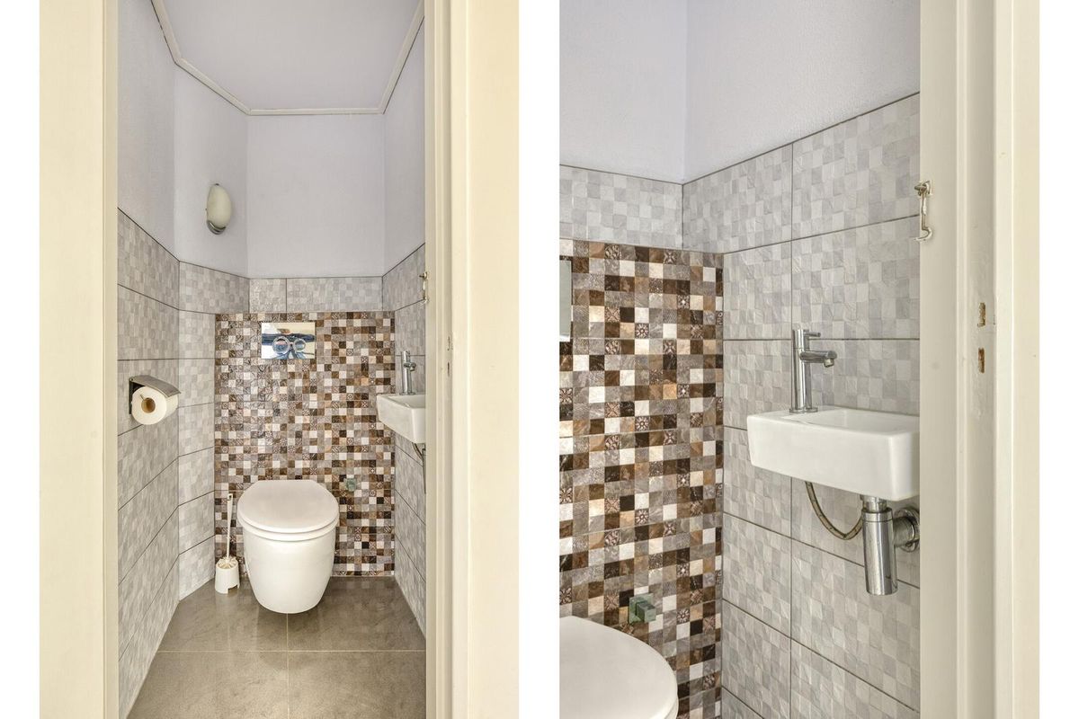 * Toiletruimte voorzien van wandcloset, fonteintje en gedeeltelijk voorzien van betegeling.