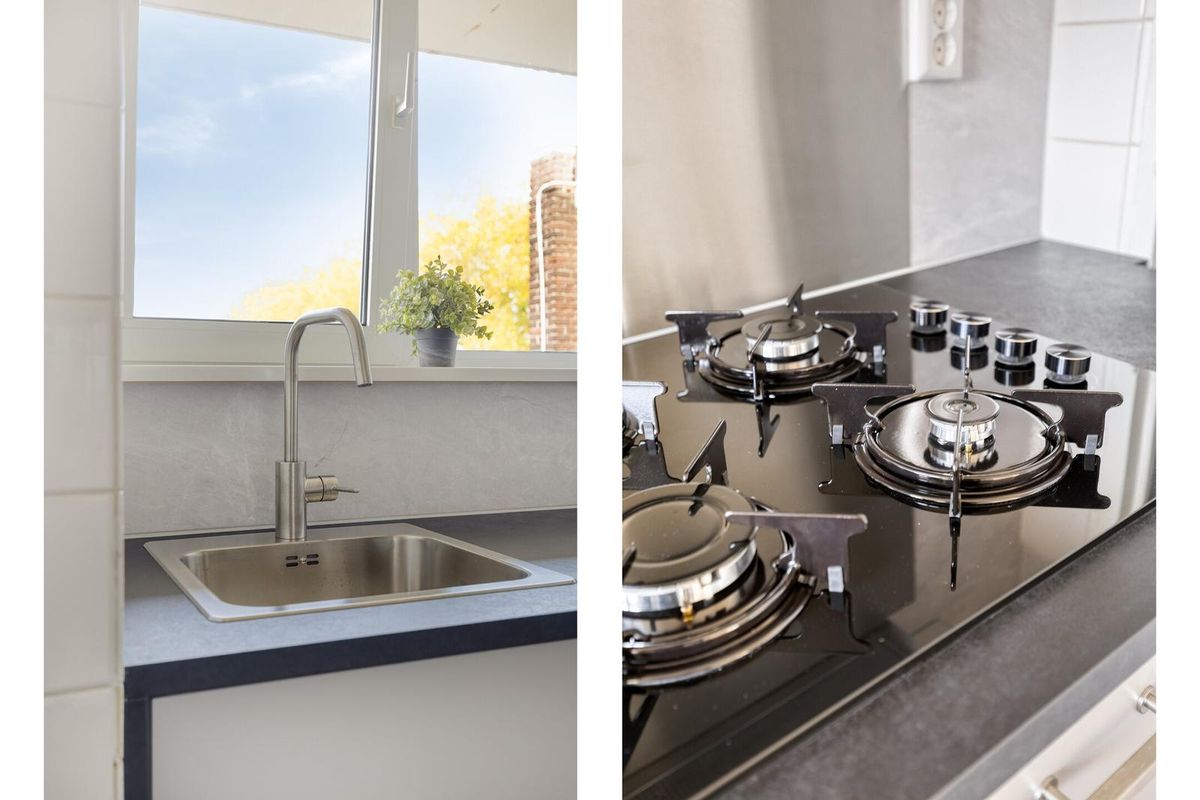 * Keuken aan de voorzijde voorzien van tegelvloer en moderne hoek-inbouwkeuken met apparatuur: gaskookplaat, afzuigkap, vaatwasser en inbouwwasmachine. Naast de inbouwkeuken is een provisiekast met de opstelling van de combiketel.