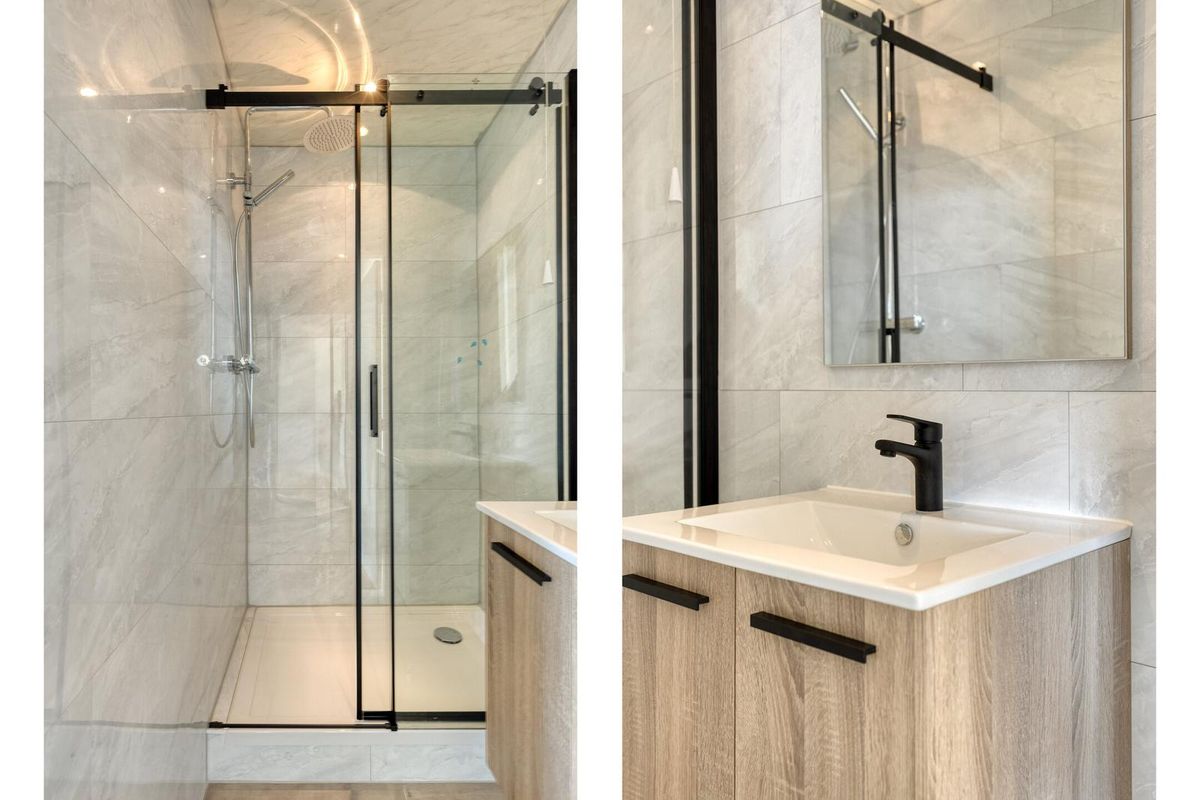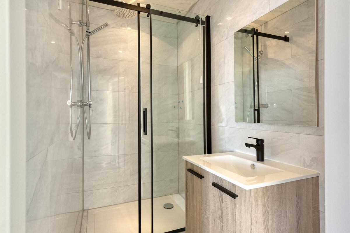 * Badkamer (2025) voorzien van moderne betegeling, douchecabine en wastafelmeubel.