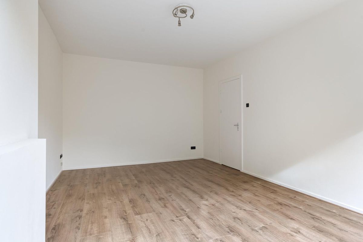 * Woonkamer aan de achterzijde, voorzien van laminaatvloer en een deur naar het balkon.