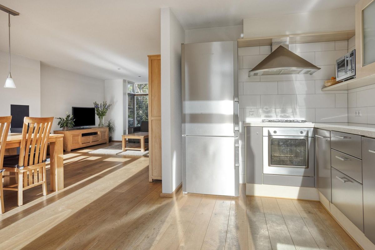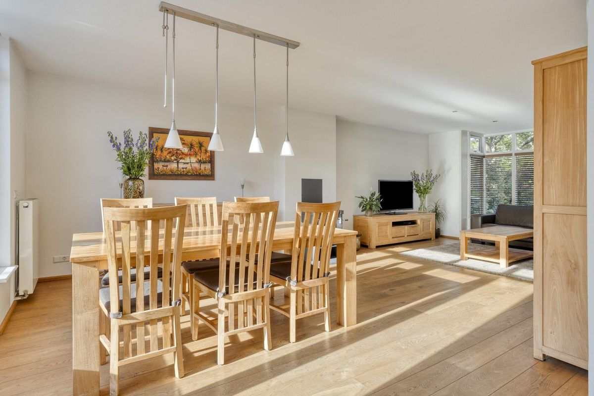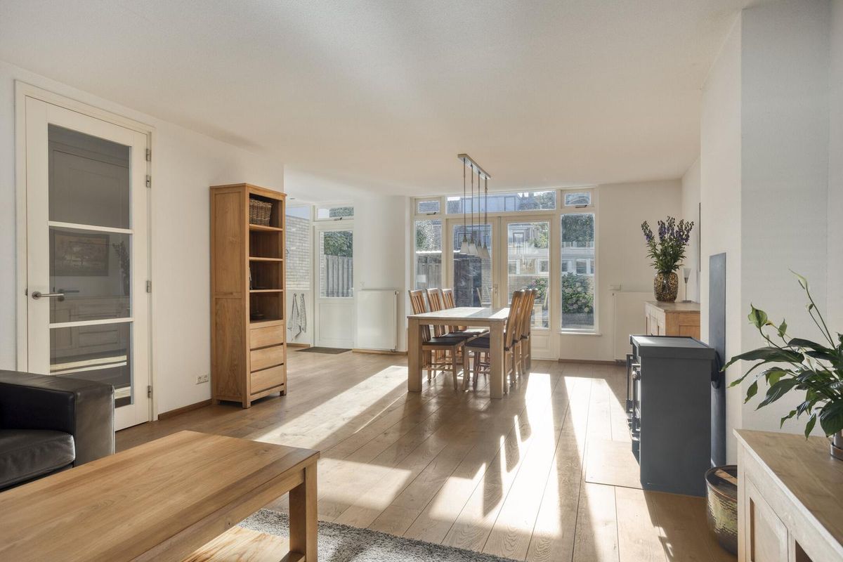 Via de entree komt u in de hal, waar zich de meterkast, een handige trap-/voorraadkast en het toilet met fontein bevinden. Vanuit de hal loopt u door naar de ruime woonkamer, die dankzij de erker heerlijk licht en uitnodigend aanvoelt. De open haard vormt hier een sfeervol middelpunt, perfect voor gezellige avonden. Grenzend aan de woonkamer vindt u de eetkamer, met openslaande deuren naar de tuin. Hierdoor lopen binnen en buiten op een natuurlijke manier in elkaar over. De open keuken is praktisch én gezellig ingedeeld en voorzien van een 4-pits gasfornuis met afzuigkap, een vaatwasser en veel opbergruimte. Ook vanuit de keuken heeft u directe toegang tot de tuin, ideaal voor een zomerse barbecue of een ontspannen ochtendkoffie in het zonnetje. De markiezen bieden hierbij niet alleen aangename schaduw op warme dagen, maar geven de woning ook extra charme en karakter. De gehele benedenverdieping is afgewerkt met een prachtige eikenhouten vloer, die warmte en luxe toevoegt, en is bovendien voorzien van stijlvolle spotjes, wat bijdraagt aan een moderne en sfeervolle uitstraling.