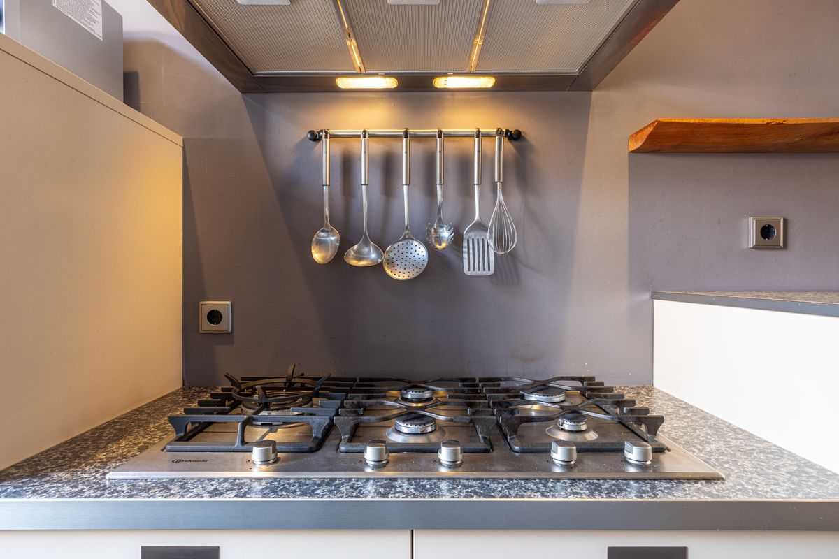 De ruime woonkamer, eveneens voorzien van een grindvloer, geniet van veel daglicht dankzij de aanbouw aan de achterzijde. Via de openslaande deuren staat de woonkamer in directe verbinding met het terras in de achtertuin. Rolluiken zorgen hier voor extra comfort en privacy. Vanuit de woonkamer is er tevens toegang tot de kelder: een royale ruimte verdeeld in twee gedeeltes, voorzien van een tegelvloer, aansluitingen voor witgoed en de cv-installatie. an de voorzijde van de woning bevindt zich de open keuken met grindvloer. Ook hier zijn rolluiken aanwezig. De keuken biedt volop kastruimte en is uitgerust met diverse inbouwapparatuur: een 5-pits gasfornuis, wandafzuigkap, oven en koelkast.