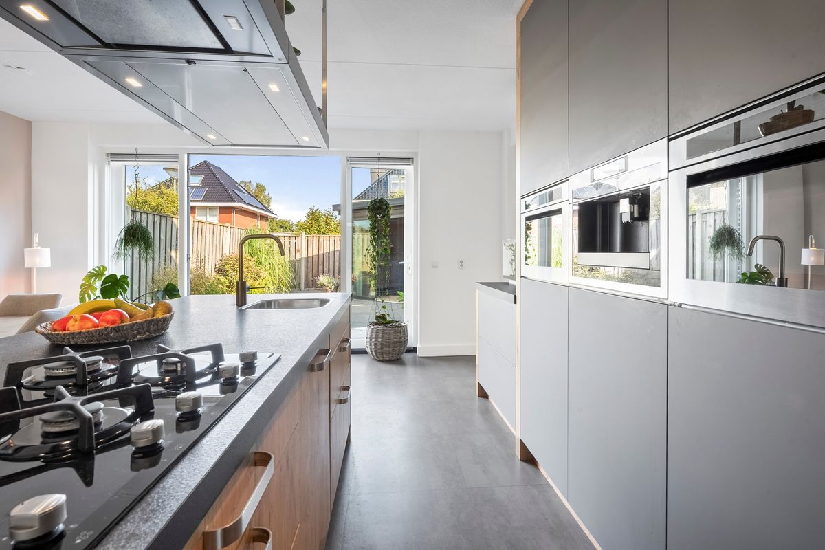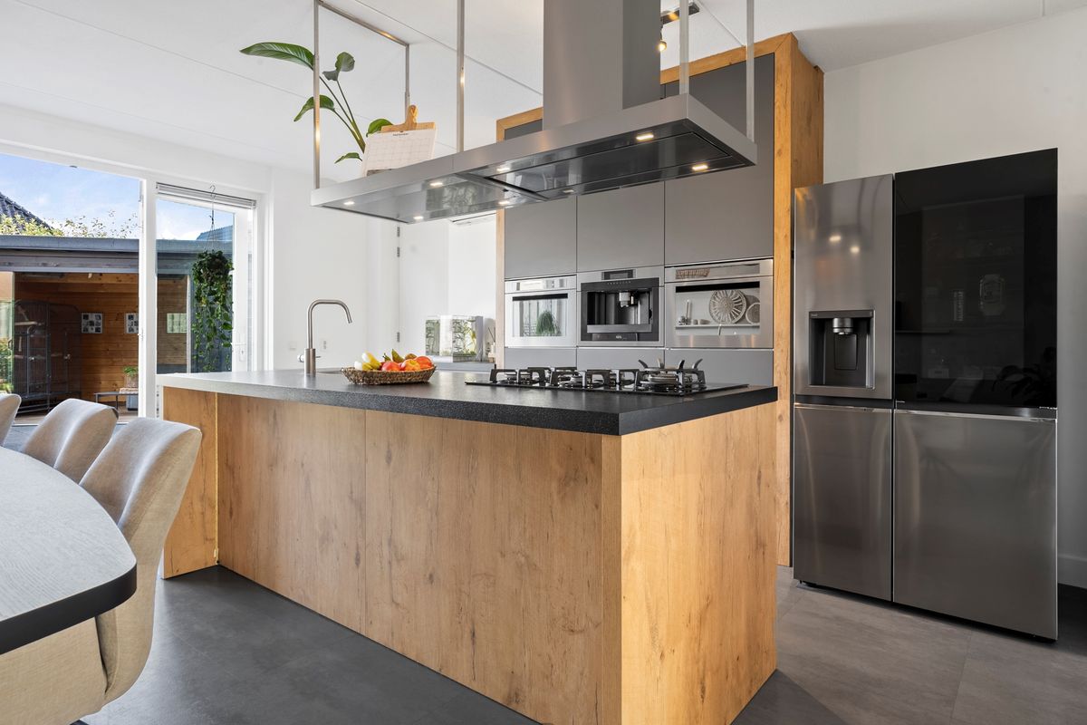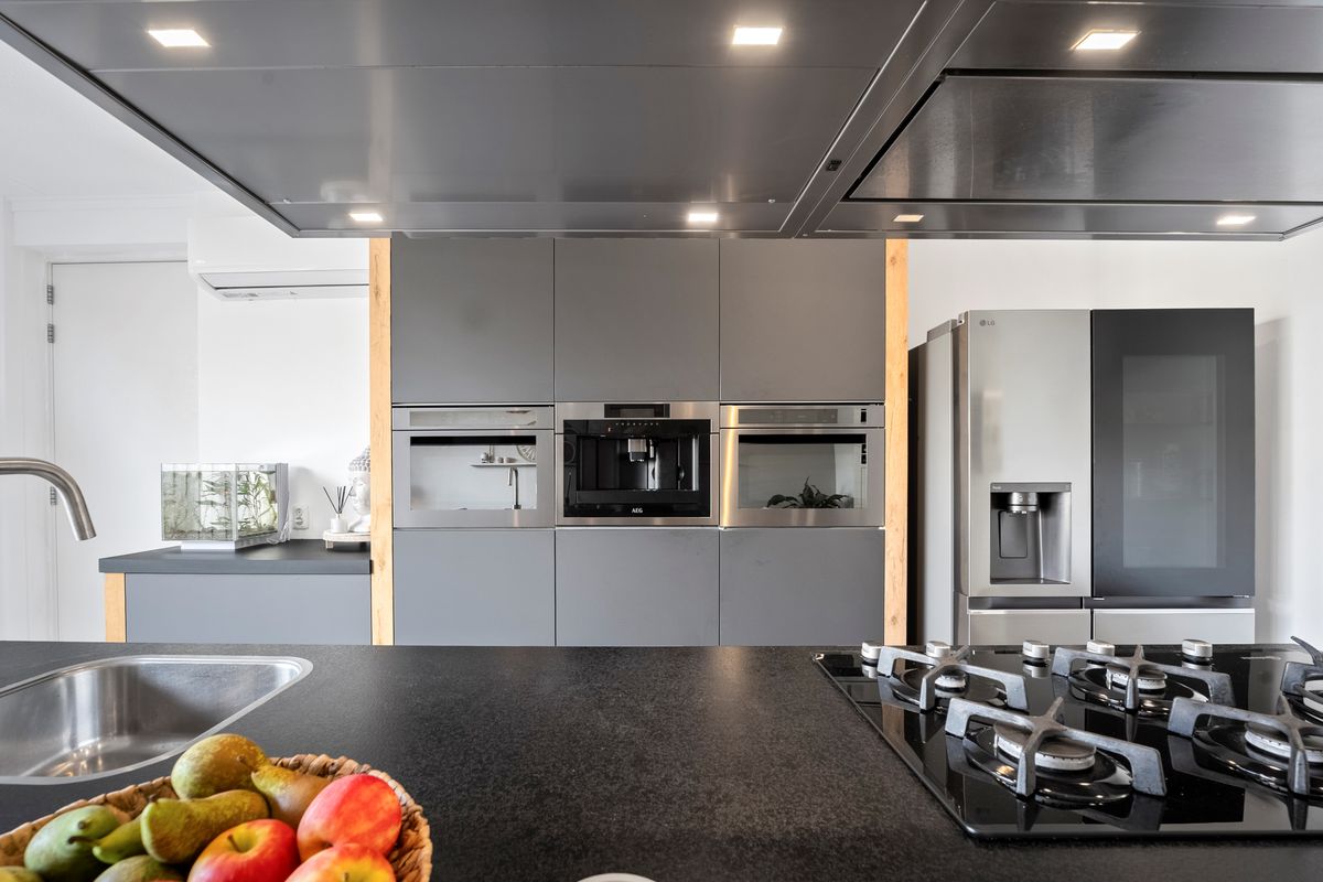 De woonkamer, keuken en verbindingsruimte daartussen vormen samen één bijzonder royale, daglichtvolle en voelbaar fijne leefruimte. Aan de achterzijde zorgen openslaande tuindeuren niet alleen in de zomer voor een directe verbinding met buiten, maar ook in de winter – dankzij de verruimende zichtlijnen op tuin en lucht – voor een heerlijk ruimtelijk gevoel. De luxe keuken met kookeiland is uitgevoerd met een gaskookplaat (gas op glas), afzuigkap, vaatwasser, Amerikaanse koelkast, oven, combi-oven-magnetron en volop kastruimte.