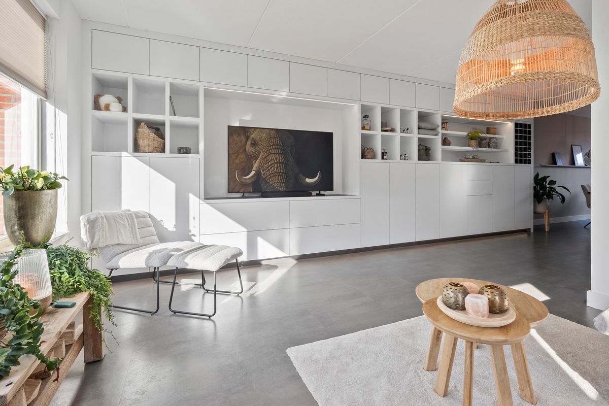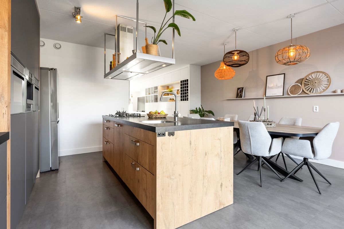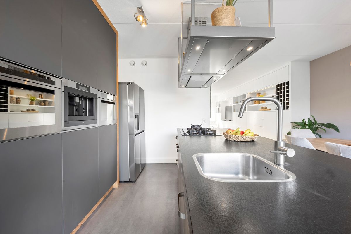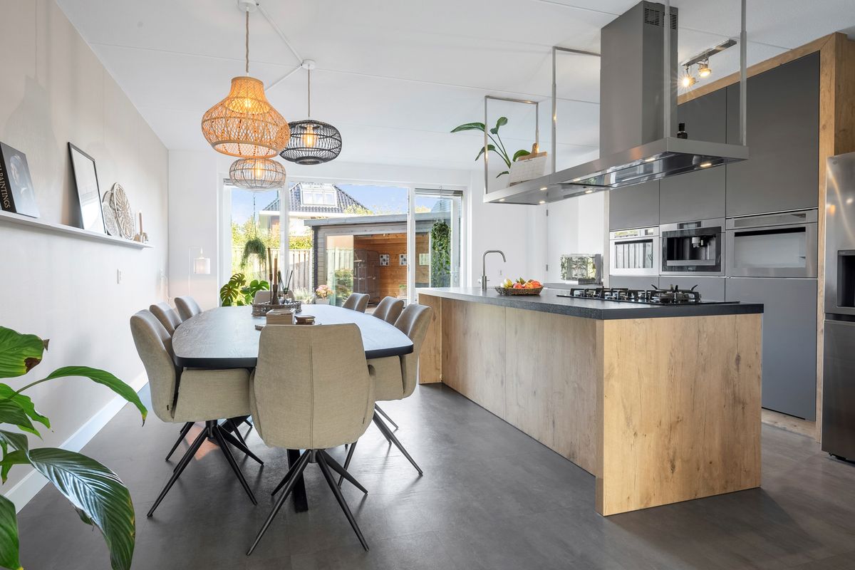 De woonkamer, keuken en verbindingsruimte daartussen vormen samen één bijzonder royale, daglichtvolle en voelbaar fijne leefruimte. Aan de achterzijde zorgen openslaande tuindeuren niet alleen in de zomer voor een directe verbinding met buiten, maar ook in de winter – dankzij de verruimende zichtlijnen op tuin en lucht – voor een heerlijk ruimtelijk gevoel. De luxe keuken met kookeiland is uitgevoerd met een gaskookplaat (gas op glas), afzuigkap, vaatwasser, Amerikaanse koelkast, oven, combi-oven-magnetron en volop kastruimte.
