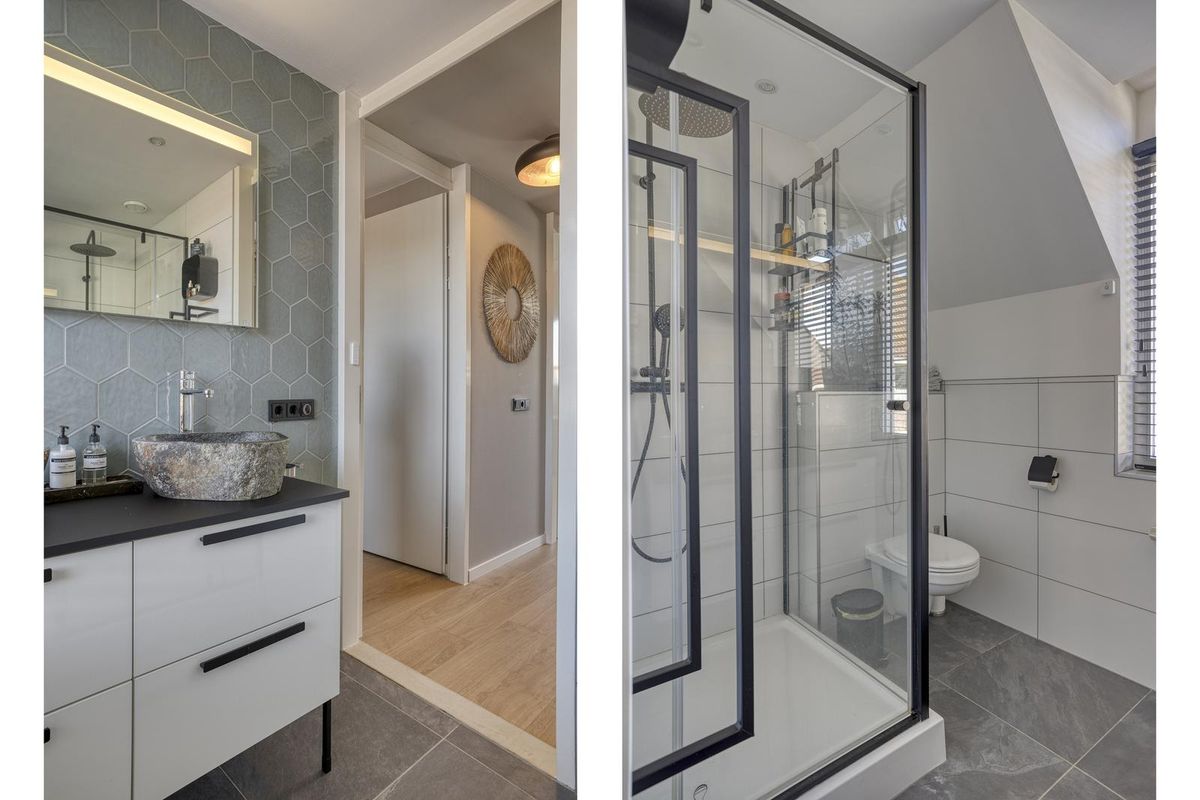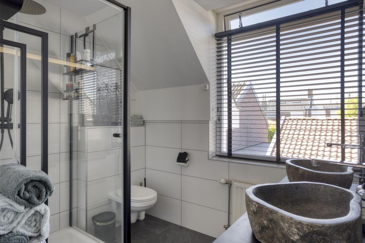 Eerste verdieping Deze verdieping is volledig voorzien van een laminaatvloer, gestucte wanden en een spackwerk plafond, met uitzondering van de badkamer. Er zijn twee slaapkamers en een luxe badkamer met betegelde vloer en wanden, gestuct plafond, inloopdouche, dubbel wastafelmeubel, verwarmde en verlichte spiegel en toilet. Ook deze verdieping is voorzien van vloerverwarming.