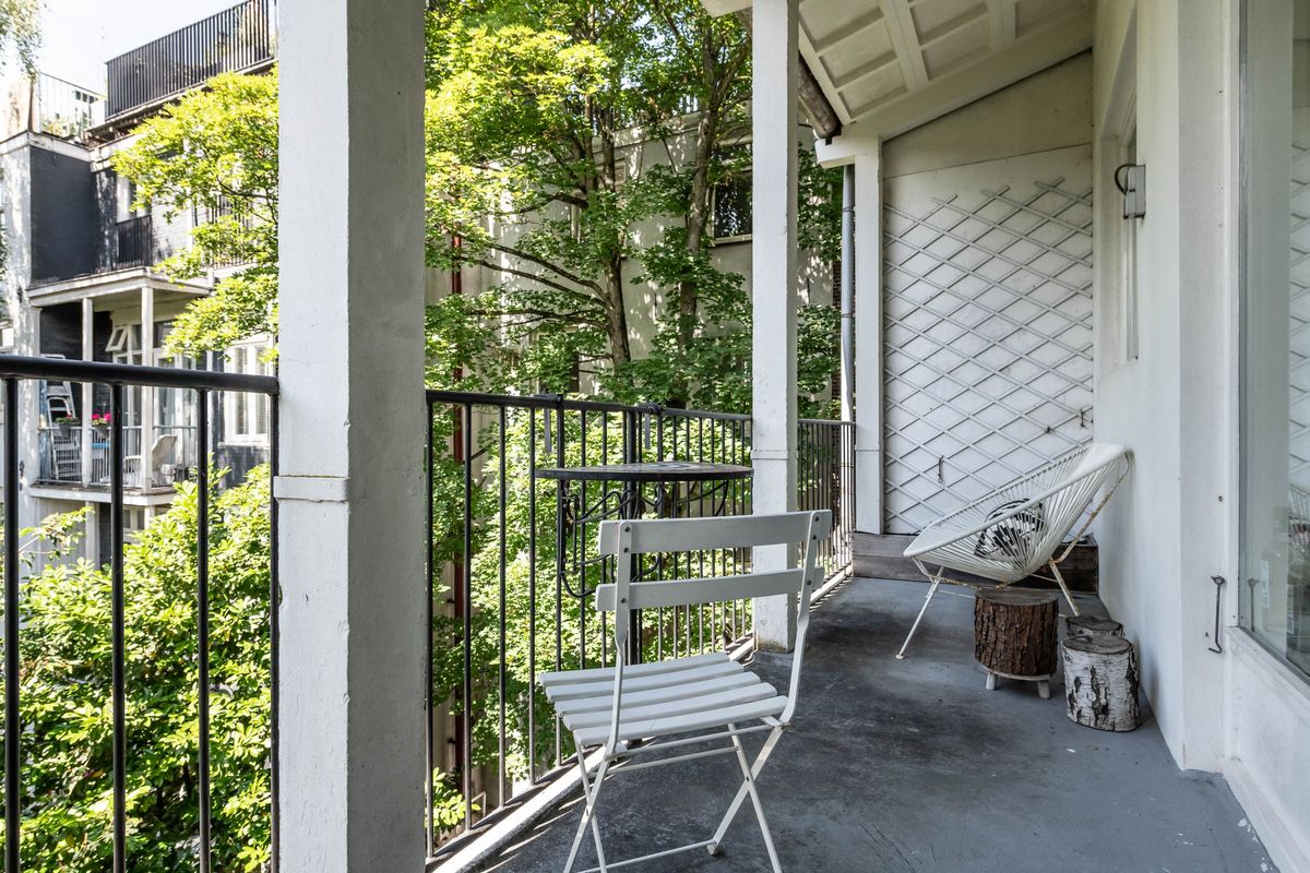 (waarbij de zijkamer aan de voorzijde met de woonkamer is samengevoegd), een frans balkon aan de voorzijde en een balkon aan de achterzijde.
