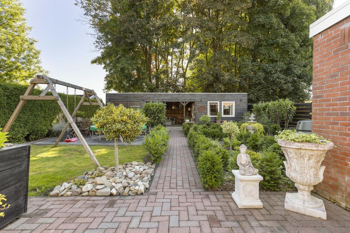 De achtertuin is ideaal gelegen op het zuidoosten. Achterin de tuin staat een fraai en ruim houten bijgebouw met een geïsoleerde en verwarmde tuinkamer waar je prima kunt werken of logeren. Daarbij is er een overkapping en een schuur. Aan de zijkant van de woning staat de stenen garage met elektra en een carport. Eigen oprit met genoeg ruimte voor meerdere auto’s.