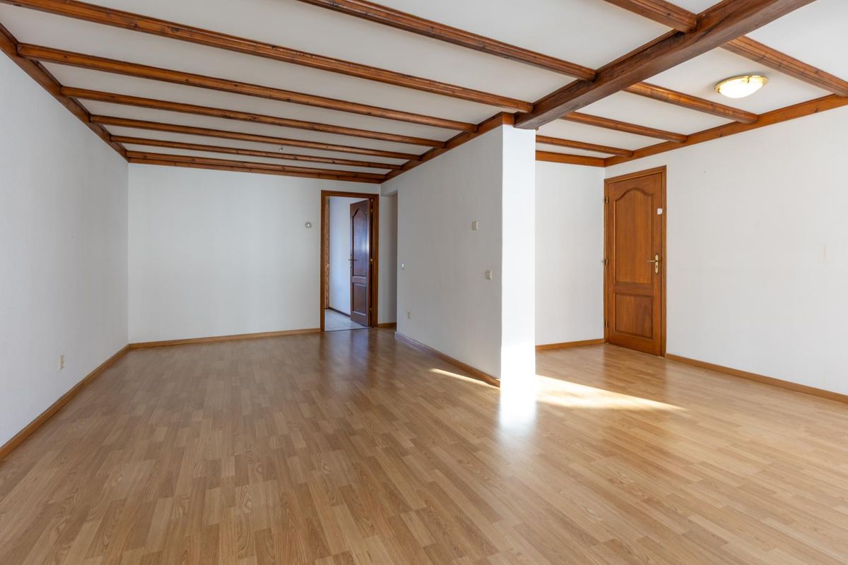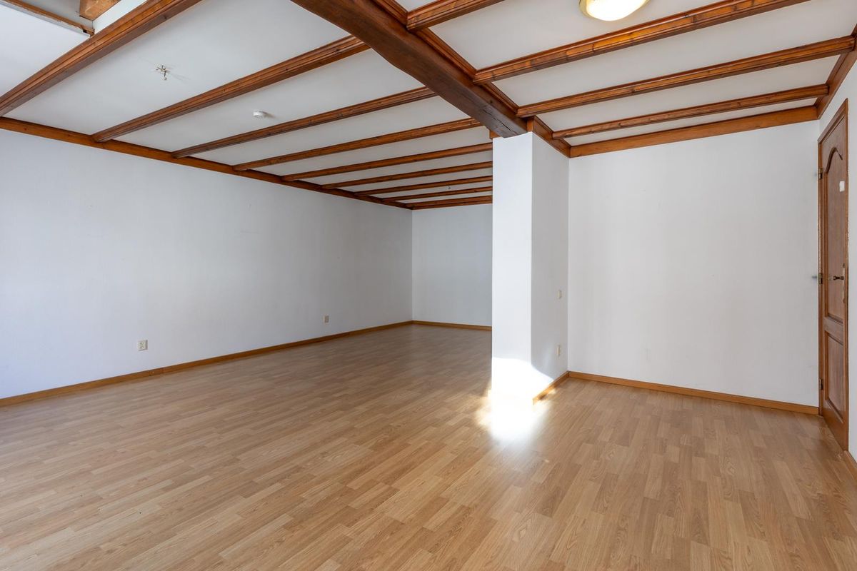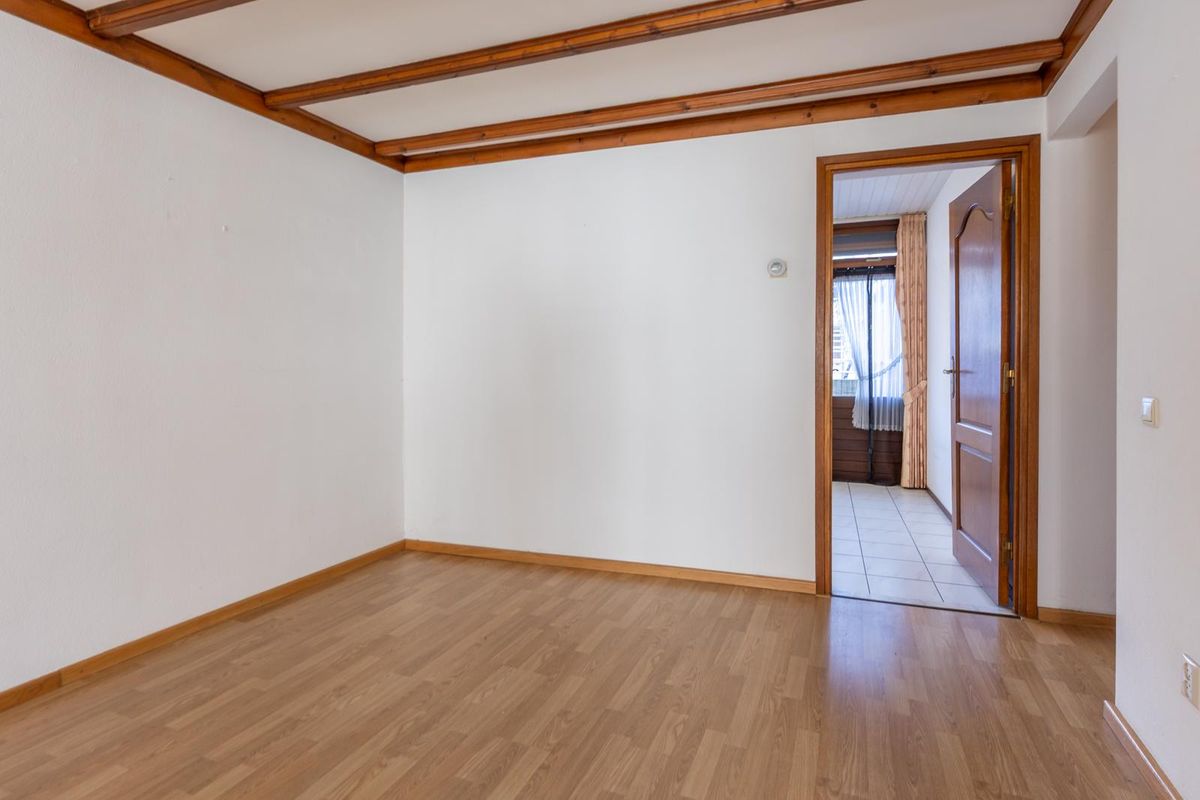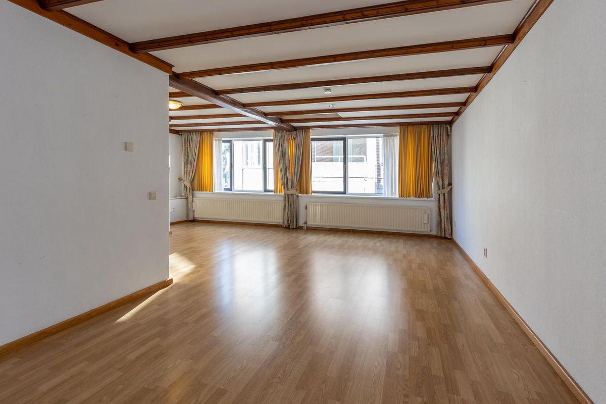 Woonkamer (circa32m2) met laminaatvloer, gelegen aan de voorzijde met zicht op de winkelstraat.