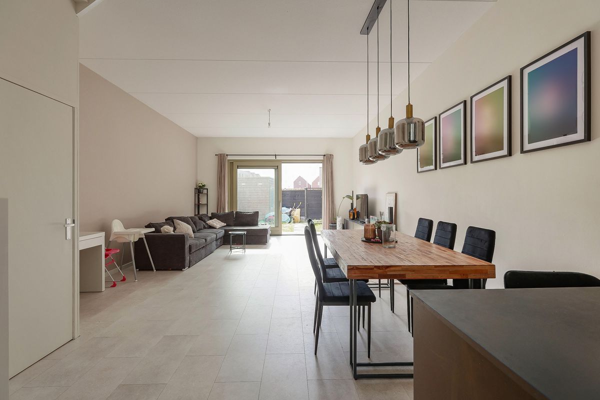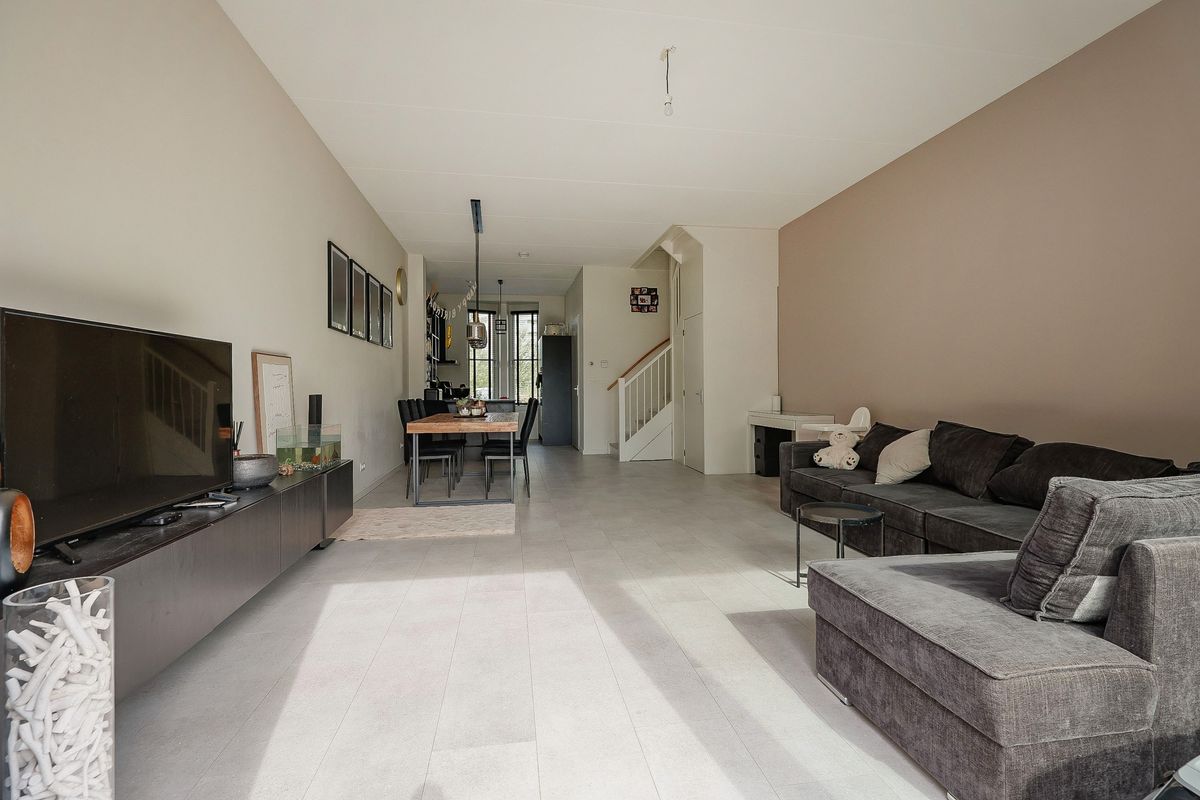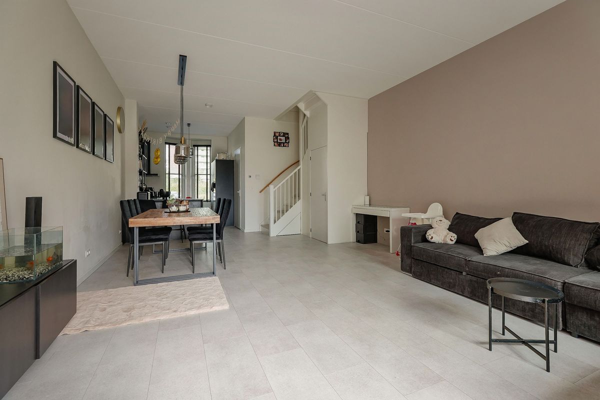 De lichte woonkamer beschikt over grote raampartijen, een trapkast en een schuifpui naar de achtertuin. Hier is voldoende ruimte voor een gezellige zithoek en een royale eettafel. De gehele begane grond is voorzien van een strakke PVC-vloer met vloerverwarming.