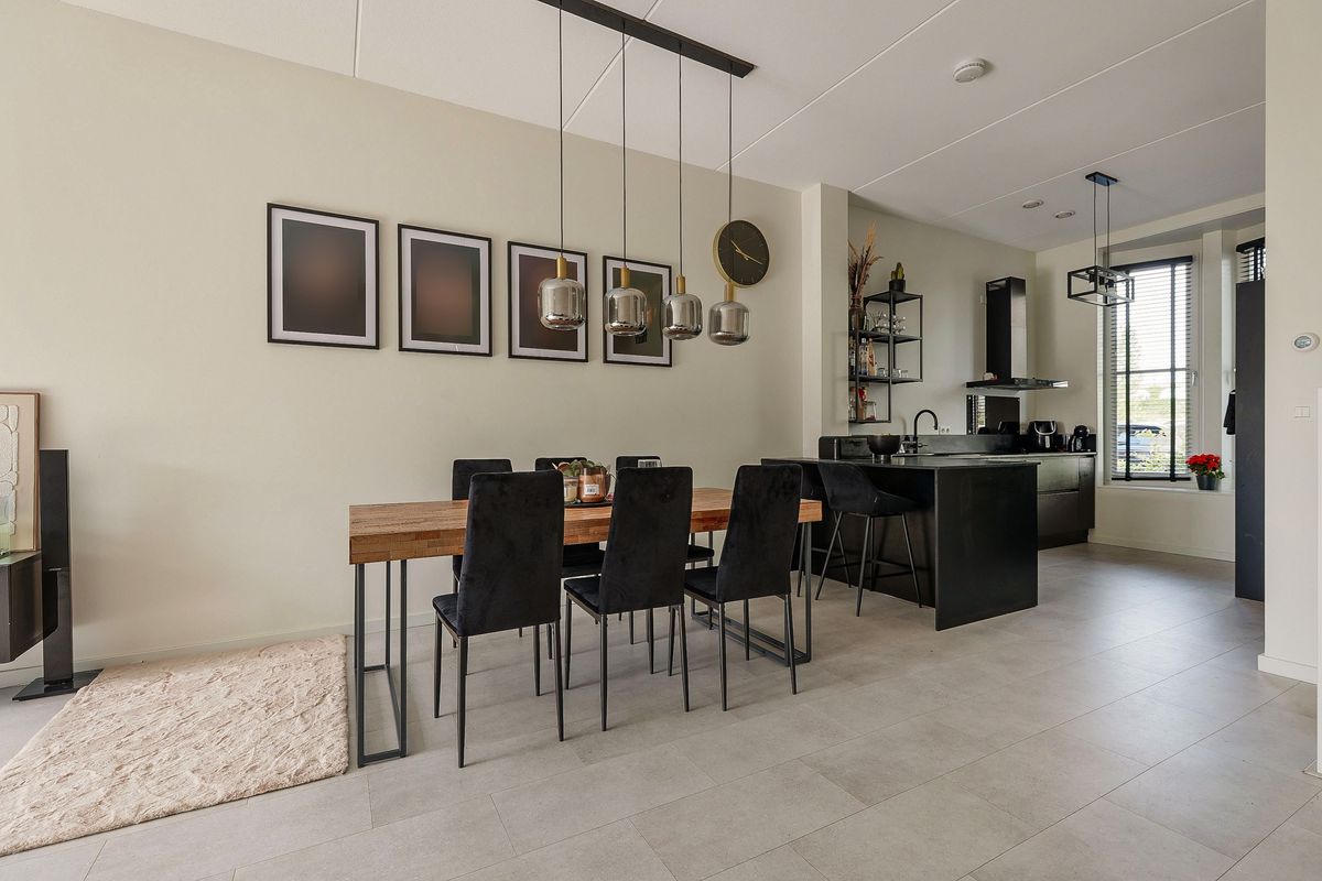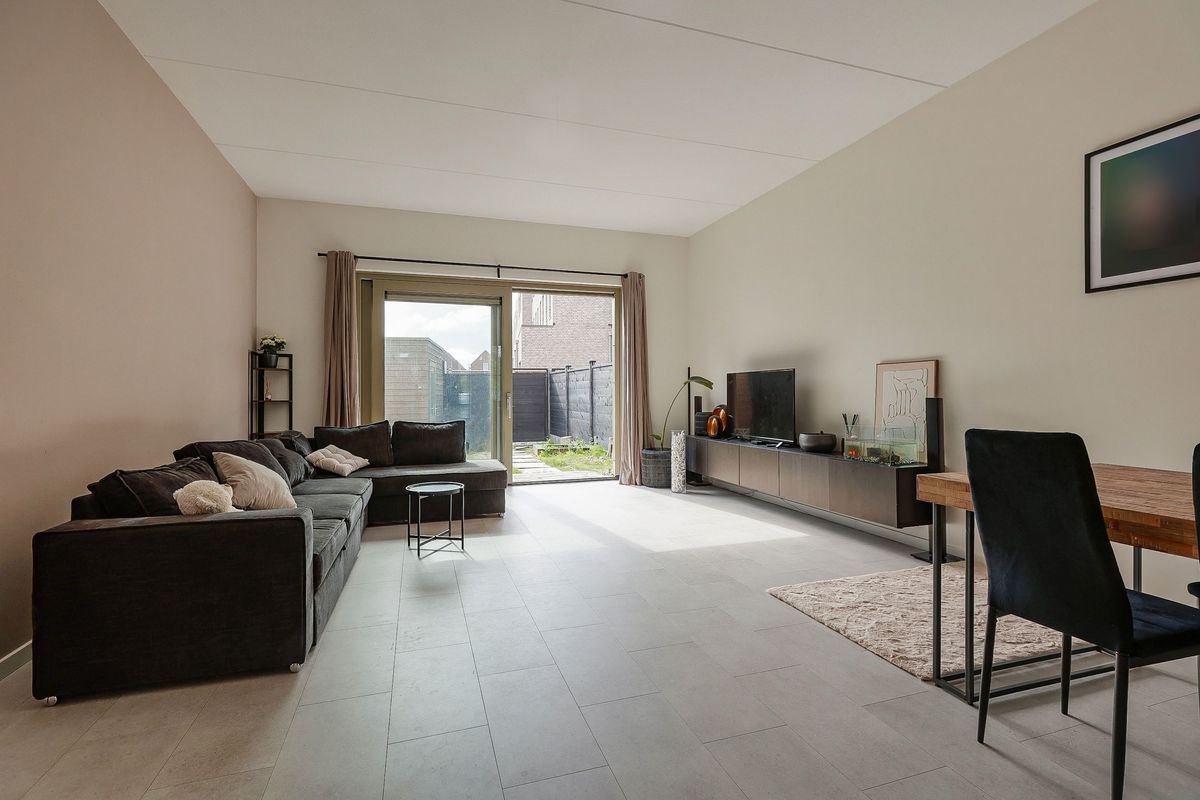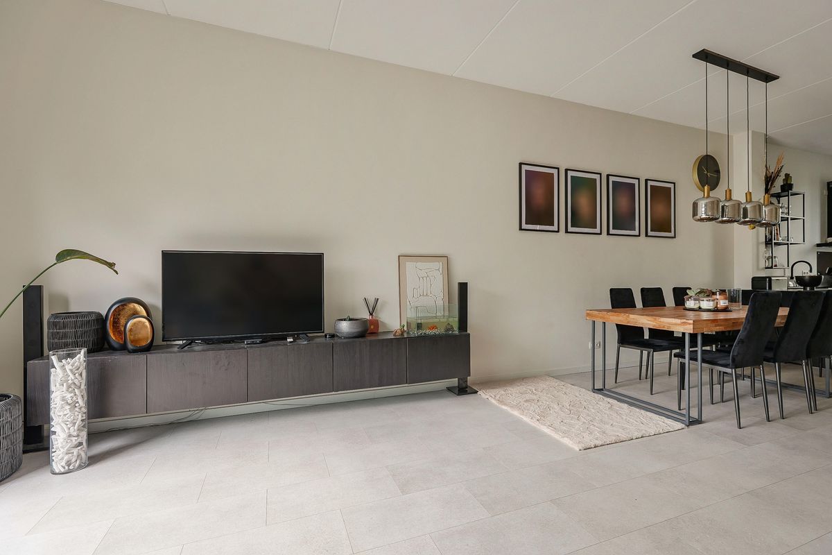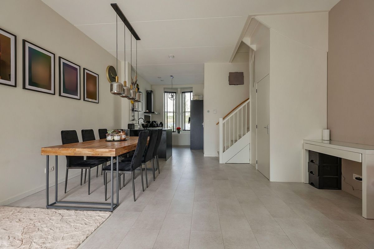 De lichte woonkamer beschikt over grote raampartijen, een trapkast en een schuifpui naar de achtertuin. Hier is voldoende ruimte voor een gezellige zithoek en een royale eettafel. De gehele begane grond is voorzien van een strakke PVC-vloer met vloerverwarming.