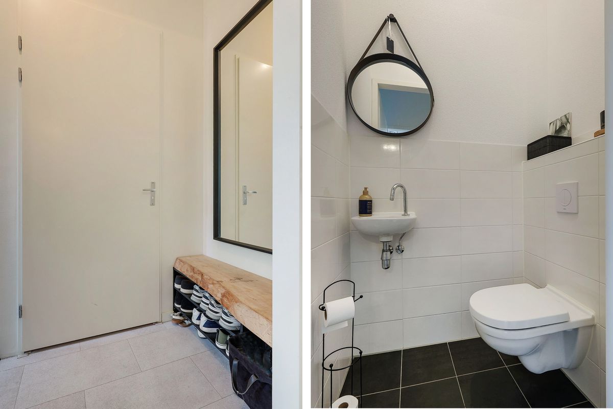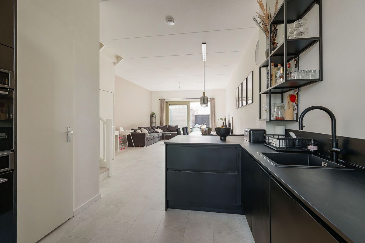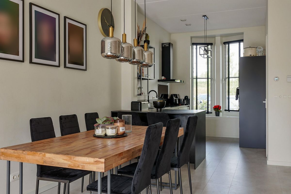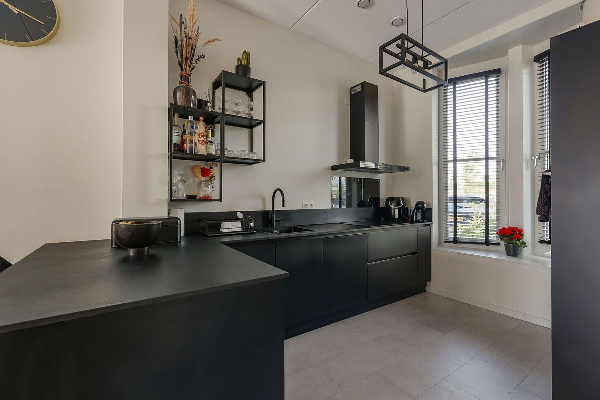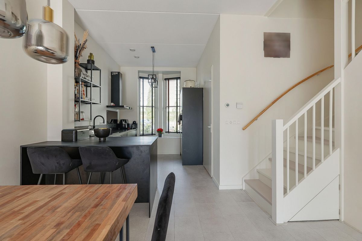 Through the well-maintained front garden, you enter the hallway with toilet and meter cupboard. The modern parallel kitchen is located at the front and equipped with high-quality built-in appliances, including an induction hob, dishwasher, combi-oven, separate oven, fridge-freezer, extractor, and a Quooker tap. From here, you have an open view of the greenery.