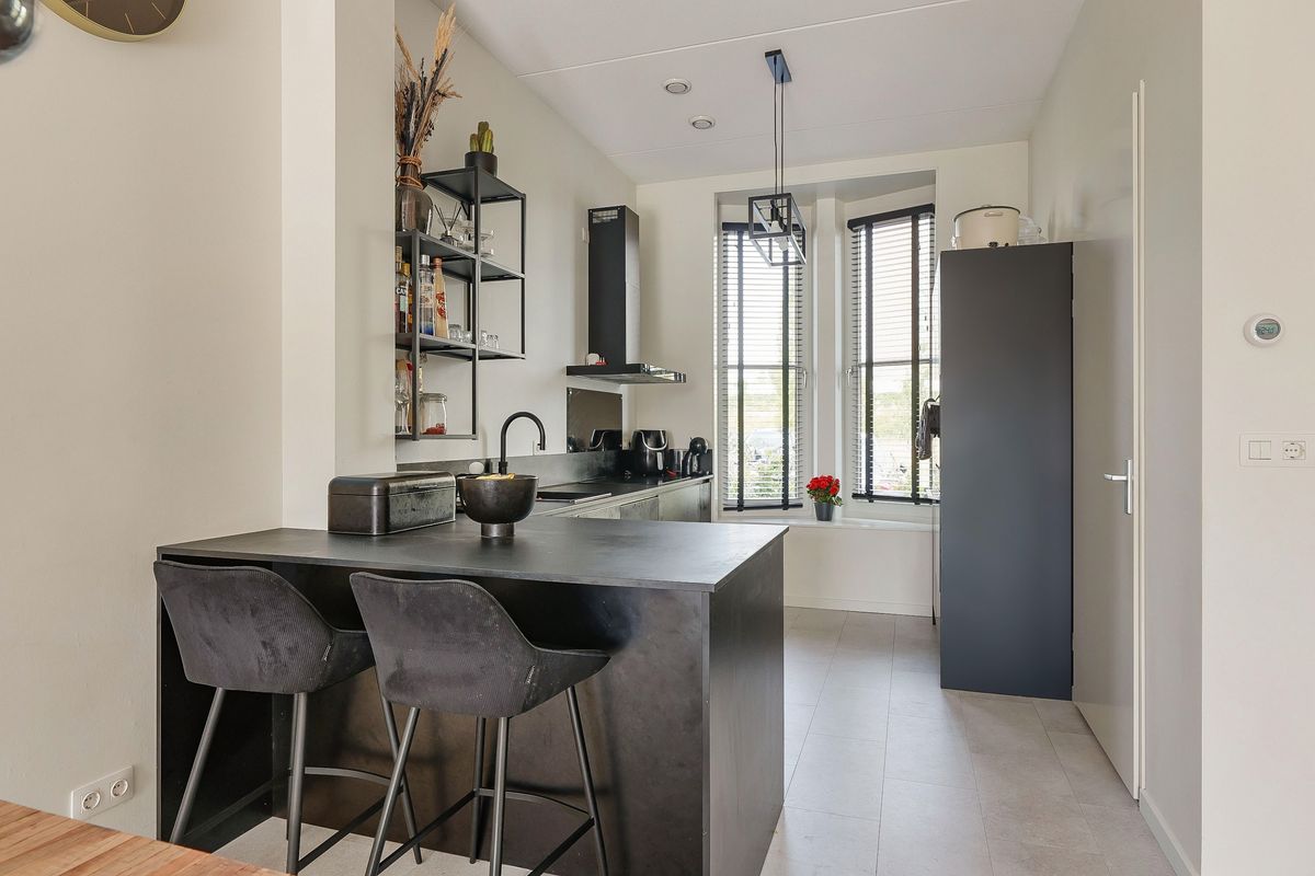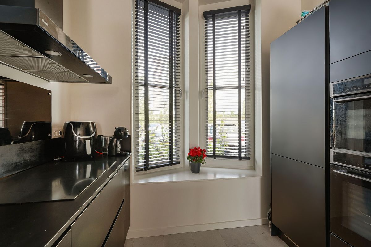 Via de verzorgde voortuin bereik je de entree met hal, toilet en meterkast. De moderne keuken in parallelopstelling bevindt zich aan de voorzijde en is voorzien van hoogwaardige inbouwapparatuur, waaronder een inductiekookplaat, vaatwasser, combi-oven, oven, koel-vriescombinatie, afzuiginstallatie én een Quooker. Vanuit hier heb je vrij uitzicht op het groen.