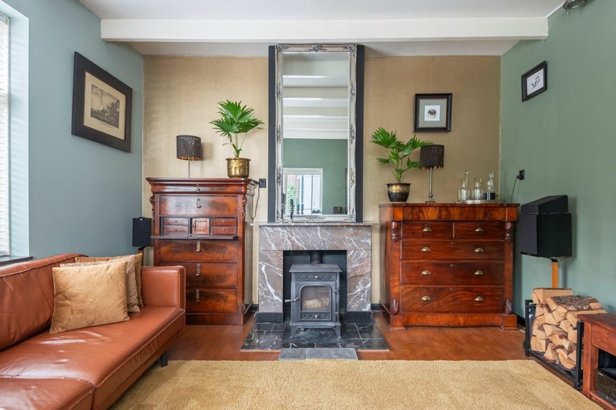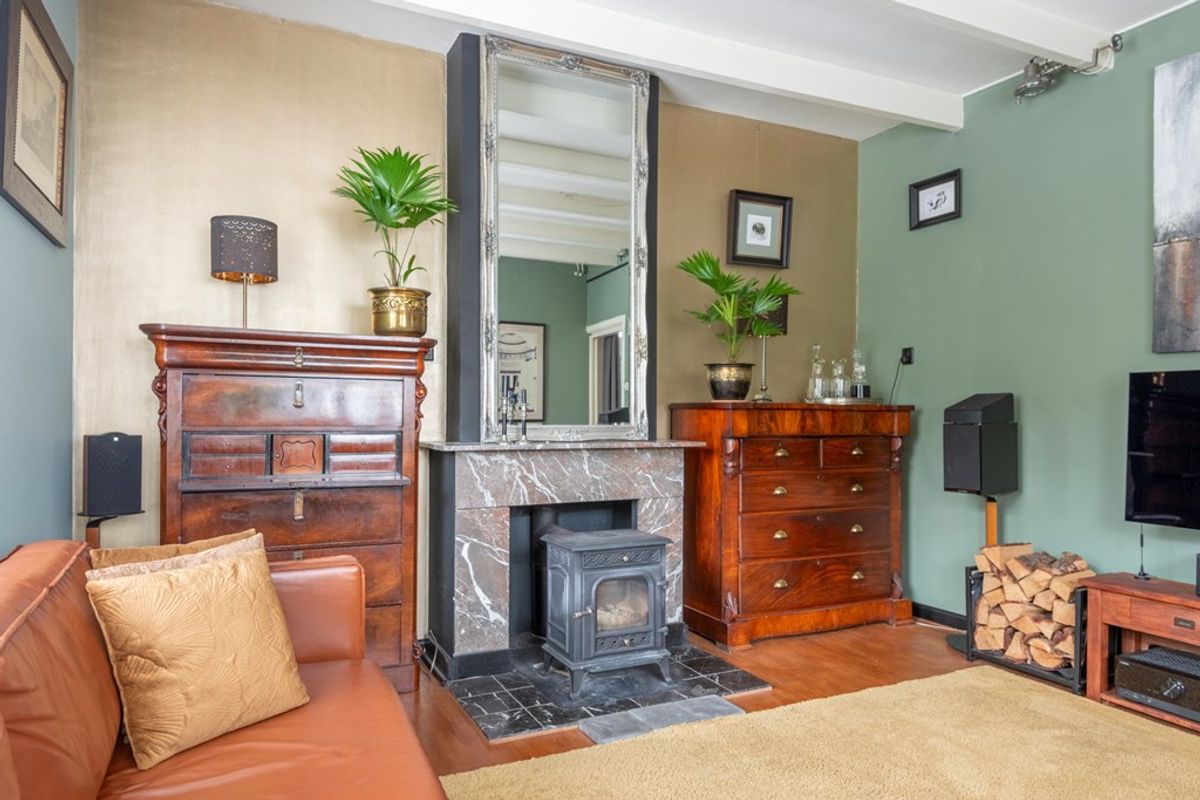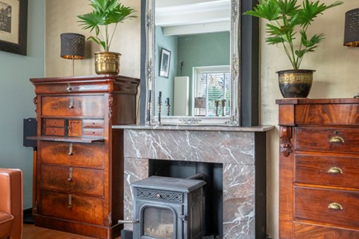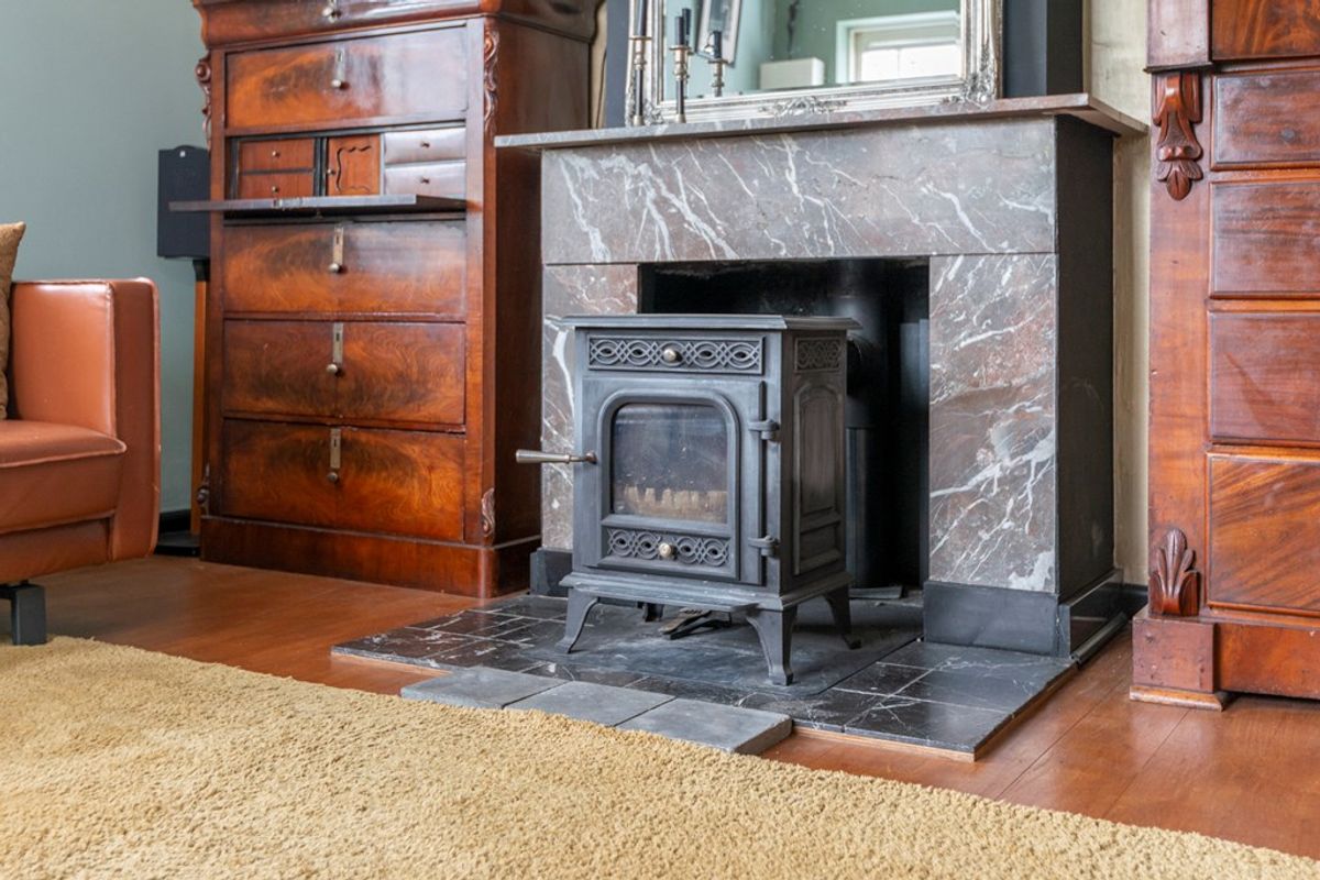 De woonkamer met een lamelparketvloer in combinatie met glad gestuucte wanden en een hoog plafond met de originele balken, afgewisseld door glad stucwerk, geven deze woonkamer een stijlvolle uitstraling De marmeren schouw met een houtkachel is de “finishing touch” van de woonkamer.