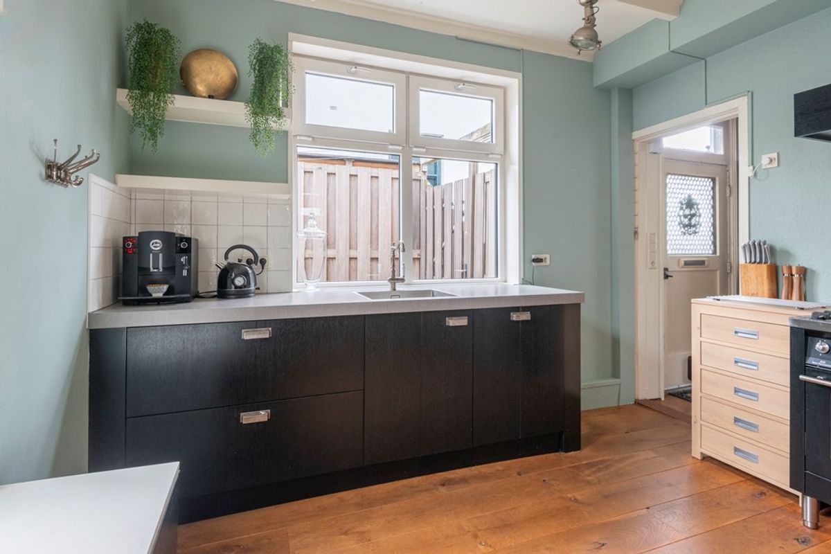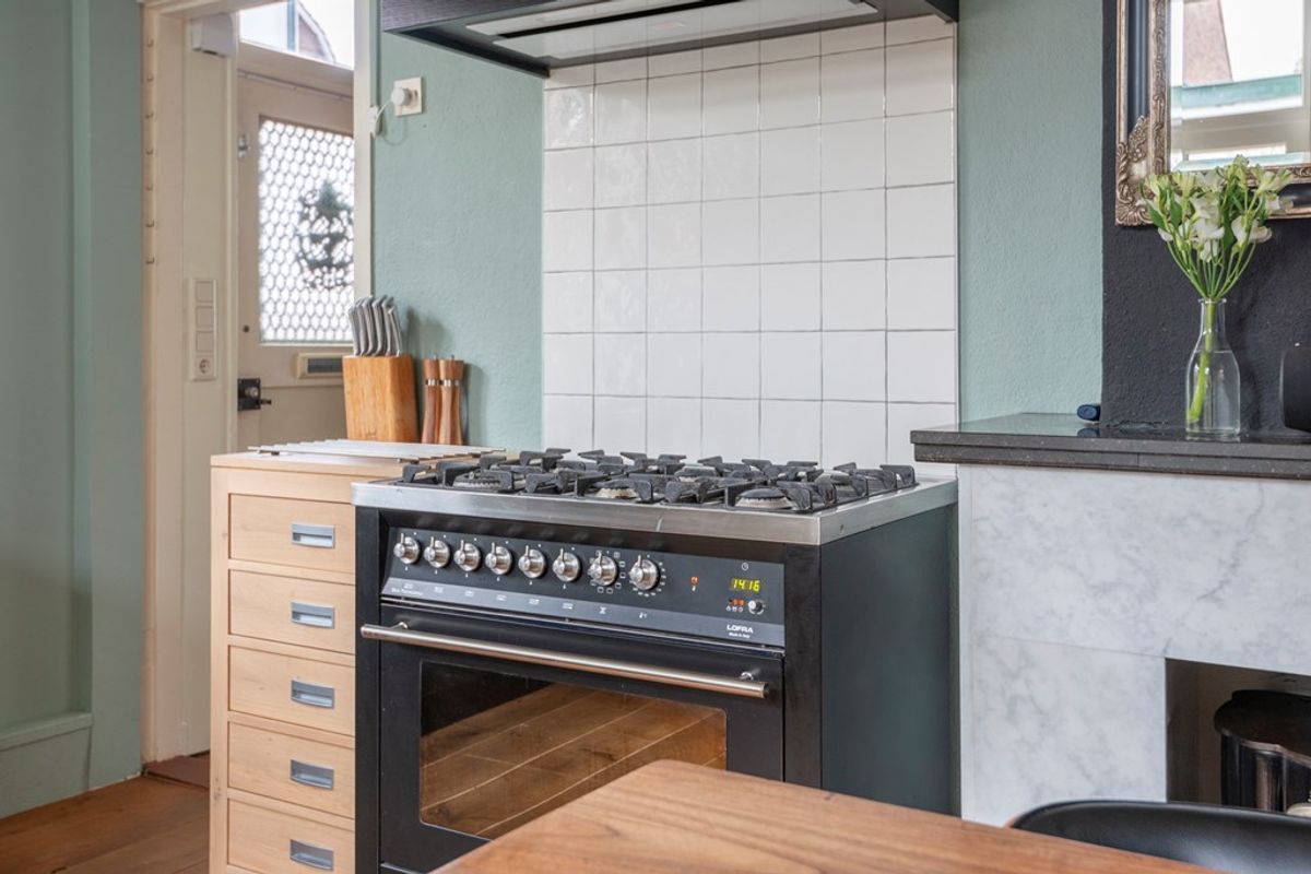 Aan de tuinzijde ligt de ruime woonkeuken. Ook hier weer de fraaie afwerking met een eiken vloer, glad gestuukte wanden en het balkenplafond. In deze ruimte is ook een marmeren schouw aanwezig, weliswaar niet aangesloten op een 2e schoorsteen maar daarom niet minder fraai. De keuken dateert uit 2015, heeft een opstelling over twee wanden met de volgende apparatuur: Een 6 pits gasfornuis met een elektrische oven met afzuigkap, vaatwasser en een losse koelkast. Er zijn voldoende kastjes en laden voor het opbergen van uw keukenspullen. Door raampartijen aan twee zijden is er een goede natuurlijke lichtinval en goede ventilatie van de ruimte.