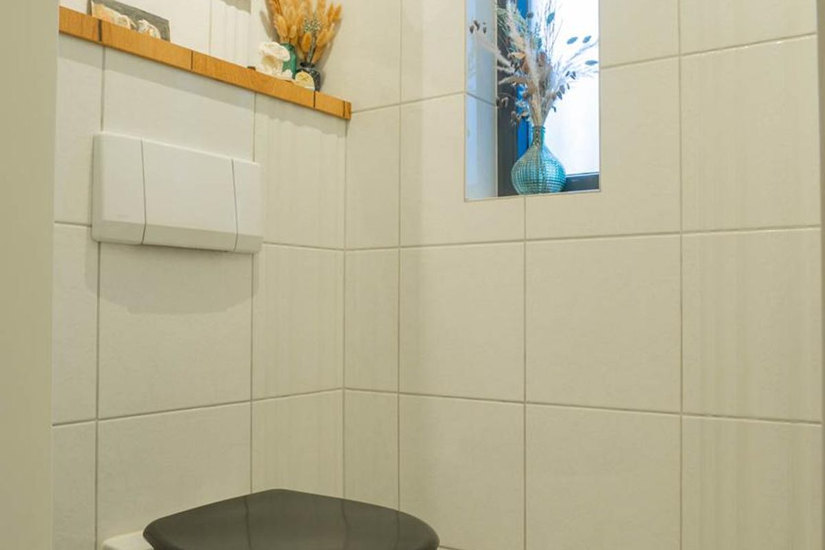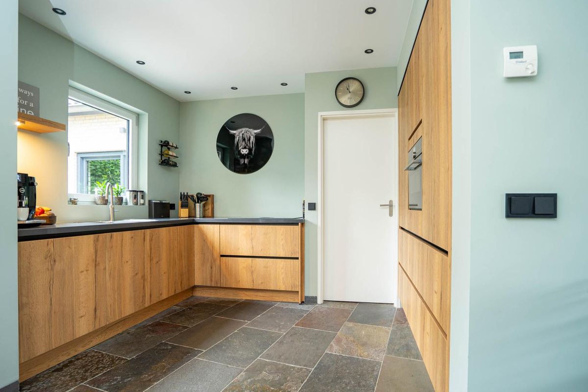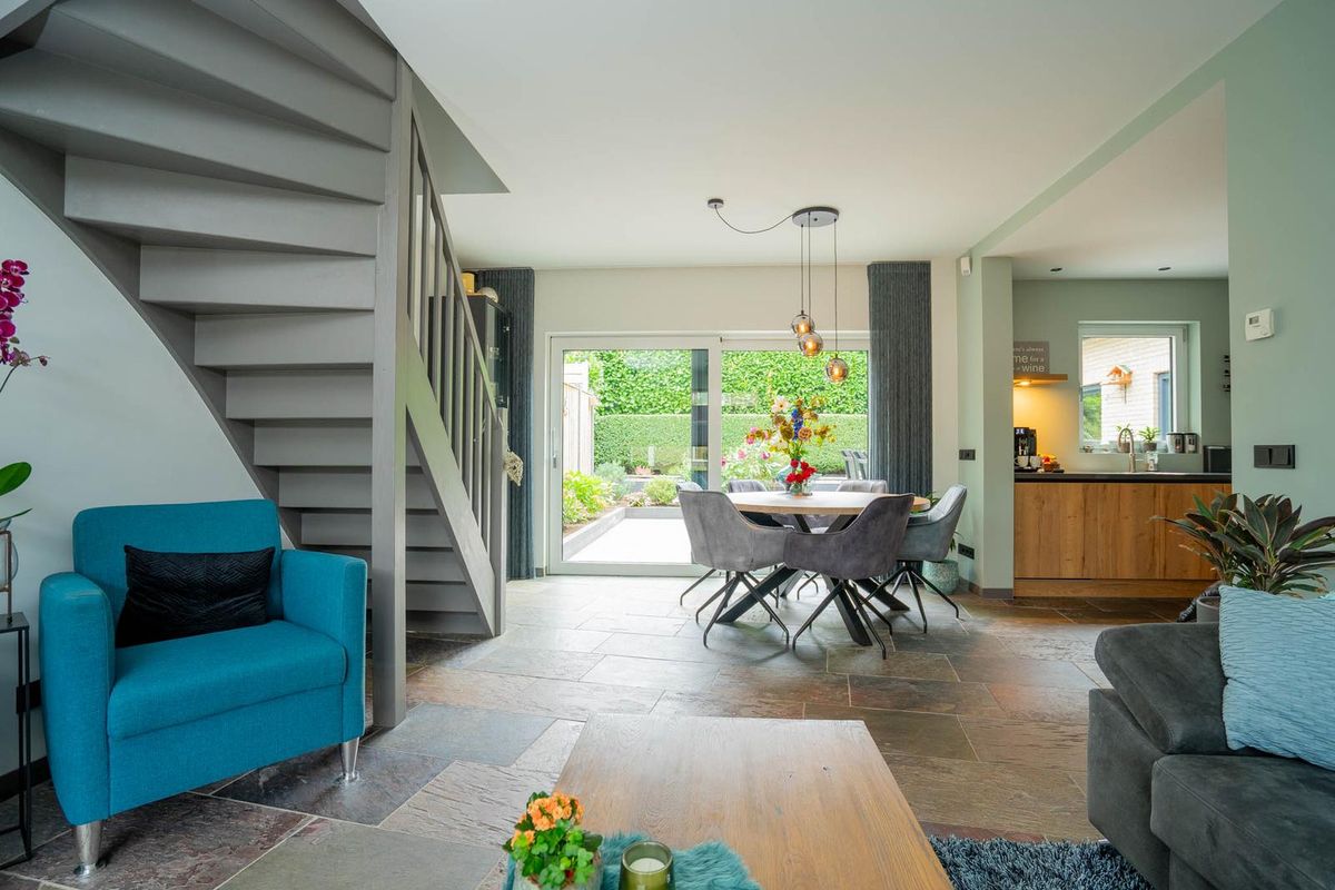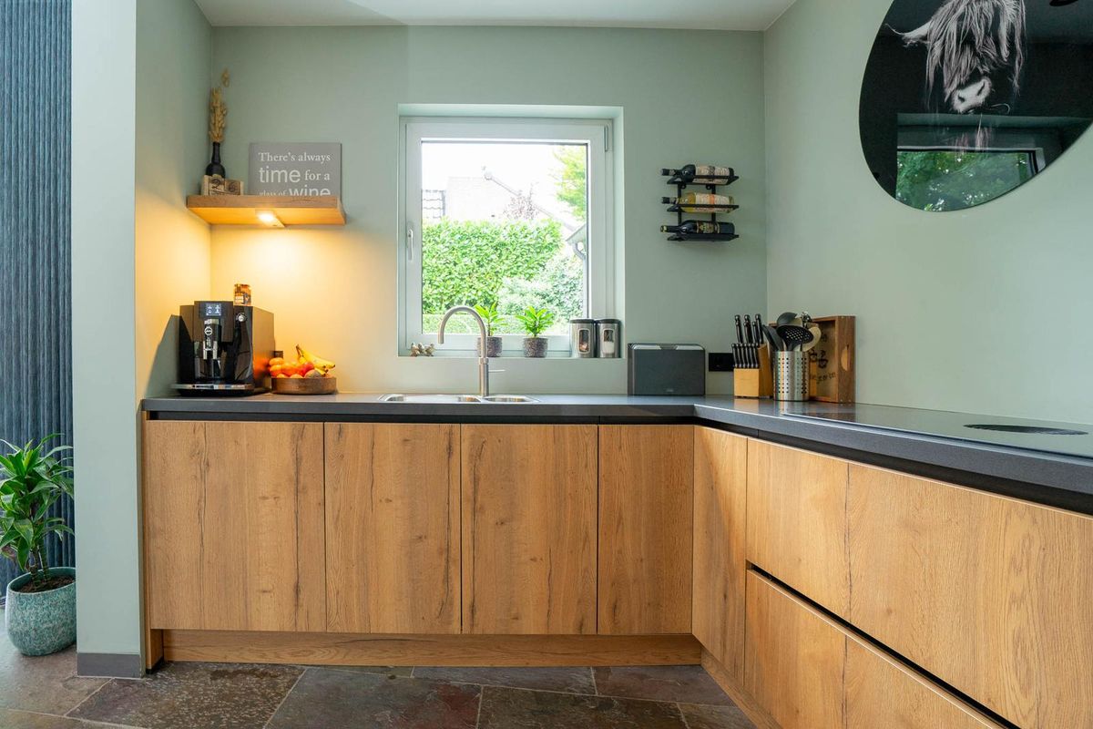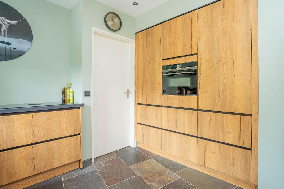 De woonkamer is knus en licht dankzij de grote raampartijen. De tegelvloer met vloerverwarming, hor bij de tuindeur en strak gestuukte afwerking zorgen voor een aangename sfeer. De keuken, vernieuwd in 2022, is een echte eyecatcher met een moderne houtlook, composiet aanrechtblad en hoogwaardige apparatuur zoals een quooker, inductiekookplaat, combi-oven en meer.