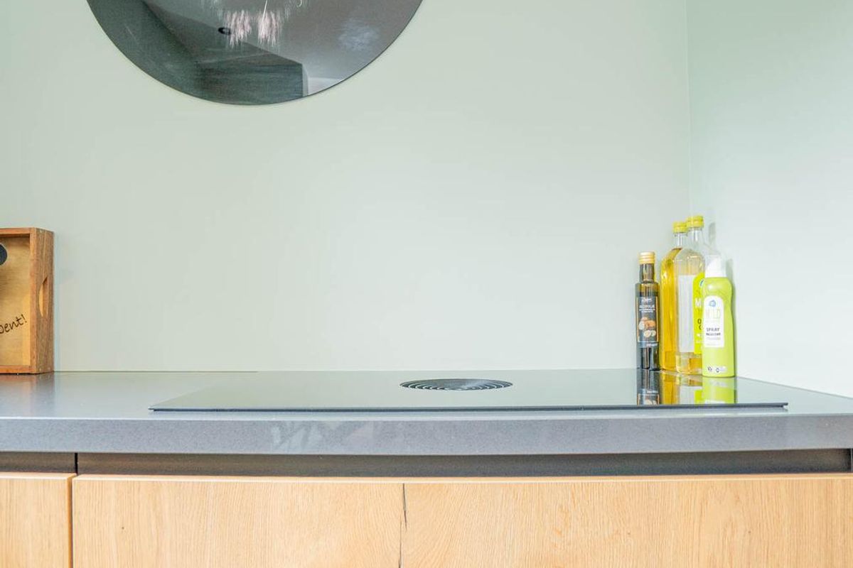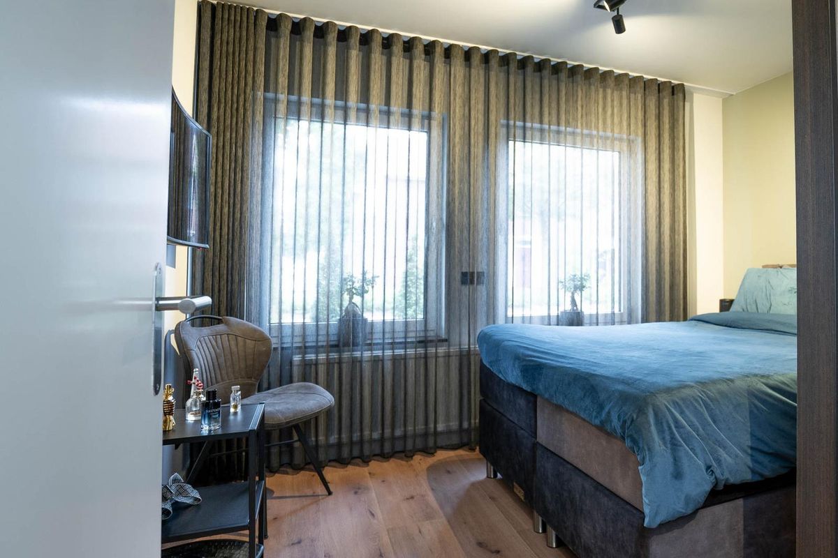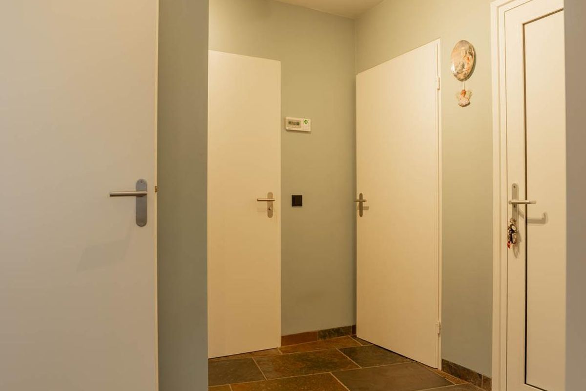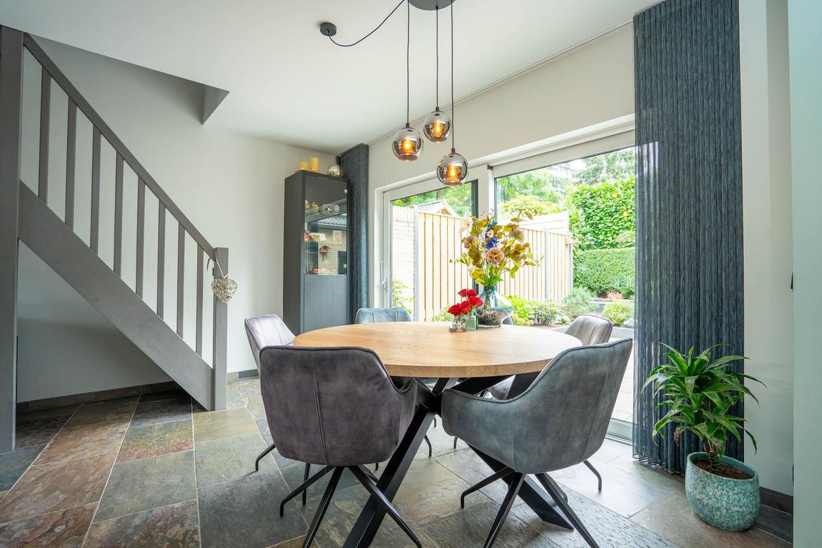 De woonkamer is knus en licht dankzij de grote raampartijen. De tegelvloer met vloerverwarming, hor bij de tuindeur en strak gestuukte afwerking zorgen voor een aangename sfeer. De keuken, vernieuwd in 2022, is een echte eyecatcher met een moderne houtlook, composiet aanrechtblad en hoogwaardige apparatuur zoals een quooker, inductiekookplaat, combi-oven en meer.