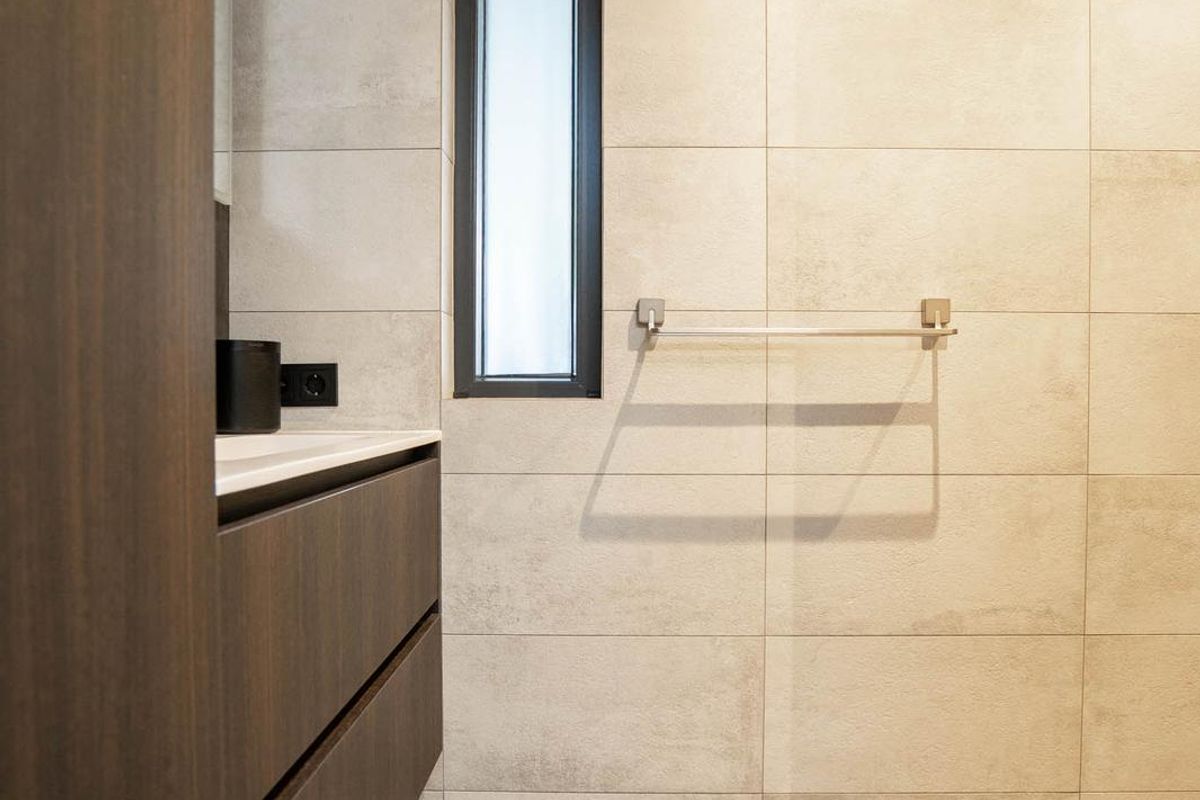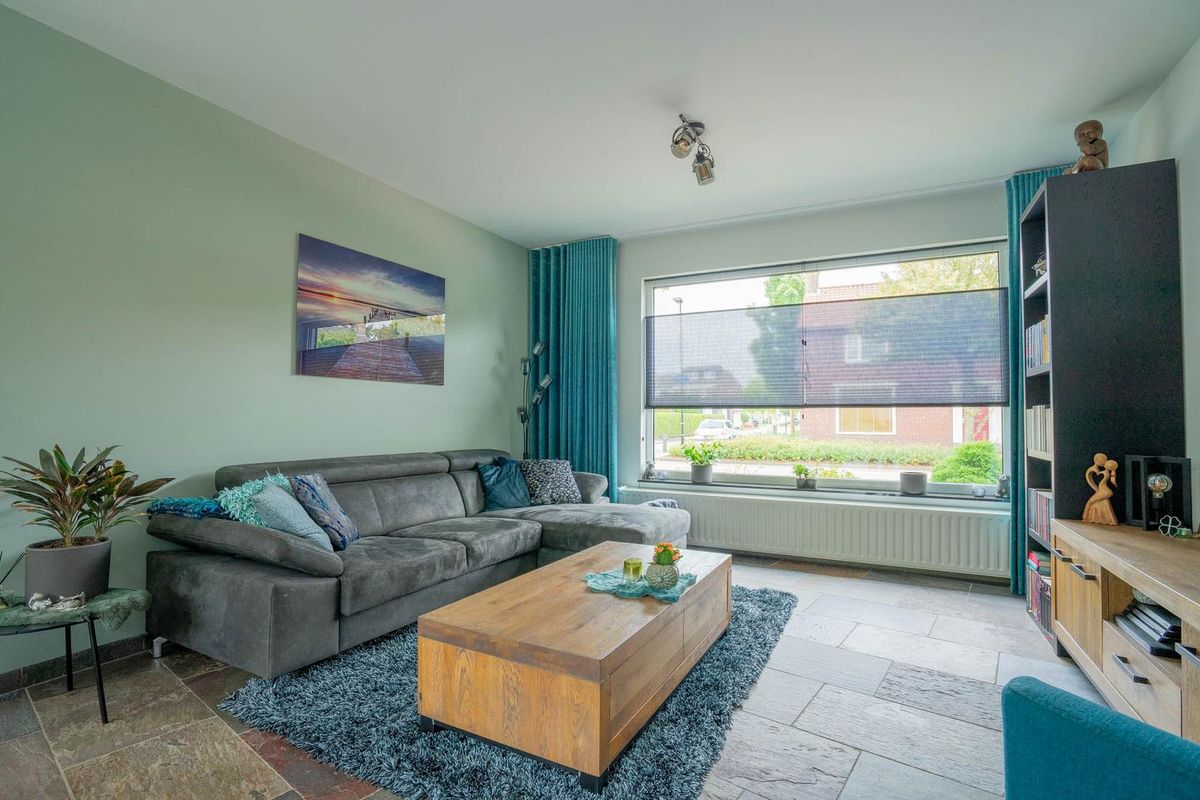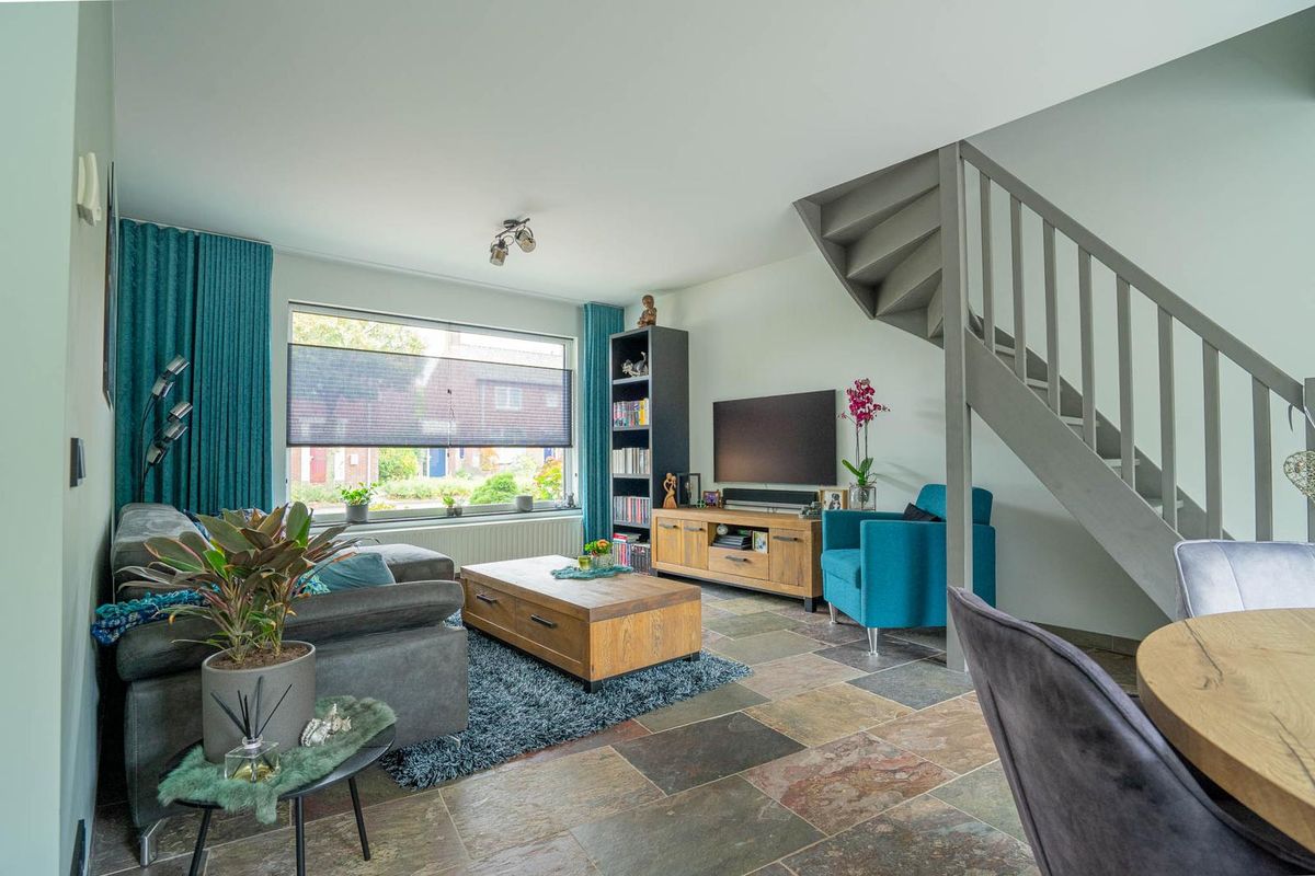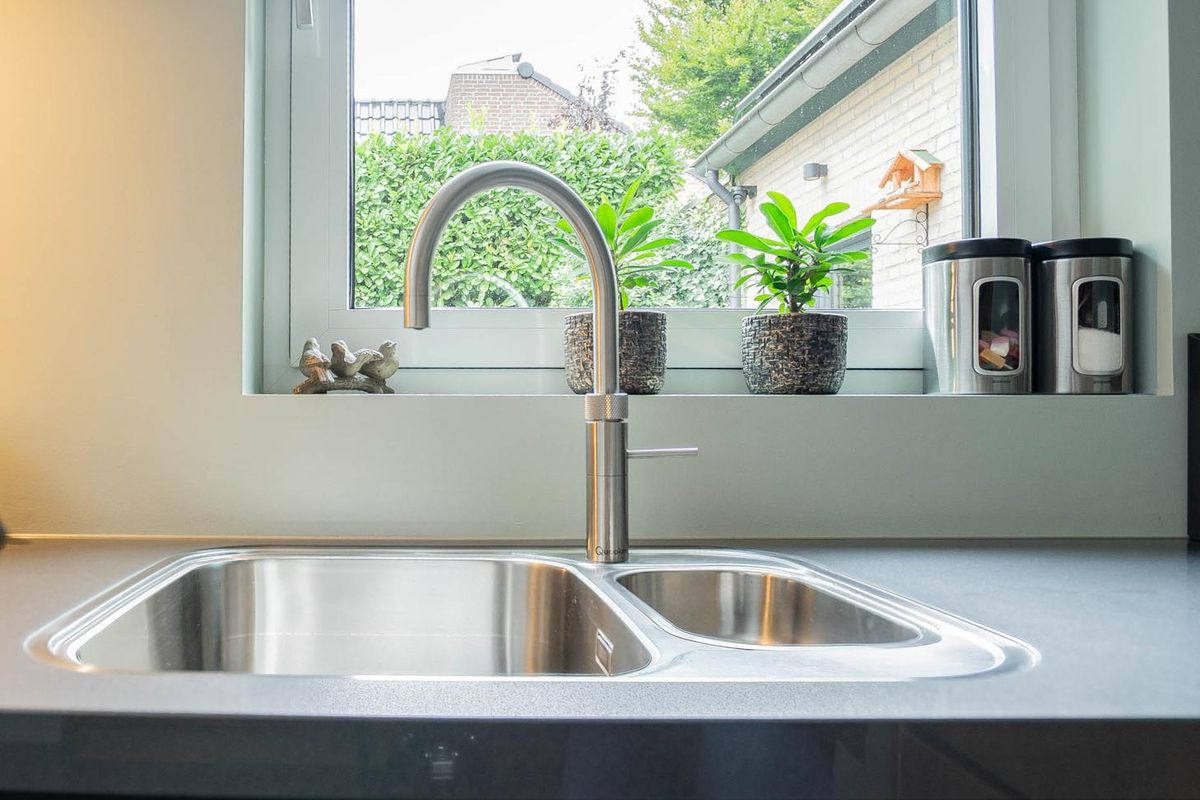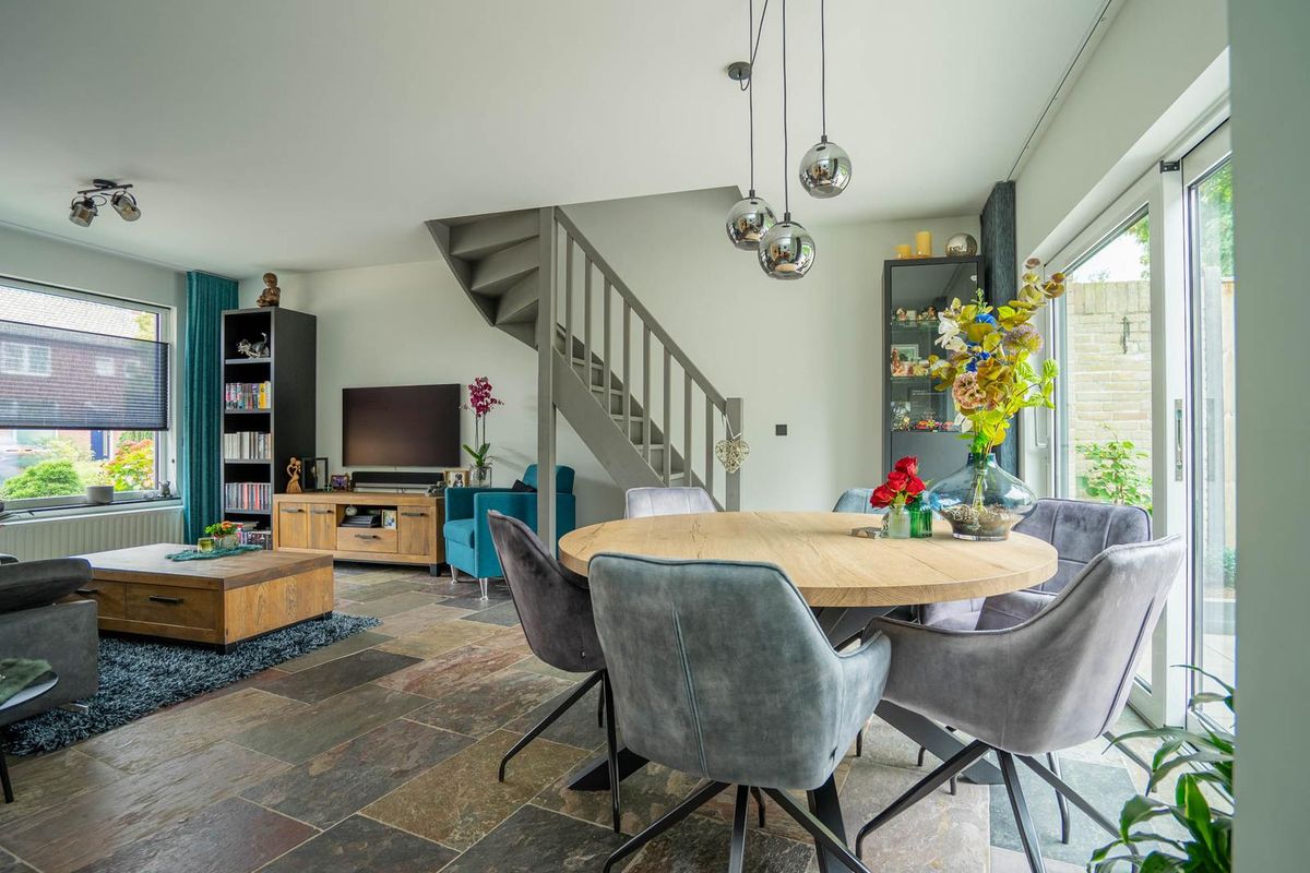 De woonkamer is knus en licht dankzij de grote raampartijen. De tegelvloer met vloerverwarming, hor bij de tuindeur en strak gestuukte afwerking zorgen voor een aangename sfeer. De keuken, vernieuwd in 2022, is een echte eyecatcher met een moderne houtlook, composiet aanrechtblad en hoogwaardige apparatuur zoals een quooker, inductiekookplaat, combi-oven en meer.