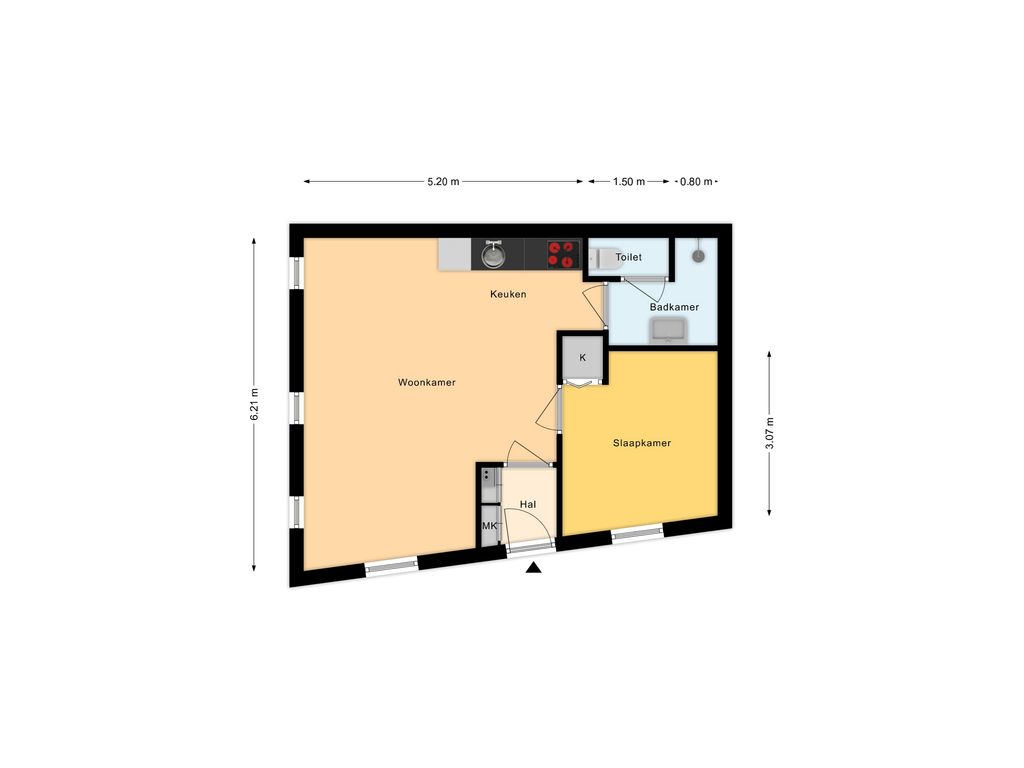 Via je eigen voordeur stap je binnen in de hal met meterkast en cv-ruimte. De woonkamer met open keuken biedt een praktische basis om geheel naar eigen smaak in te richten. De badkamer beschikt over een douche, wastafel en toilet. Verder is er een slaapkamer met vaste kast.