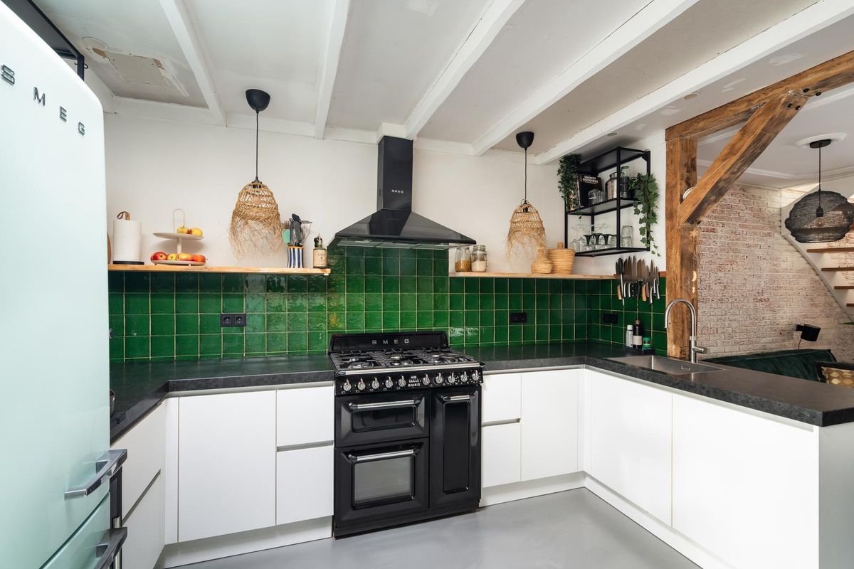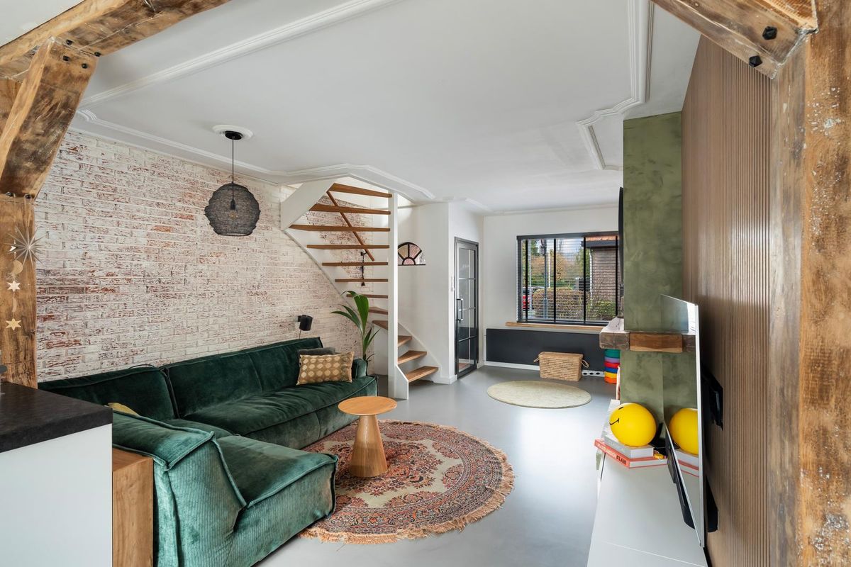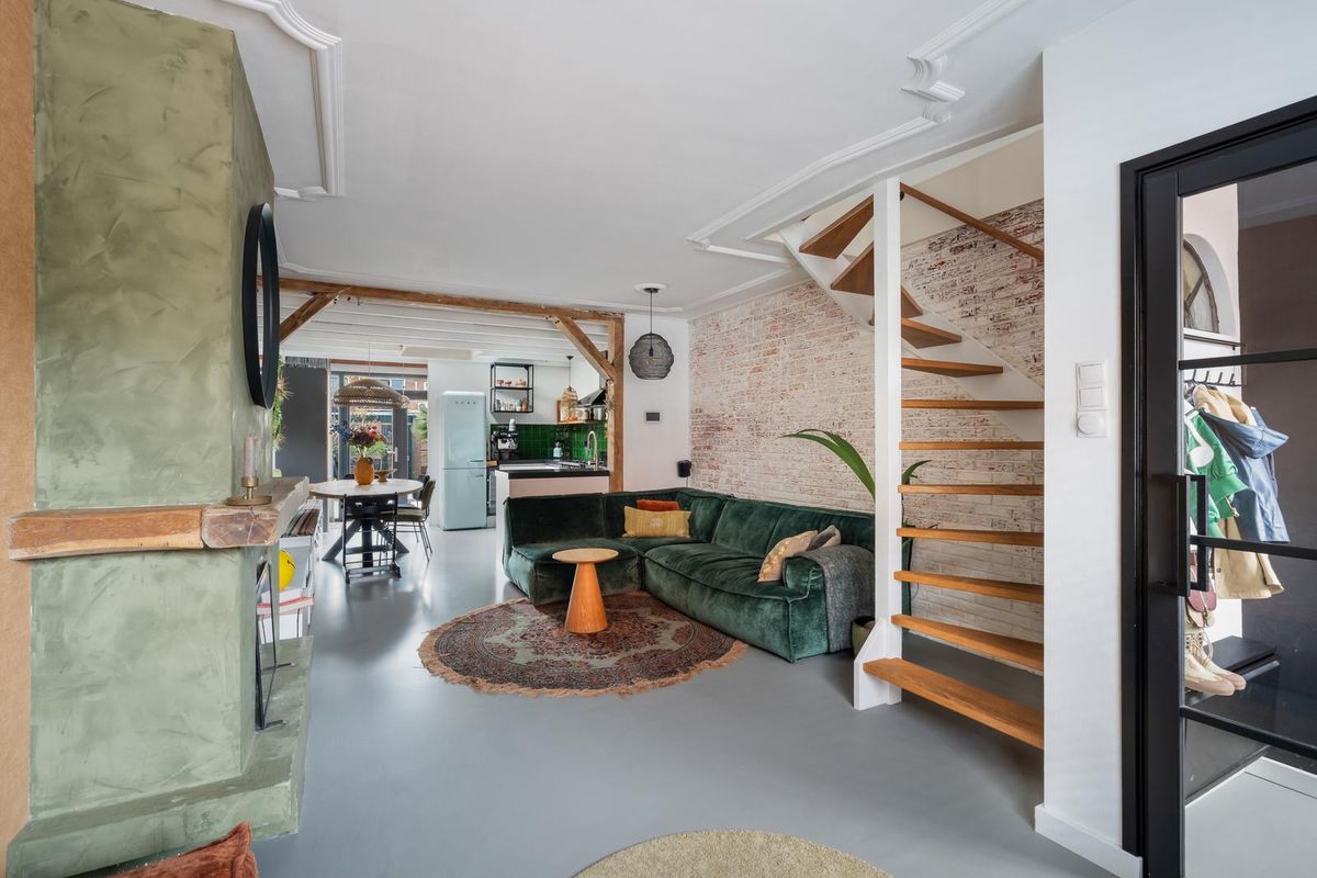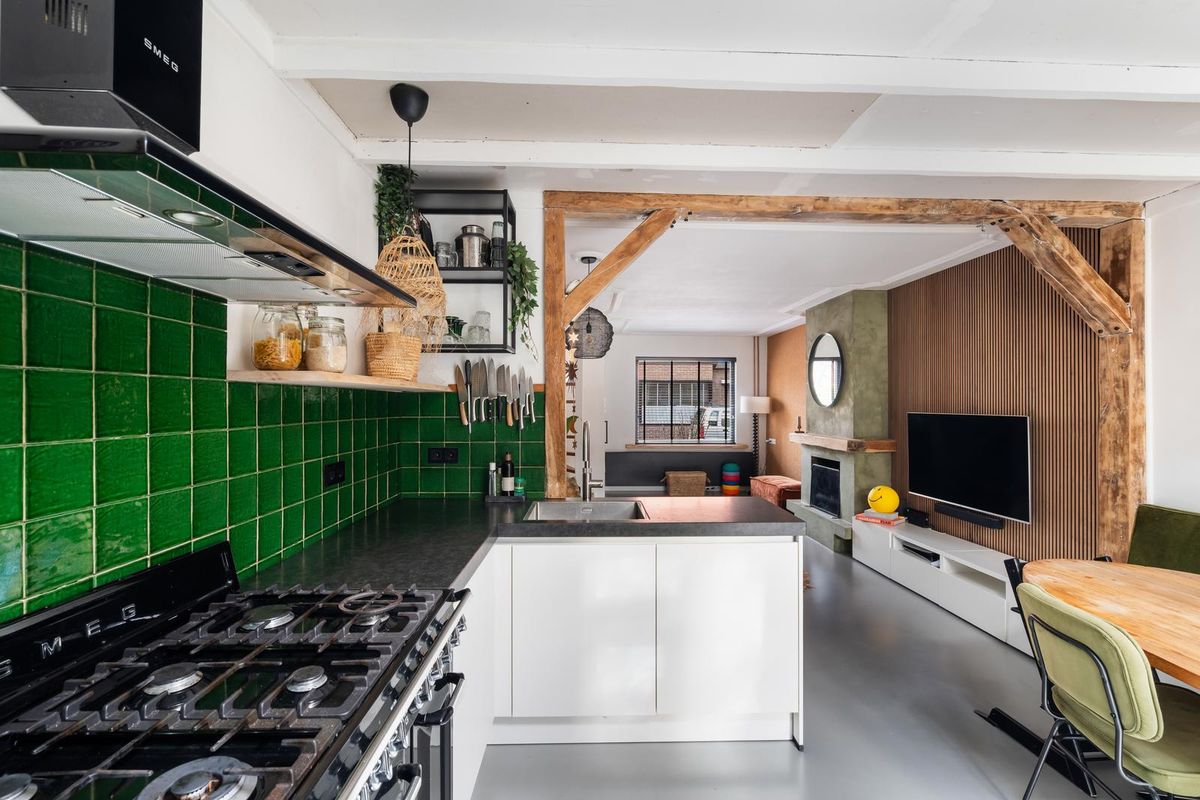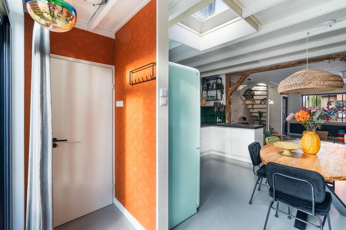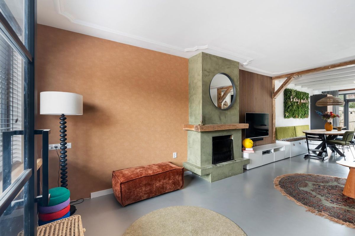 Hal met in 2018 vernieuwde meterkast (met glasvezelaansluiting) en doorgang naar de woonkamer. De gezellige woonkamer heeft veel karakter door de houten sierbalken, kroonlijsten, stenen muur en open haard en is afgewerkt met een onderhoudsvriendelijke gietvloer. In de uitbouw met balkenplafond en lichtkoepel (HR+++ glas) is in 2018 een nieuwe keuken geplaatst. De keuken is voorzien van losse koel-vriescombinatie (Smeg), en verschillende inbouwapparatuur: groot 6-pits gasfornuis met oven en afzuigkap (Smeg), vaatwasmachine en luxe wijnkast. Aan de achterzijde van de woning is een aparte toiletruimte (hangend met fonteintje). Openslaande kunststof deuren geven toegang tot de diepe achtertuin, gelegen op het zonnige zuidwesten. Er is een ruime stenen schuur en een buitenkraan. De tuin is via achterom bereikbaar, er is recht van overpad voor de buren.
