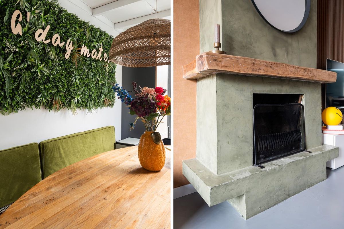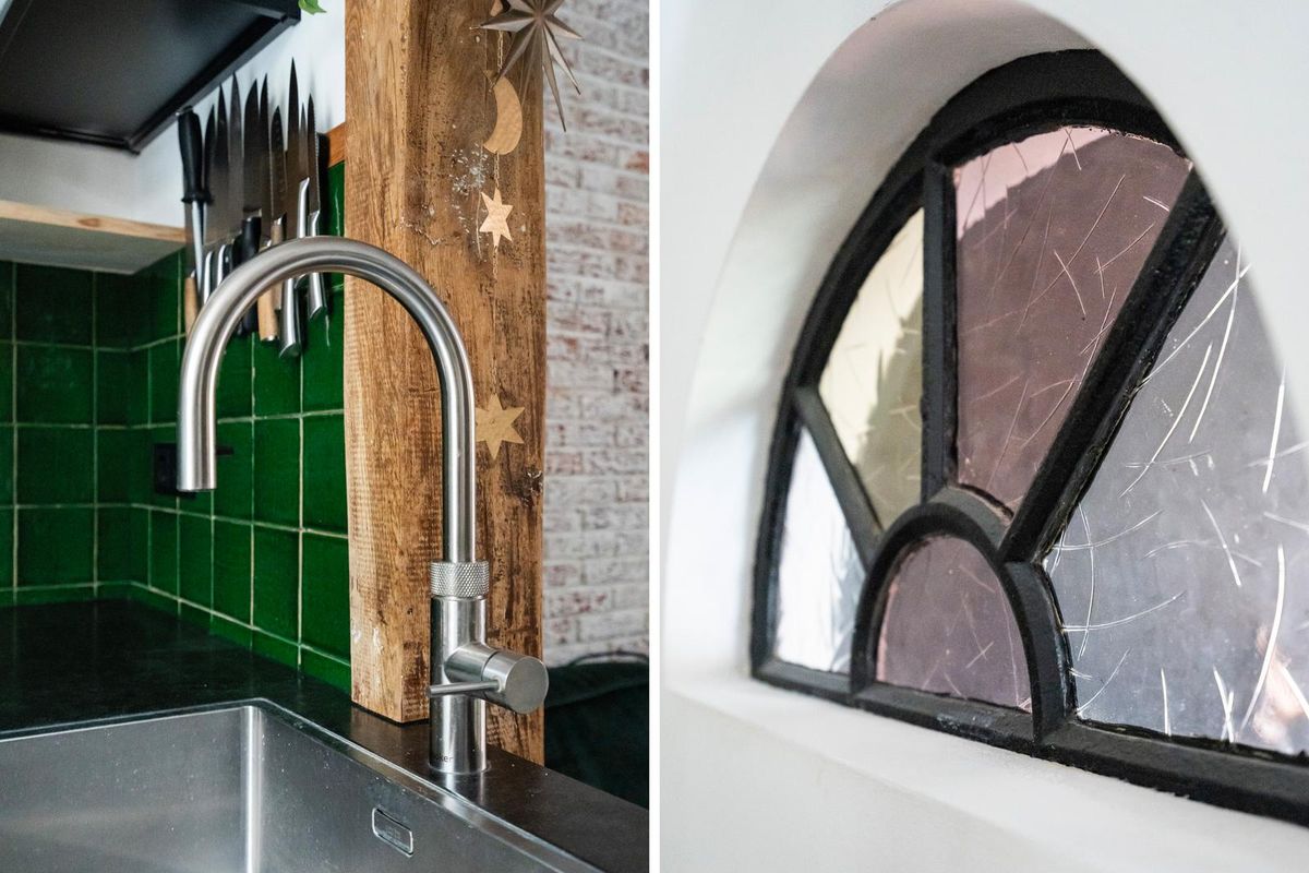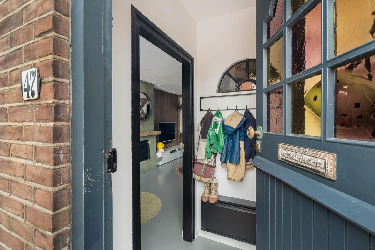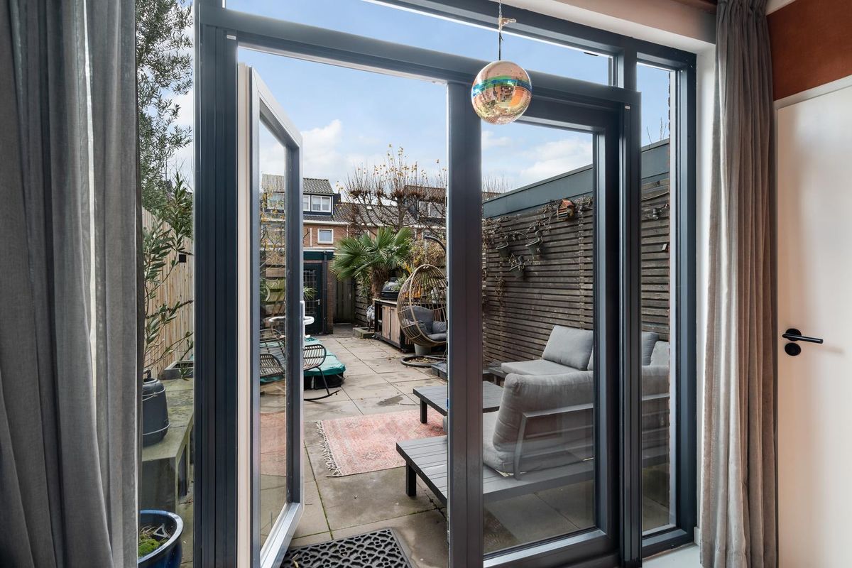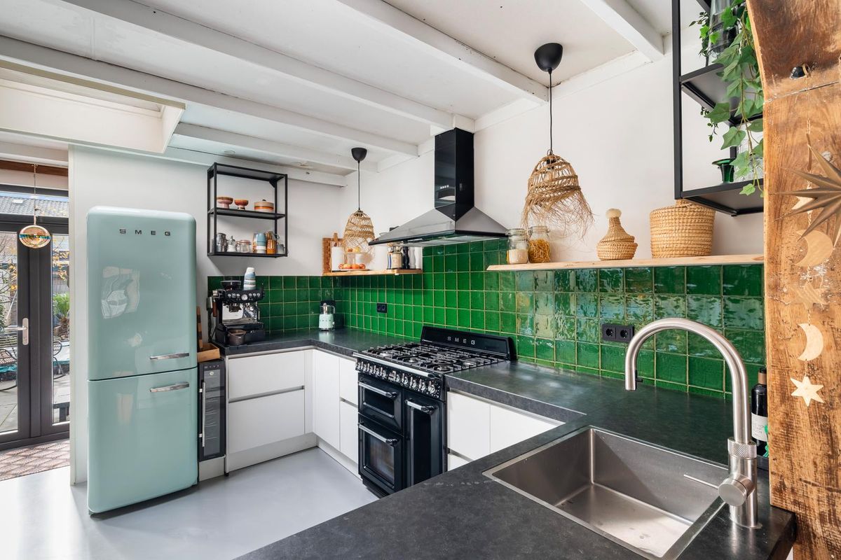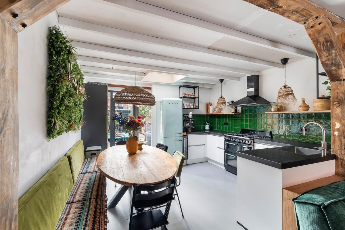 Hal met in 2018 vernieuwde meterkast (met glasvezelaansluiting) en doorgang naar de woonkamer. De gezellige woonkamer heeft veel karakter door de houten sierbalken, kroonlijsten, stenen muur en open haard en is afgewerkt met een onderhoudsvriendelijke gietvloer. In de uitbouw met balkenplafond en lichtkoepel (HR+++ glas) is in 2018 een nieuwe keuken geplaatst. De keuken is voorzien van losse koel-vriescombinatie (Smeg), en verschillende inbouwapparatuur: groot 6-pits gasfornuis met oven en afzuigkap (Smeg), vaatwasmachine en luxe wijnkast. Aan de achterzijde van de woning is een aparte toiletruimte (hangend met fonteintje). Openslaande kunststof deuren geven toegang tot de diepe achtertuin, gelegen op het zonnige zuidwesten. Er is een ruime stenen schuur en een buitenkraan. De tuin is via achterom bereikbaar, er is recht van overpad voor de buren.