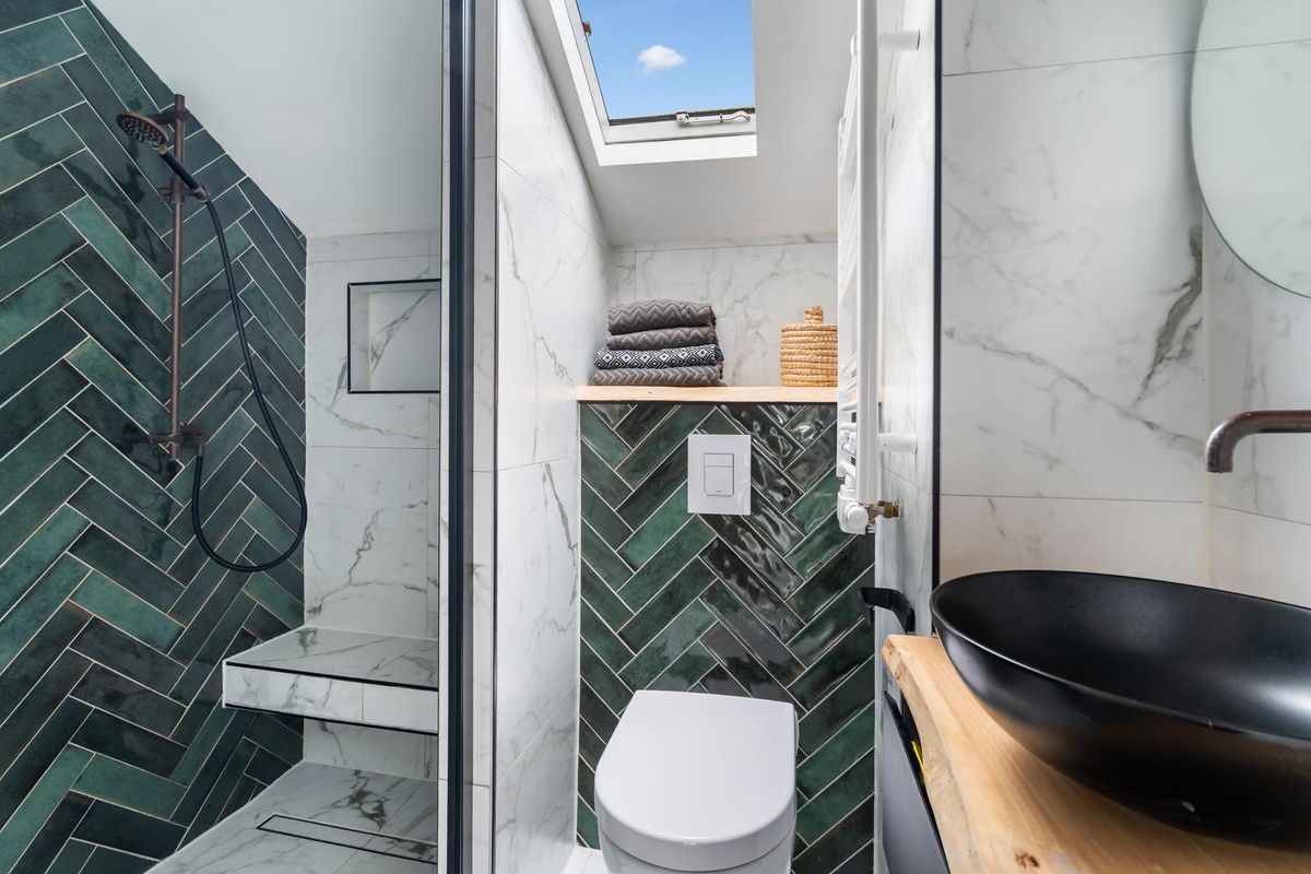 Overloop met toegang tot twee slaapkamers en de badkamer. De slaapkamer aan de achterzijde heeft een vaste kastenwand met aansluiting voor wasmachine en droger en opstelplaats van de CV-ketel (Remeha, 2018). Er is een deur naar het voorbereide dakterras. Aan de voorzijde ligt de in 2023 vernieuwde, modern afgewerkte badkamer. De badkamer is voorzien van een inloopdouche, tweede toilet en waskom met meubel. De tweede slaapkamer ligt ook aan de voorzijde van de woning, heeft een vaste kast en een wastafel. De verdieping is afgewerkt met een laminaatvloer.