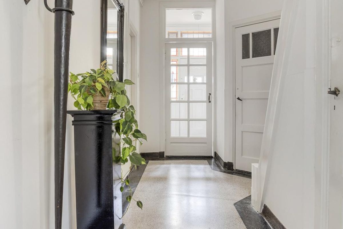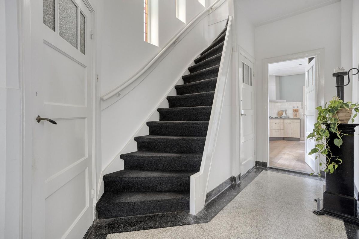 Zodra je de voordeur opent, ervaar je meteen de charme van dit huis. Het tochtportaal met granieten vloer, de klassieke voordeur met glas-in-lood en zelfs de traditionele brievenbus: alles klopt. In de hal vallen direct de hoge plafonds met sierlijsten op, een detail dat je in het hele huis tegenkomt.